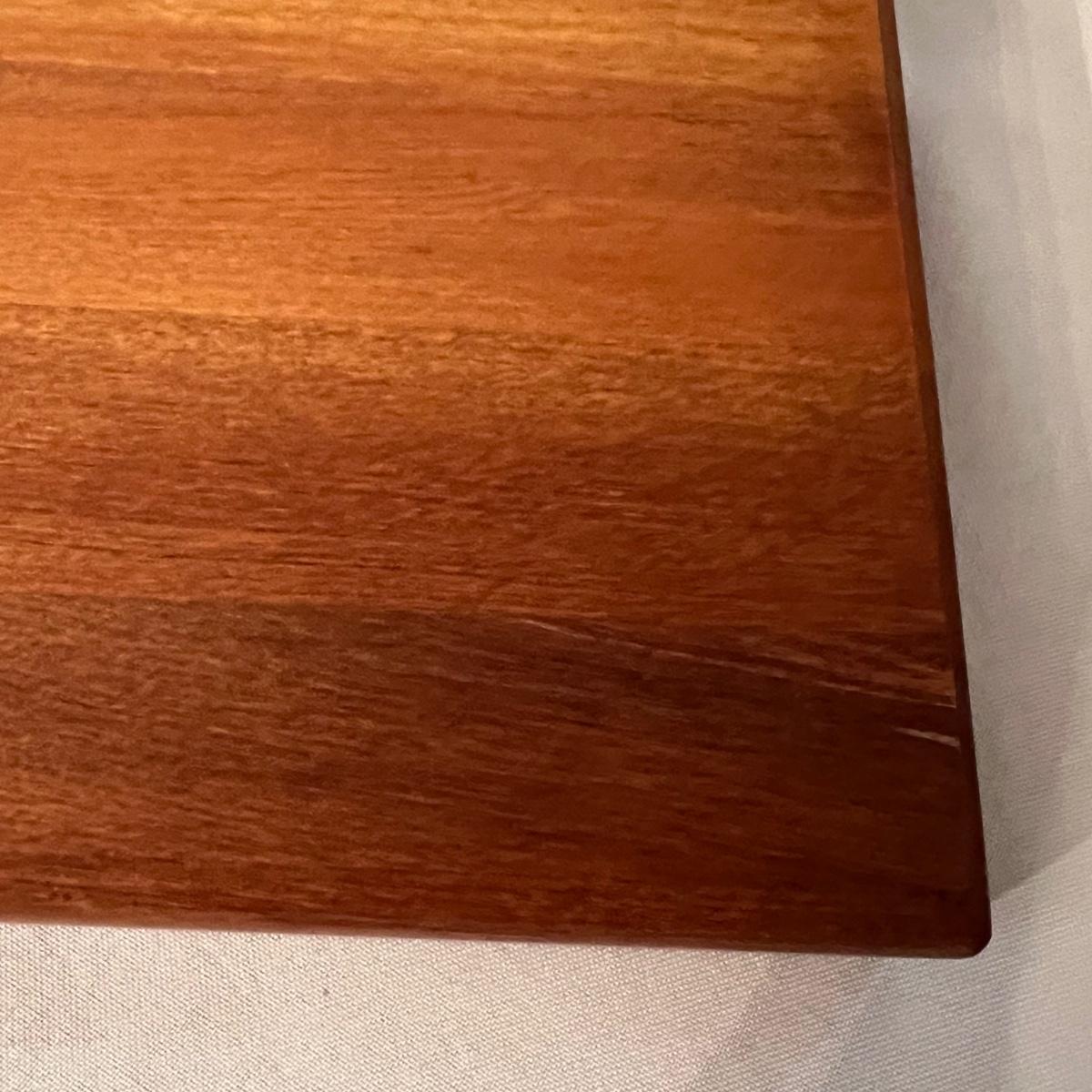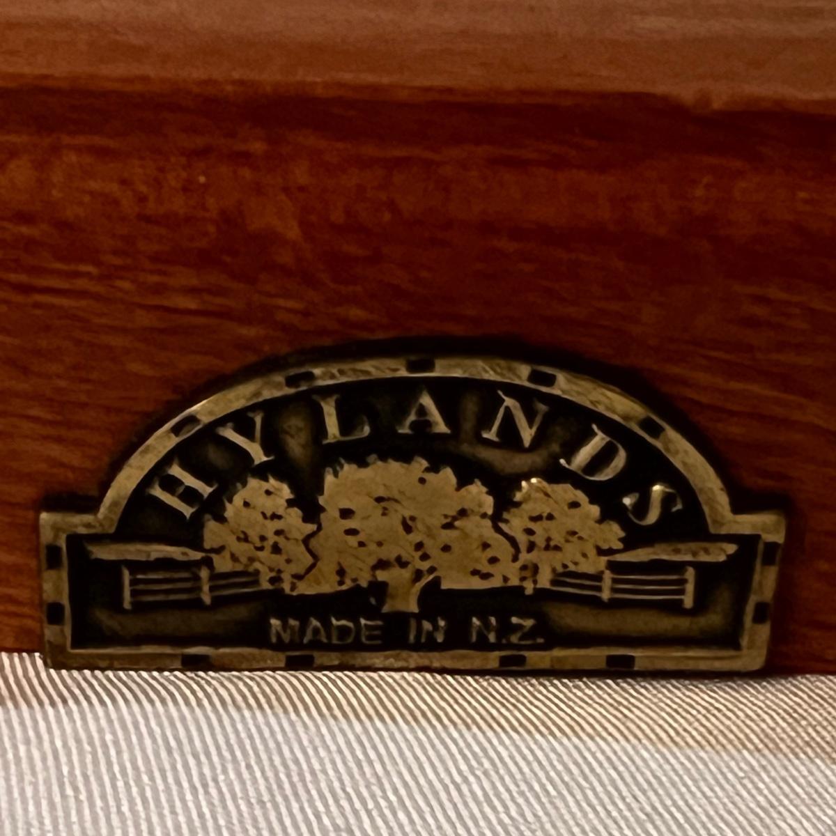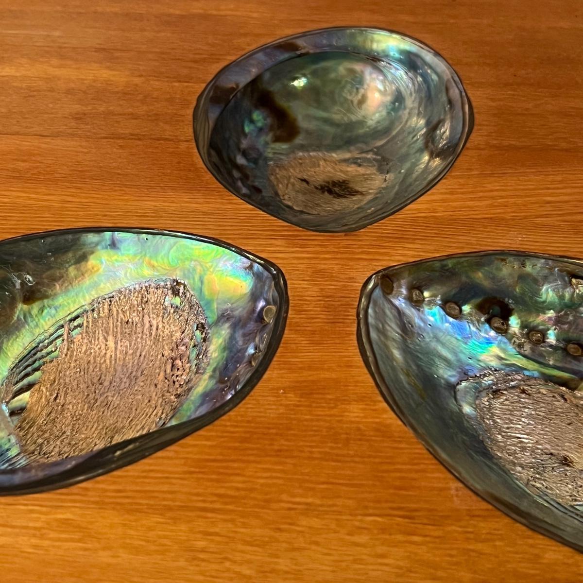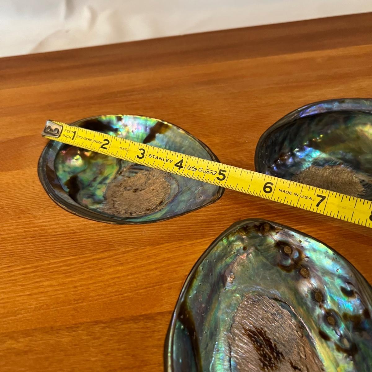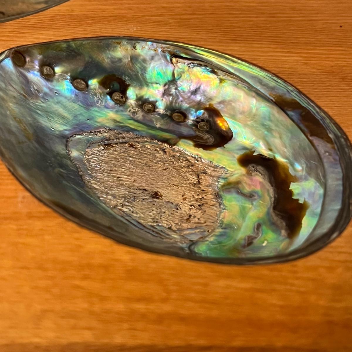 This solid Rimu wood cheeseboard is 1.5” thick and has three Paua shells sunken down into its center. There is a small dark stain shown in images. Board measures 17” x 19.5”.