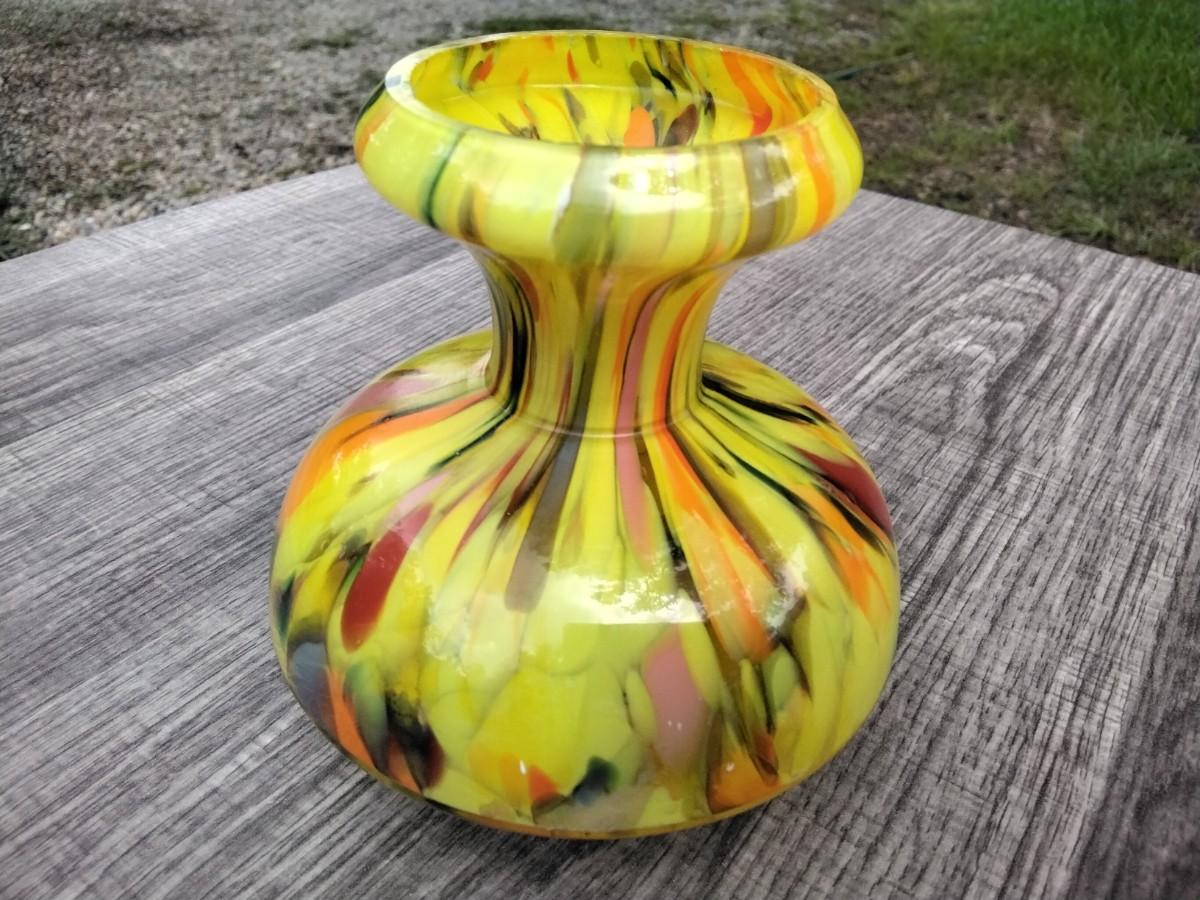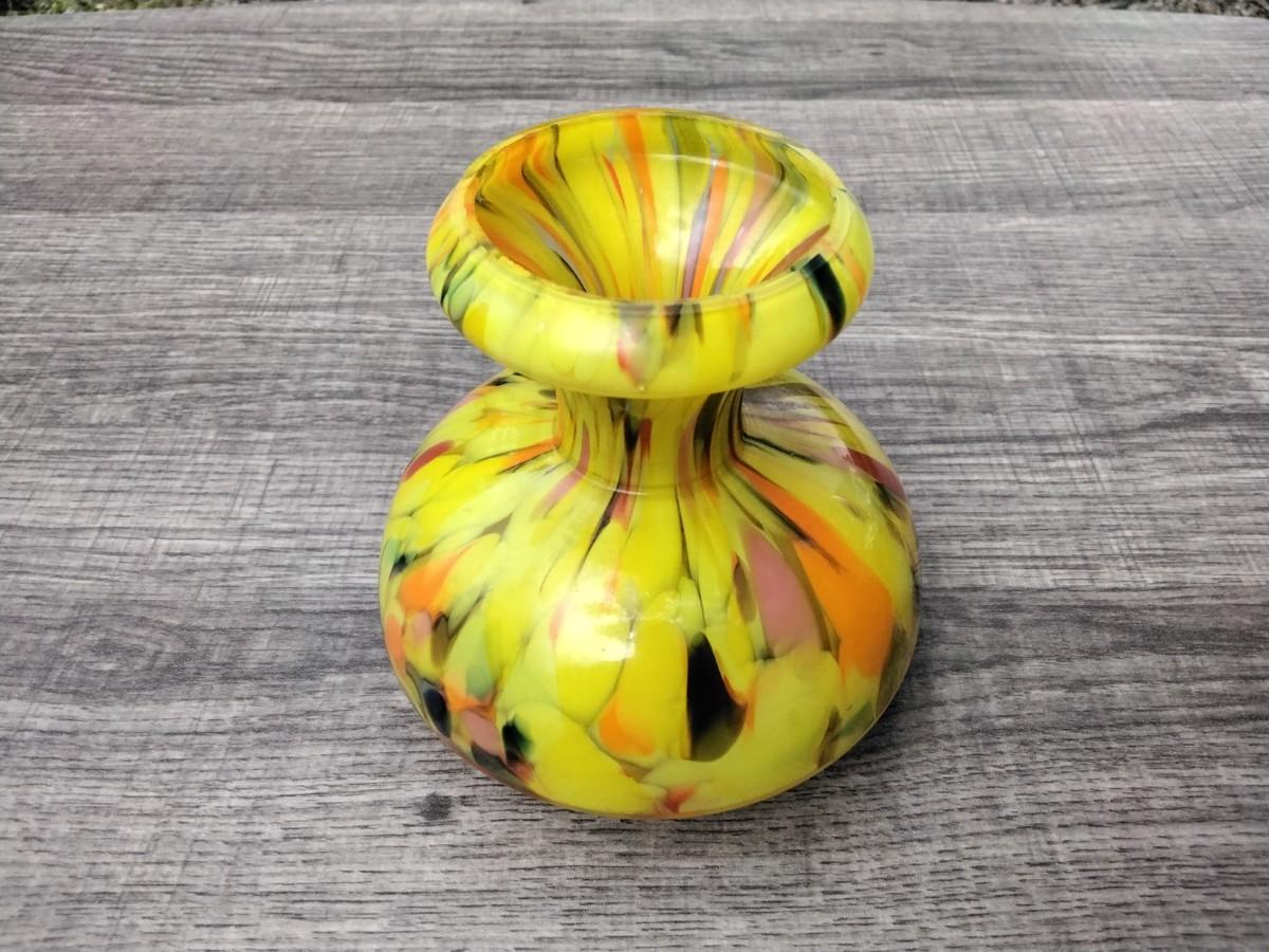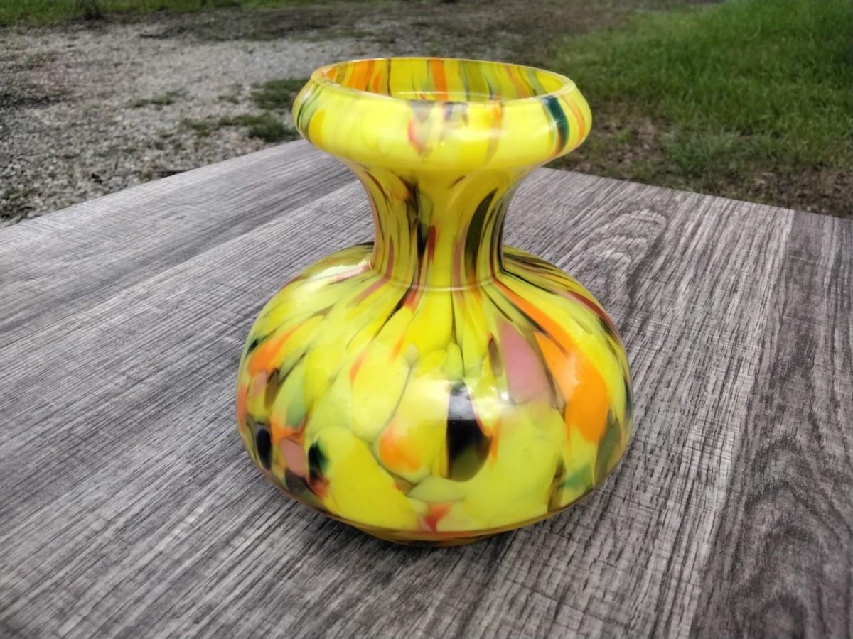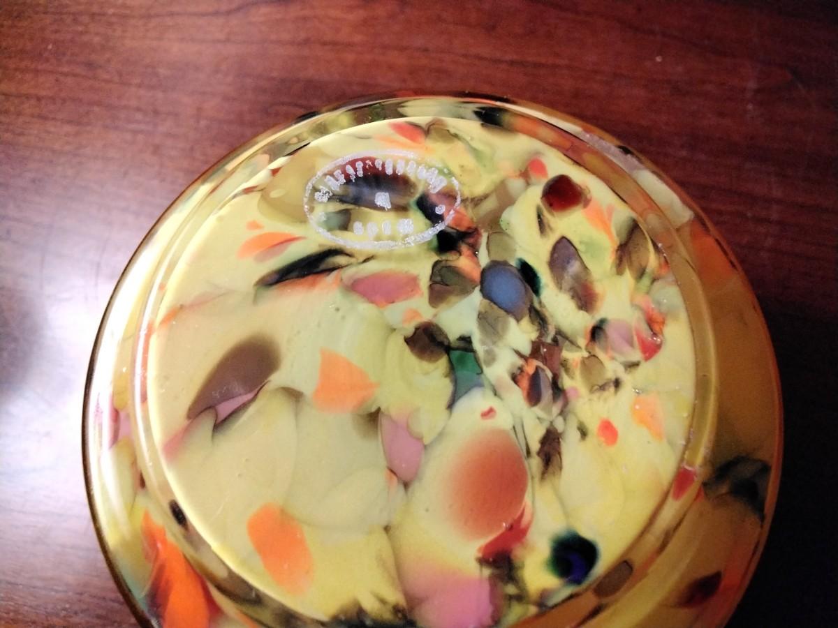 A piece of "Splatter glass" also known as "End of Day" styled glass art made by Rindskopf. Being covered in a mix of hues floating amidst its' yellow primary, this piece is certain to brighten any space it occupies. Marked with a white oval containing 'Made in Czechoslovakia' on the bottom. No Chips, Cracks, or Repairs of any sort. Tier 3.