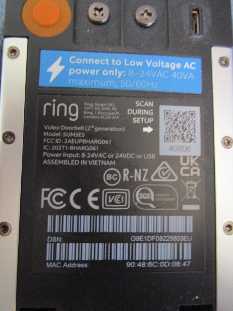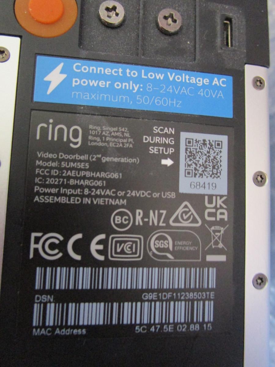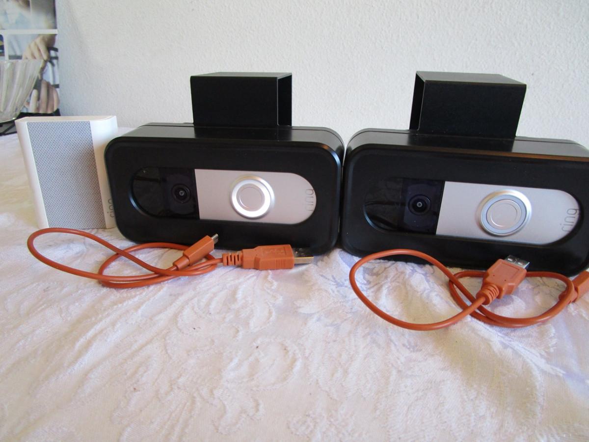 (2) Ring door bells, 2nd generation model #5UM5E5; with cords, inside doorbell, and brackets to hang over the door