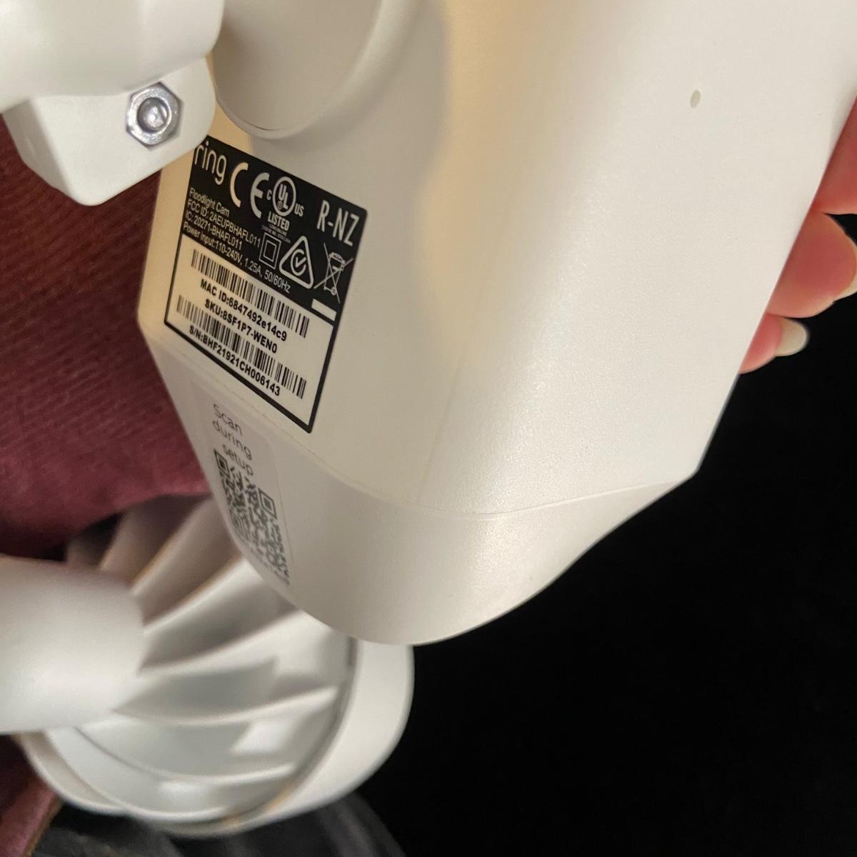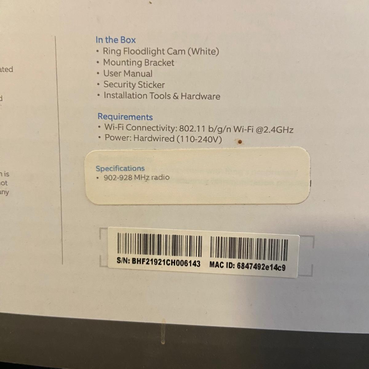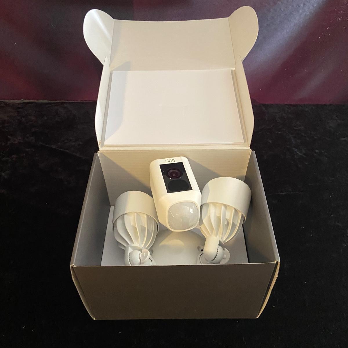 This lot contains a Ring Floodlight Cam. This item comes in its original box with its instruction manual, setup steps, a mounting piece, and installation kit. The camera itself has adjustable floodlights on either side and what appears to be a light on the bottom. See pictures for serial number. Shipping available.