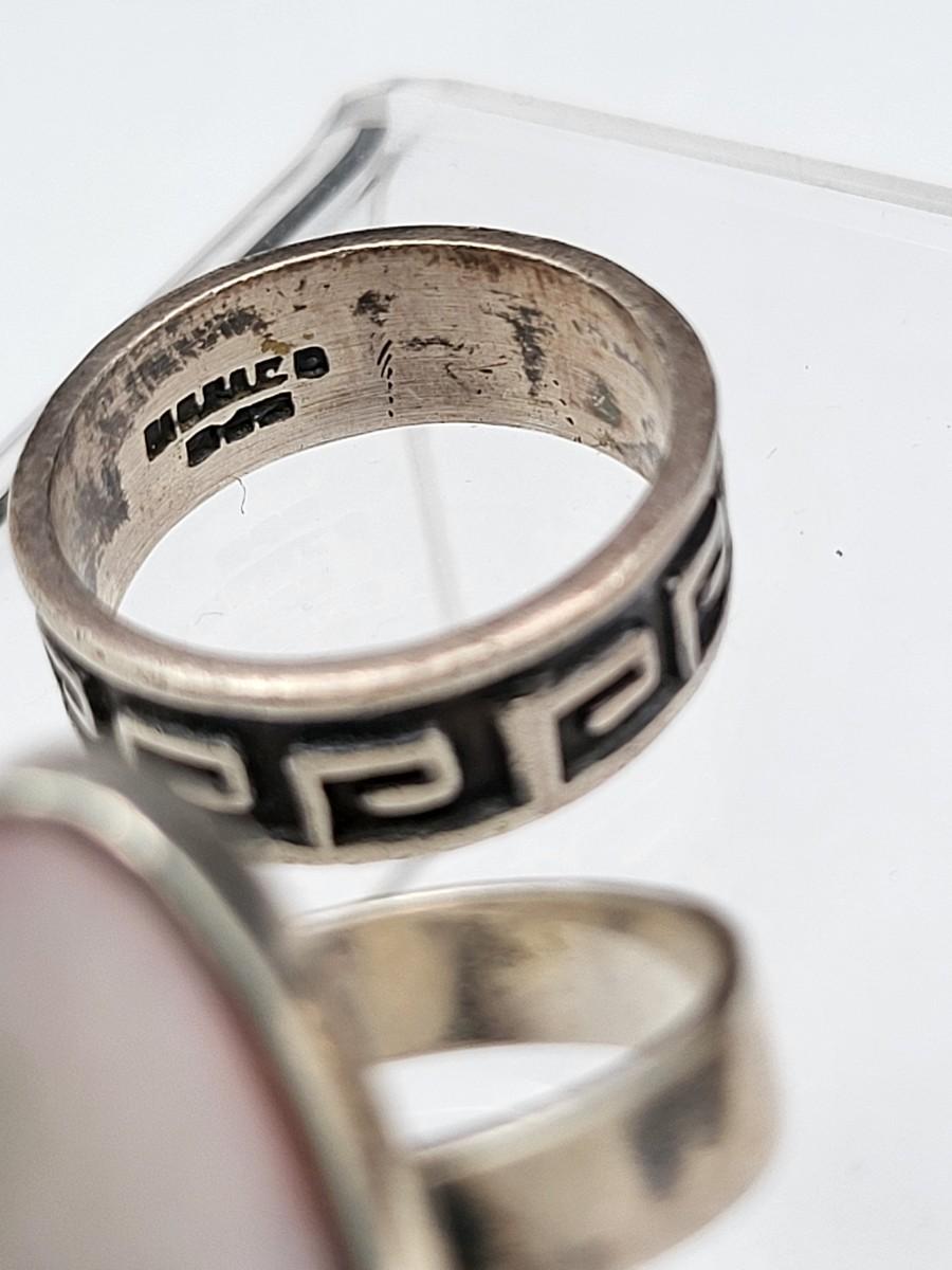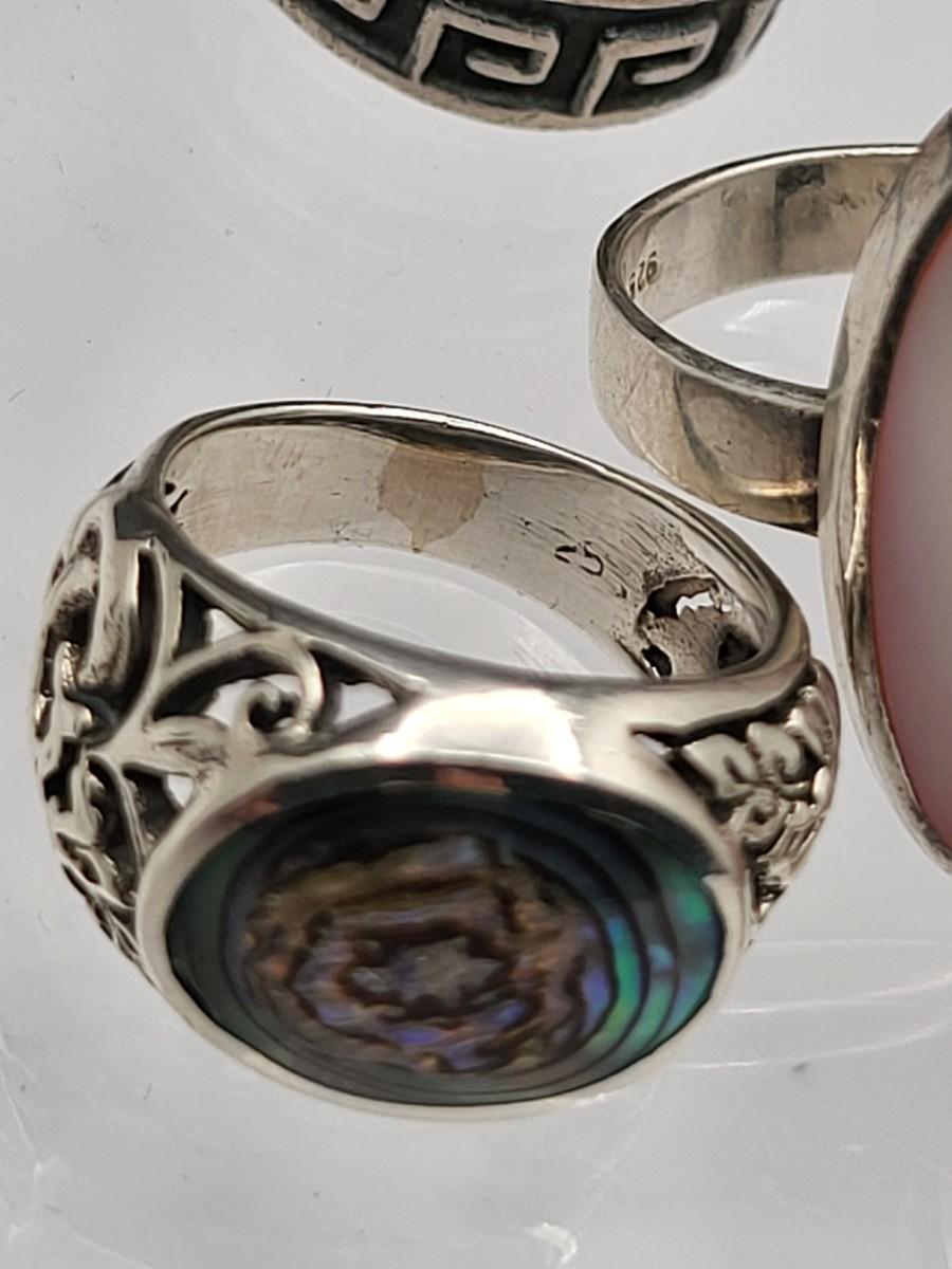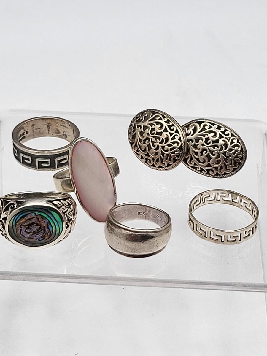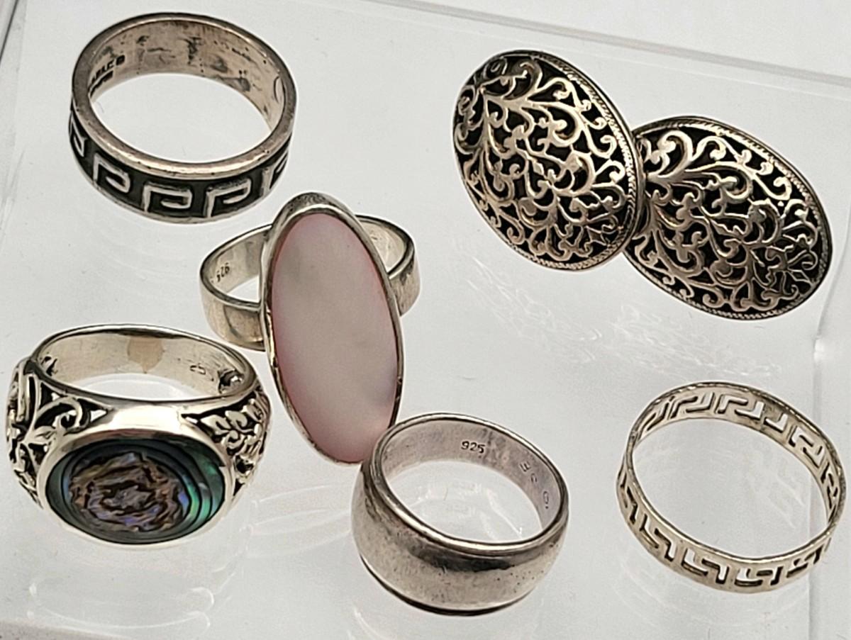 Abalone with open scroll shank size 5. Oblong MOP ring size 5. Two Greek keys (one with black enamel and one with open work), size 6. Tiny 925 band, size 3. Scroll work oval earrings 925, pierced, 1" x .5". Total weight is 28.2 grams