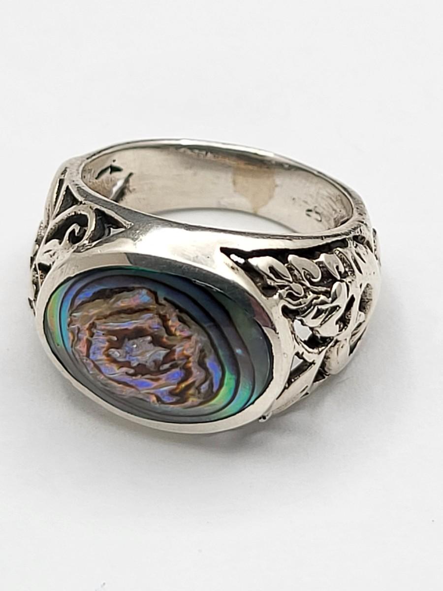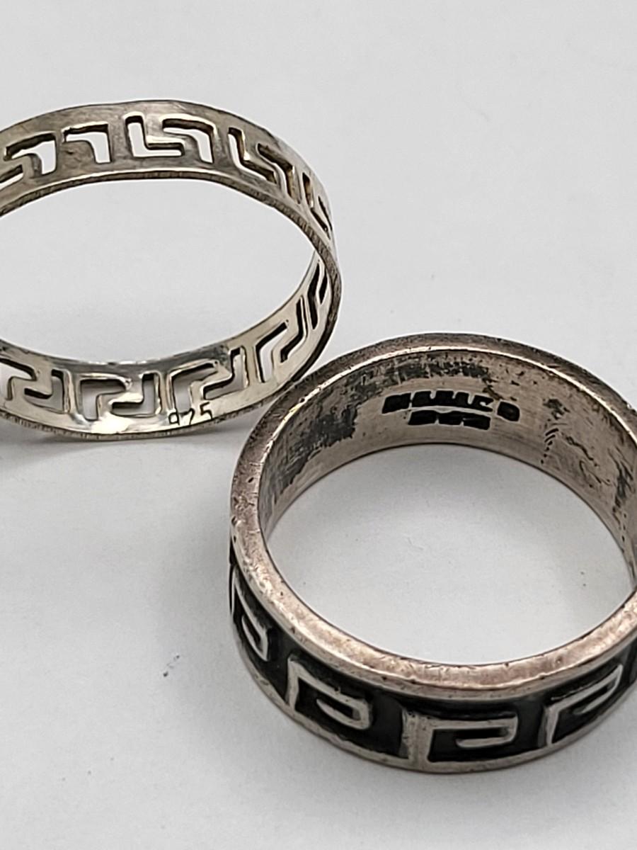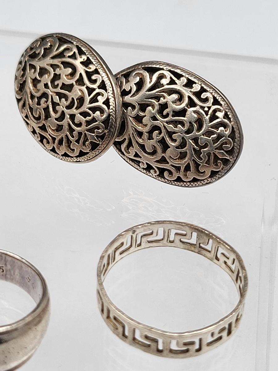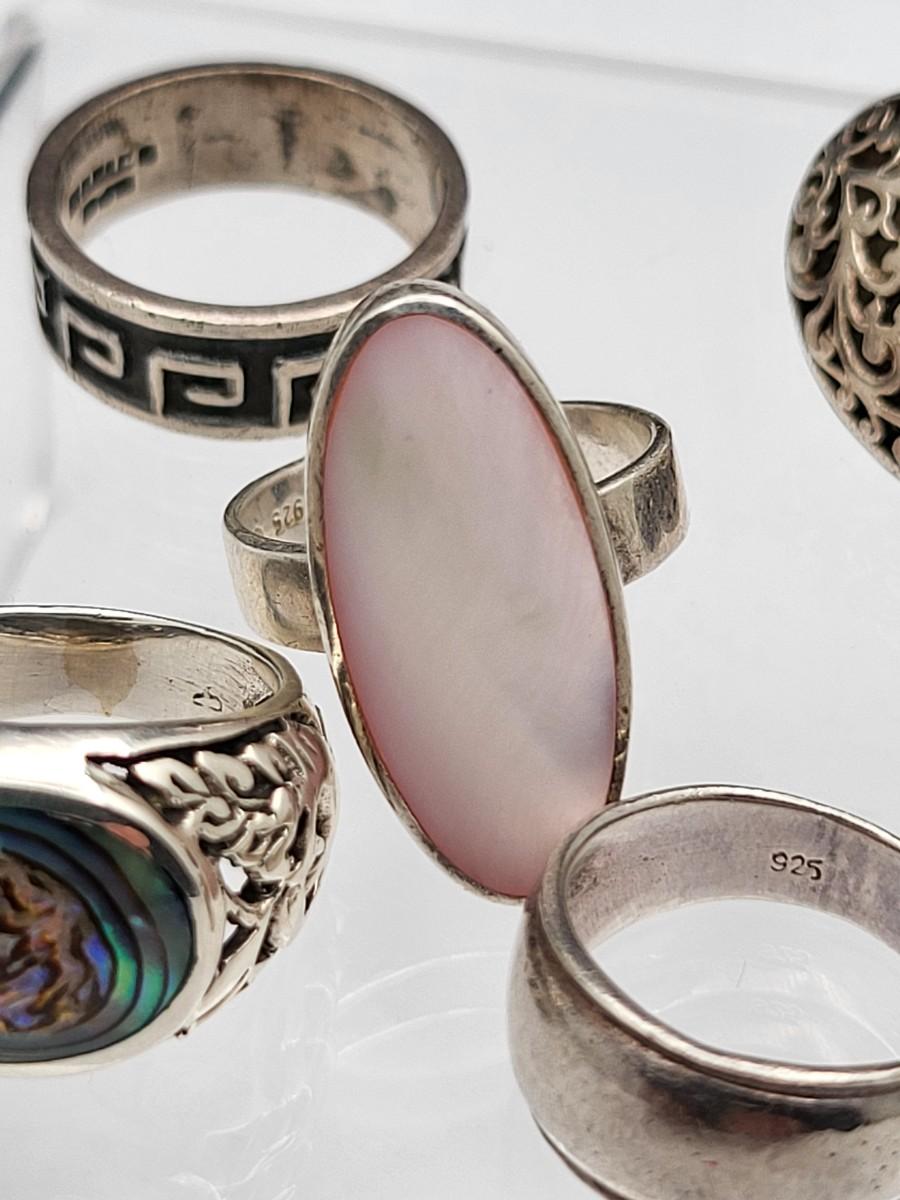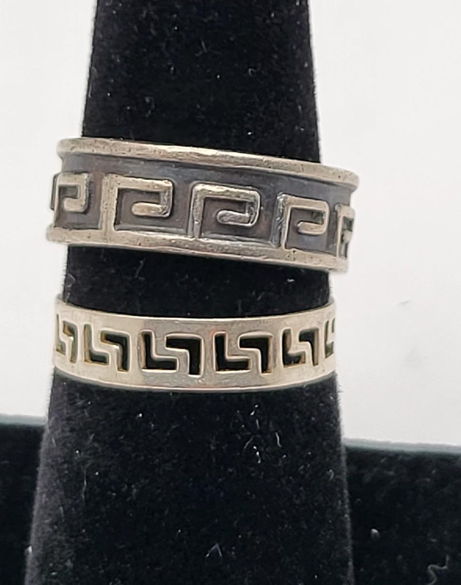 Abalone with open scroll shank size 5. Oblong MOP ring size 5. Two Greek keys (one with black enamel and one with open work), size 6. Tiny 925 band, size 3. Scroll work oval earrings 925, pierced, 1" x .5". Total weight is 28.2 grams