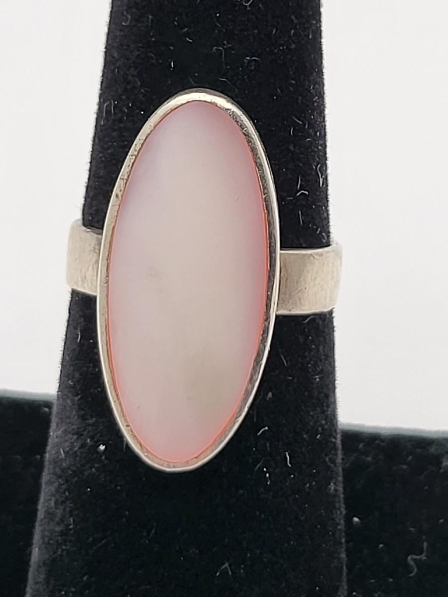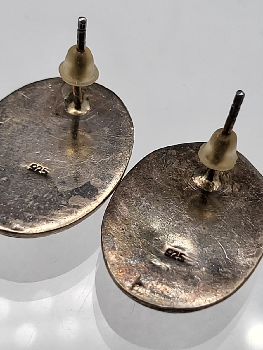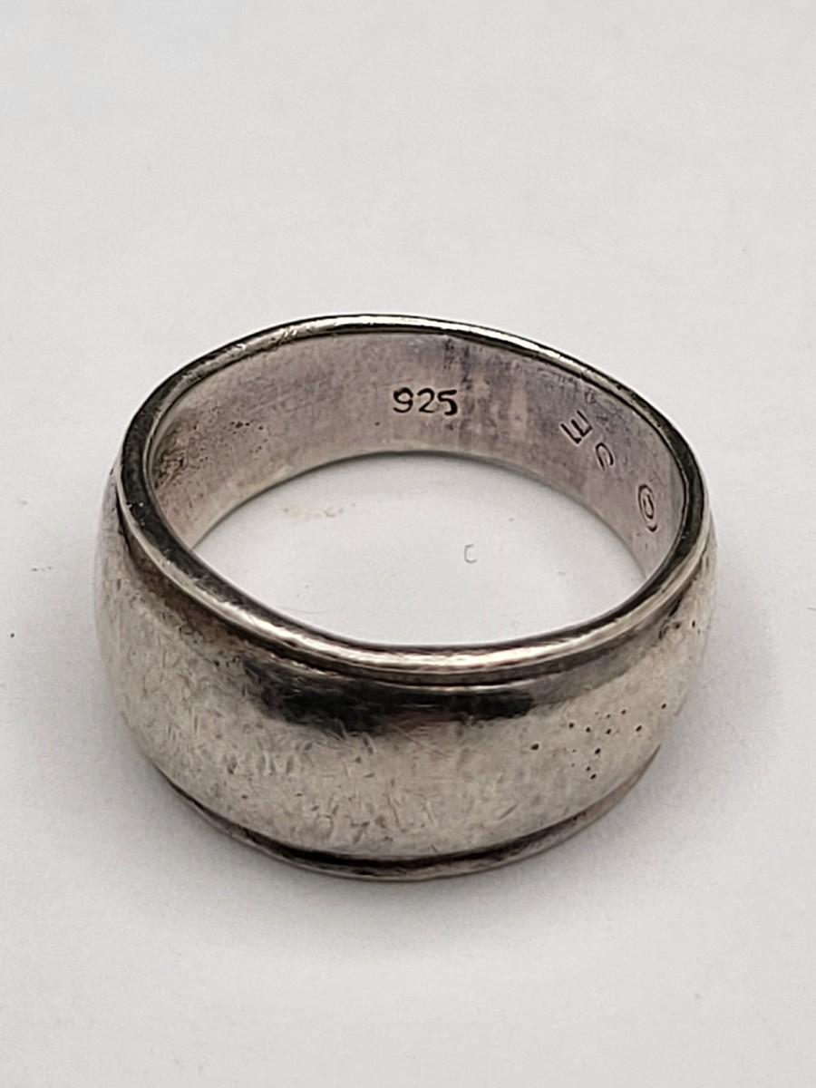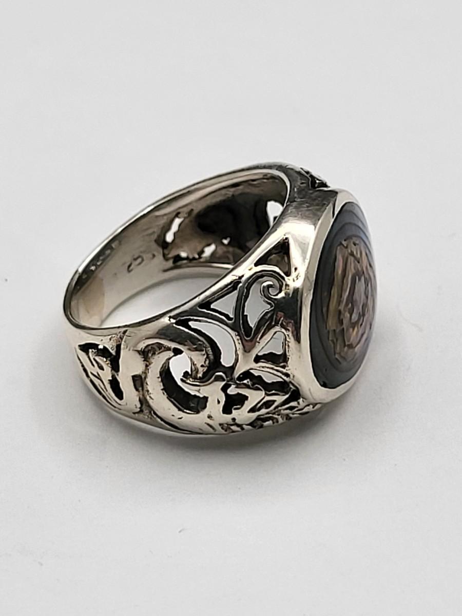 Abalone with open scroll shank size 5. Oblong MOP ring size 5. Two Greek keys (one with black enamel and one with open work), size 6. Tiny 925 band, size 3. Scroll work oval earrings 925, pierced, 1" x .5". Total weight is 28.2 grams
