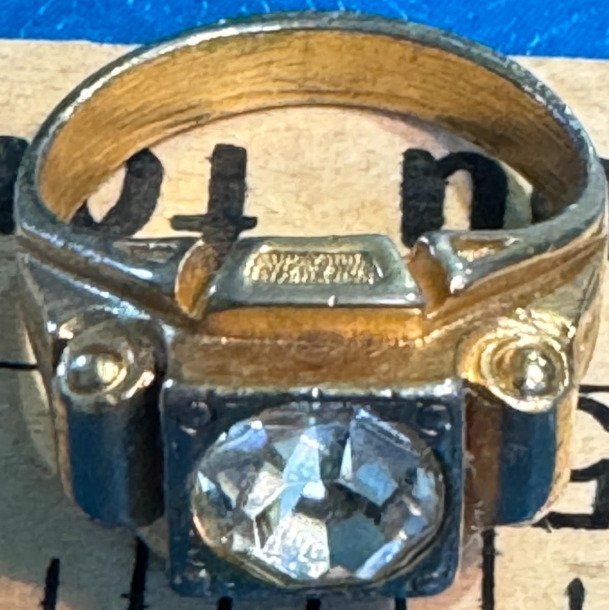 vintage gold-toned metal ring featuring a large, clear central rhinestone and possibly smaller rhinestones or decorative elements on the sides. The ring appears to be a statement or cocktail ring due to its prominent design.