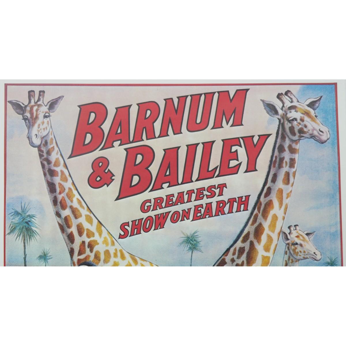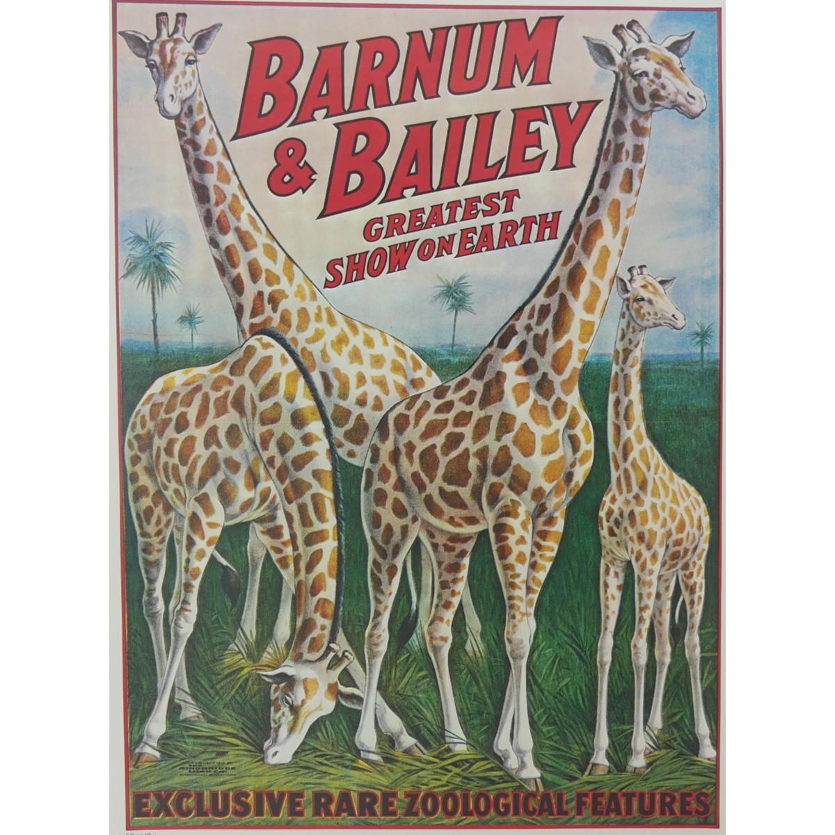 Vintage reproduction Ringling Bros and Barnum & Bailey combined shows circus poster. Image multiple giraffes. Poster is in excellent condition overall. minor fraying around edges. No major rips, tears, or issues. Measures L 36" x H 24". This will be rolled for shipment. (C48)