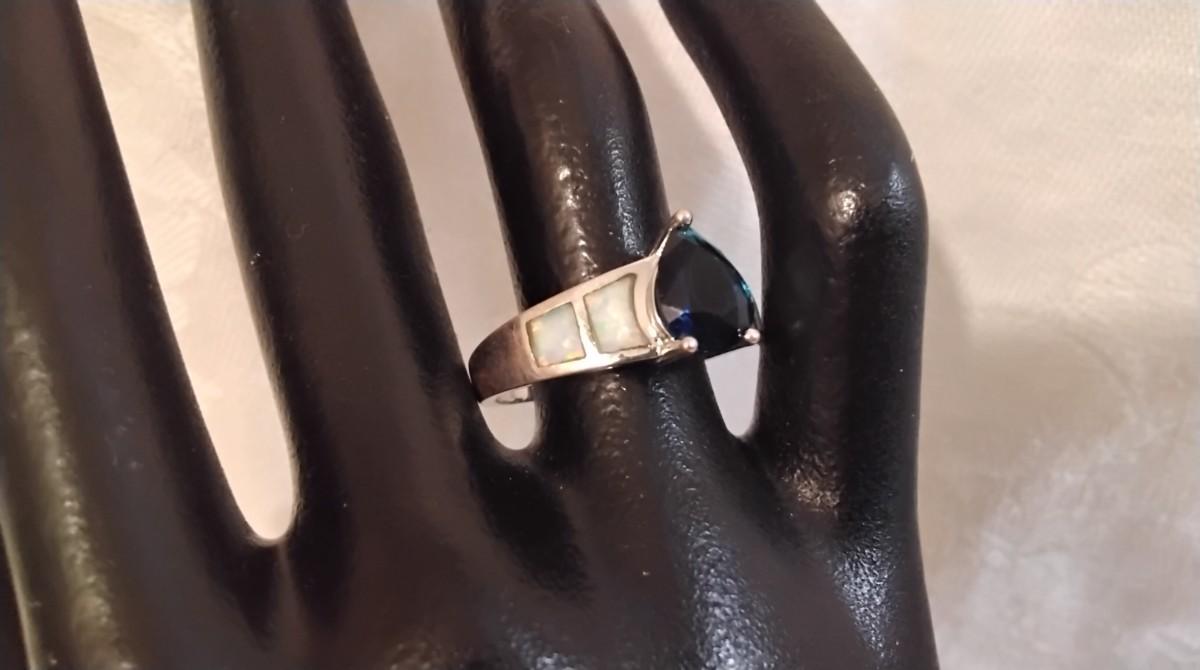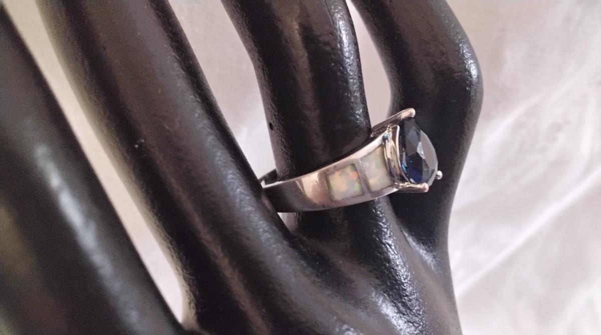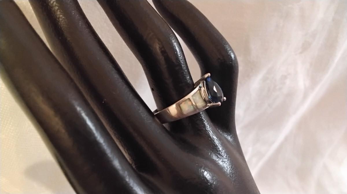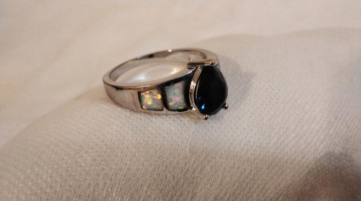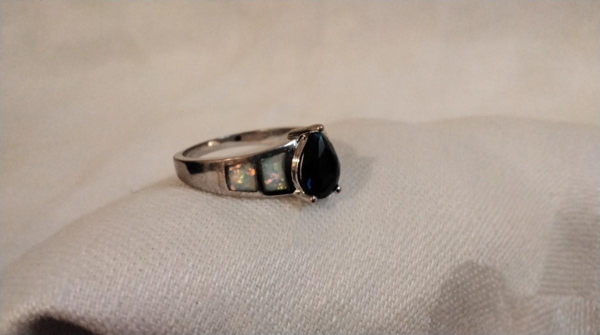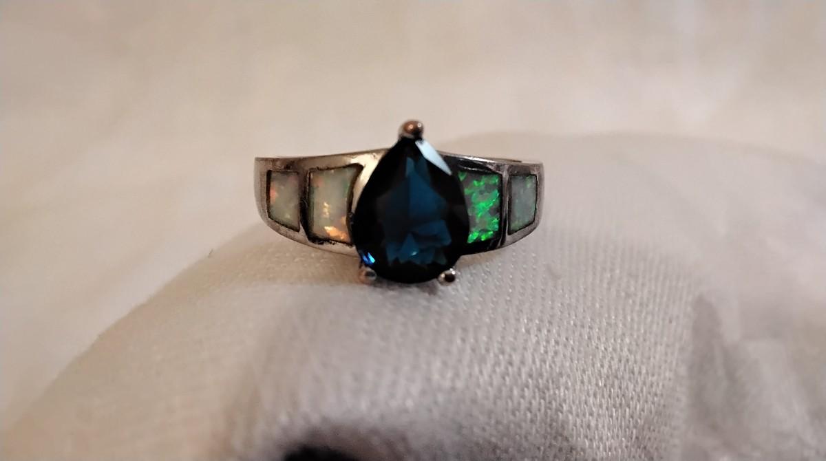 This teardrop sapphire is perfect and the opals on side only serve to accent this beauty. In all this is one stunning ring!