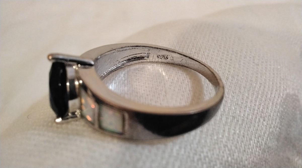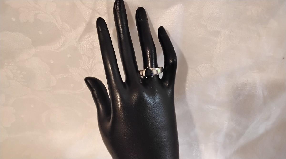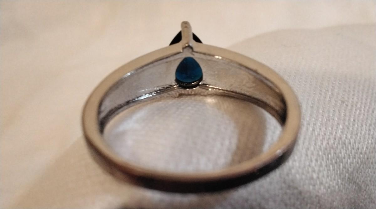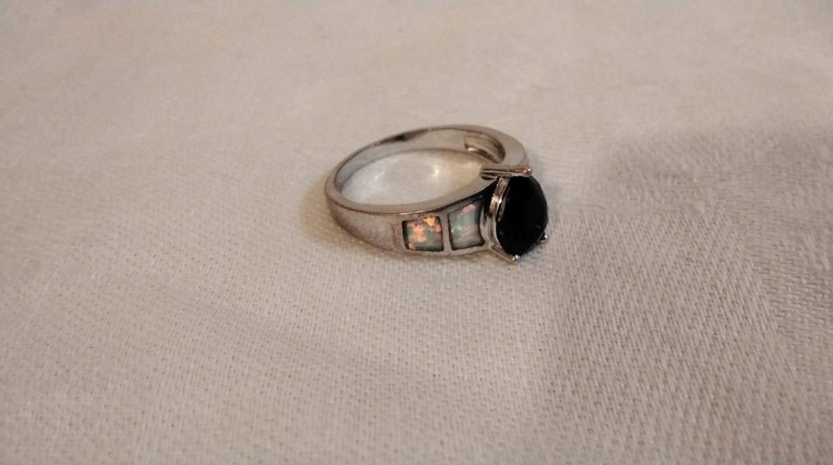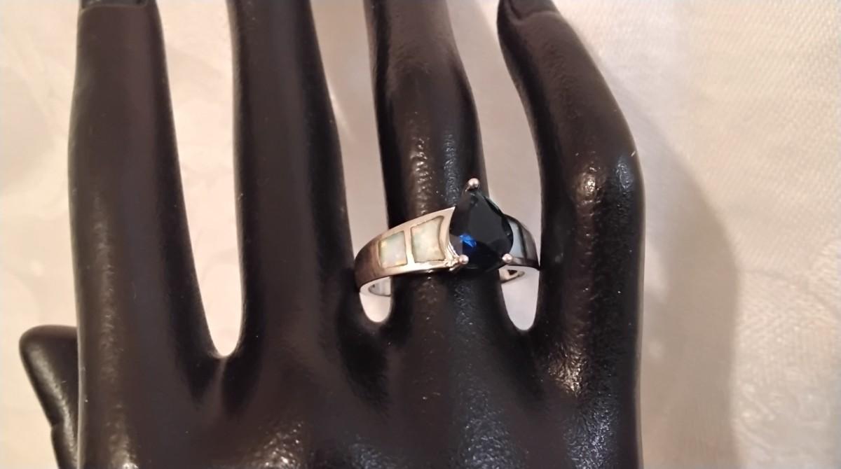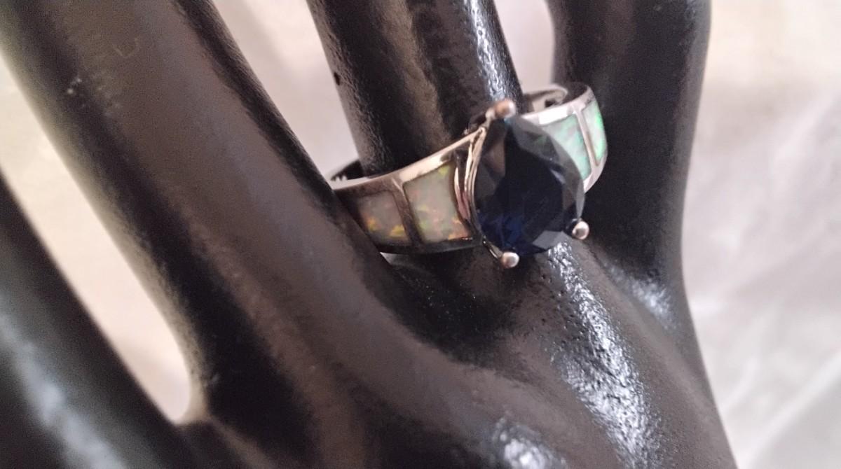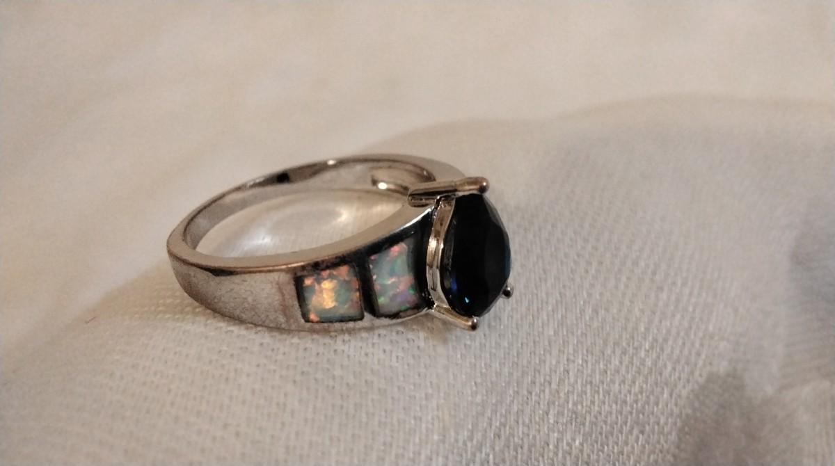 This teardrop sapphire is perfect and the opals on side only serve to accent this beauty. In all this is one stunning ring!