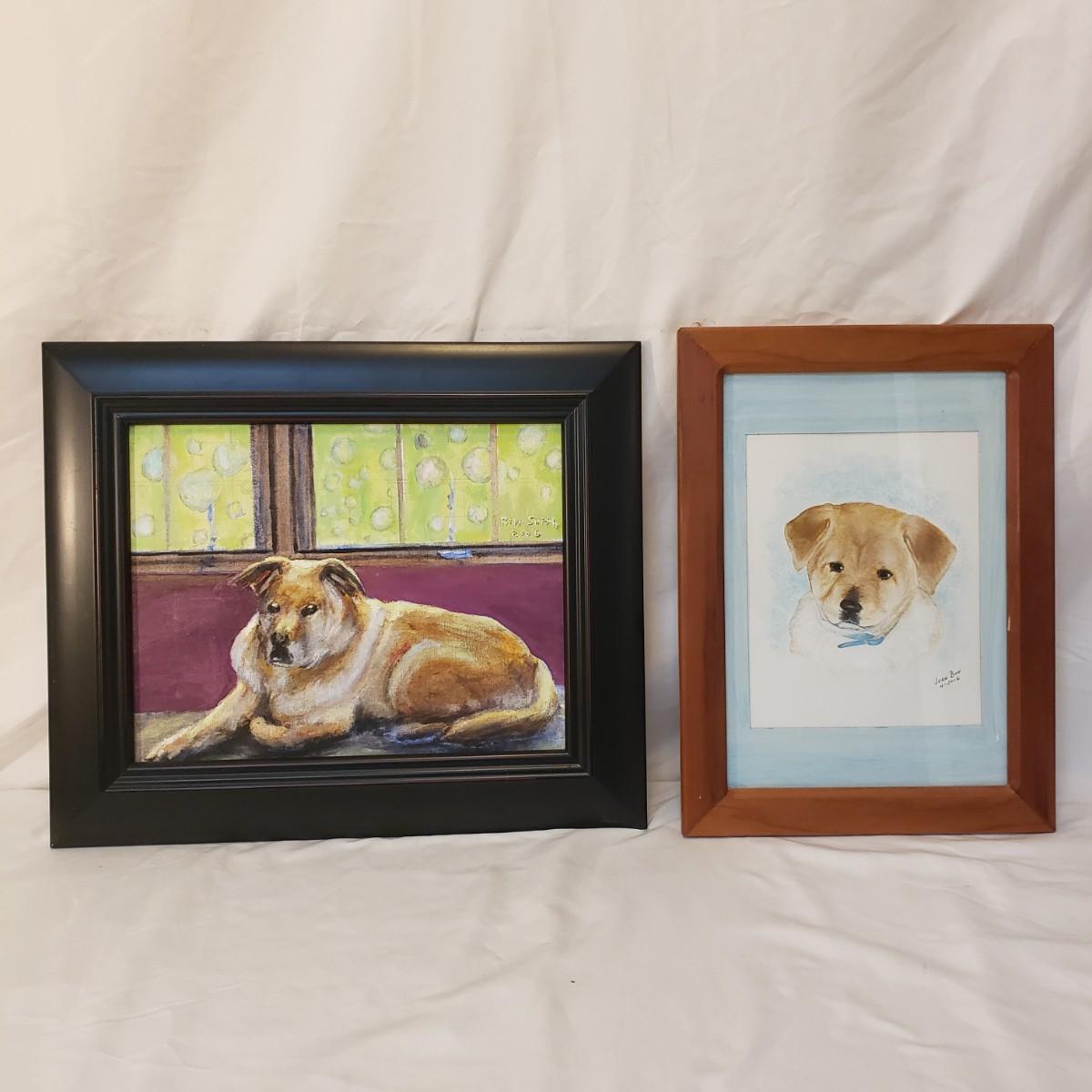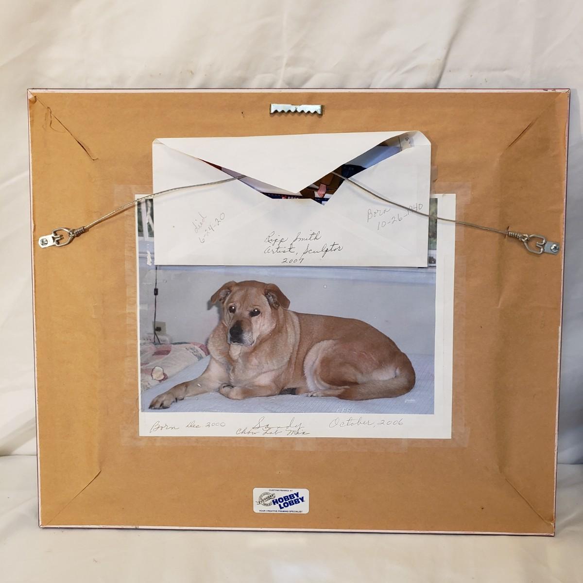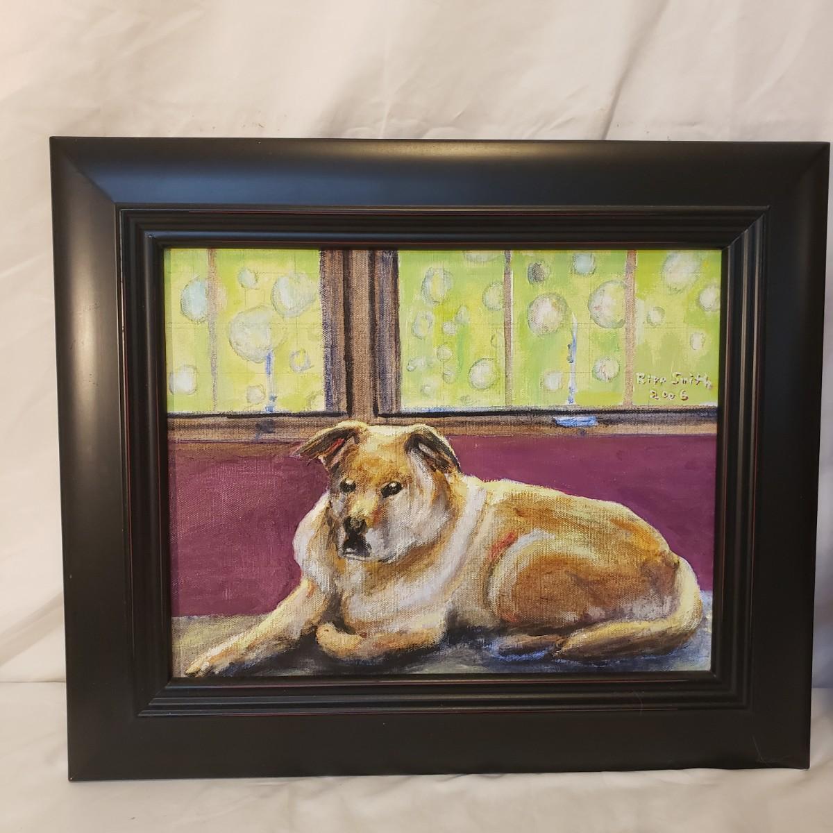This lot features local artist Ripp Smith's painted rendition of "Sandy". The painting is framed with a black wood frame with a hint of red stripes (18" x 16"), see picture for details. The same dog is featured in Jean Bow's rendition when Sandy was a puppy. This painting is encased in a handmade wood frame measuring 12" x 16". There are original pictures and information about Ripp Smith in the envelope on the back of the frame.