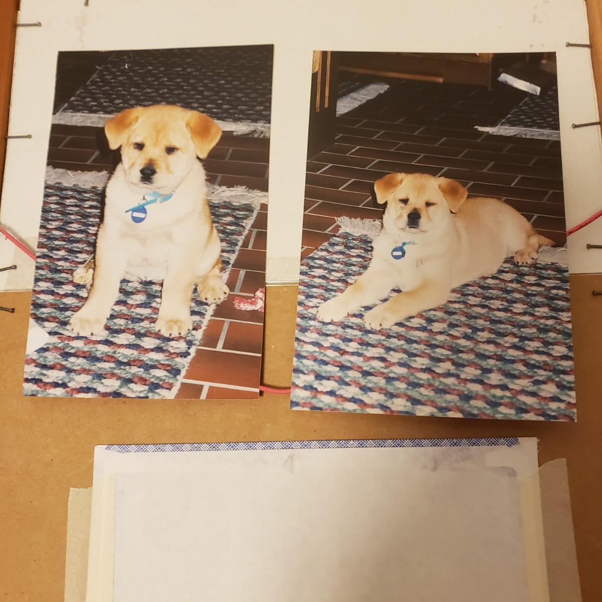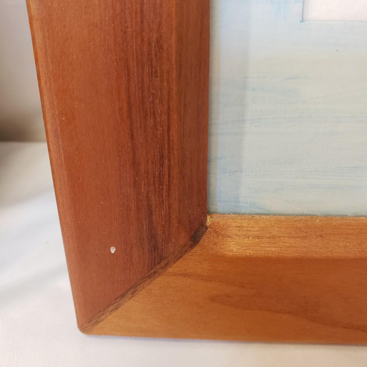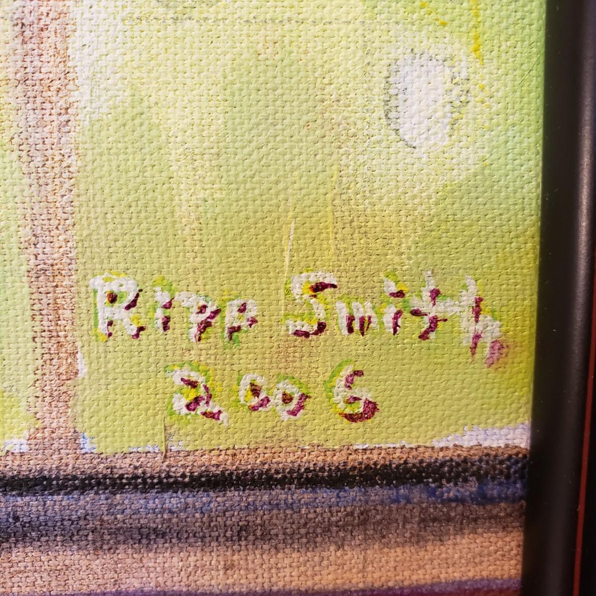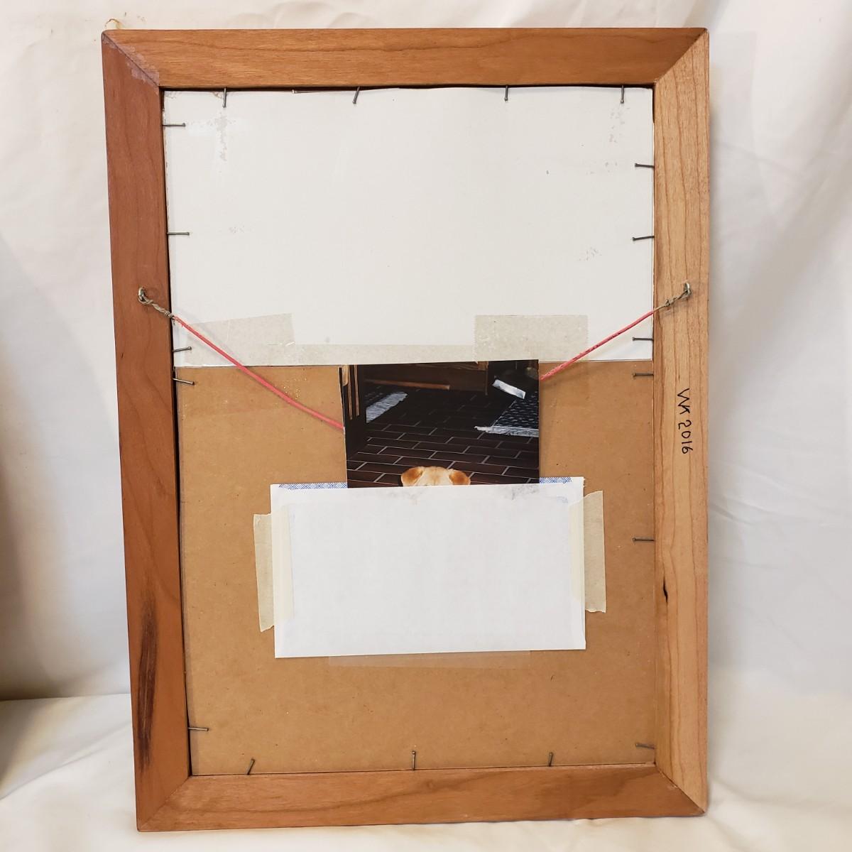 This lot features local artist Ripp Smith's painted rendition of "Sandy". The painting is framed with a black wood frame with a hint of red stripes (18" x 16"), see picture for details. The same dog is featured in Jean Bow's rendition when Sandy was a puppy. This painting is encased in a handmade wood frame measuring 12" x 16". There are original pictures and information about Ripp Smith in the envelope on the back of the frame.