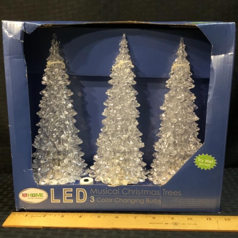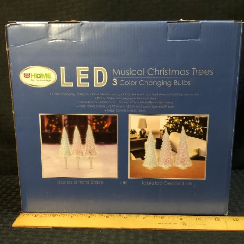 Up for auction is a boxed set of 3 light-up LED musical Christmas trees. Item is brand new in its original box and has not been opened. The box has some wear from storage; see pictures.
