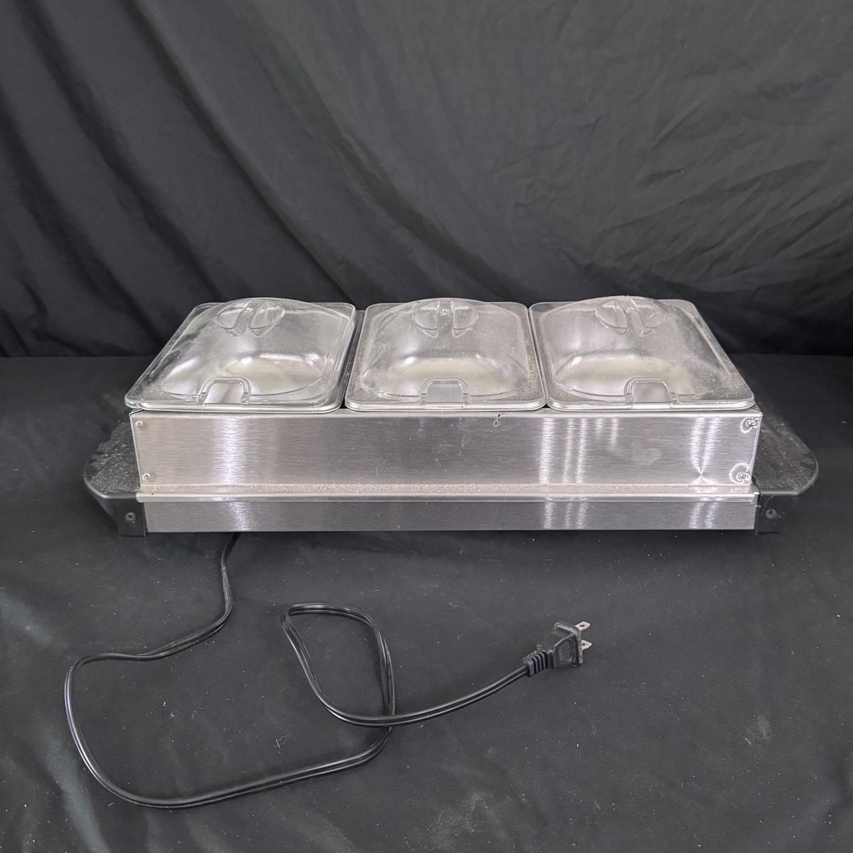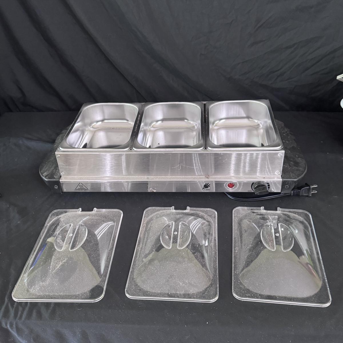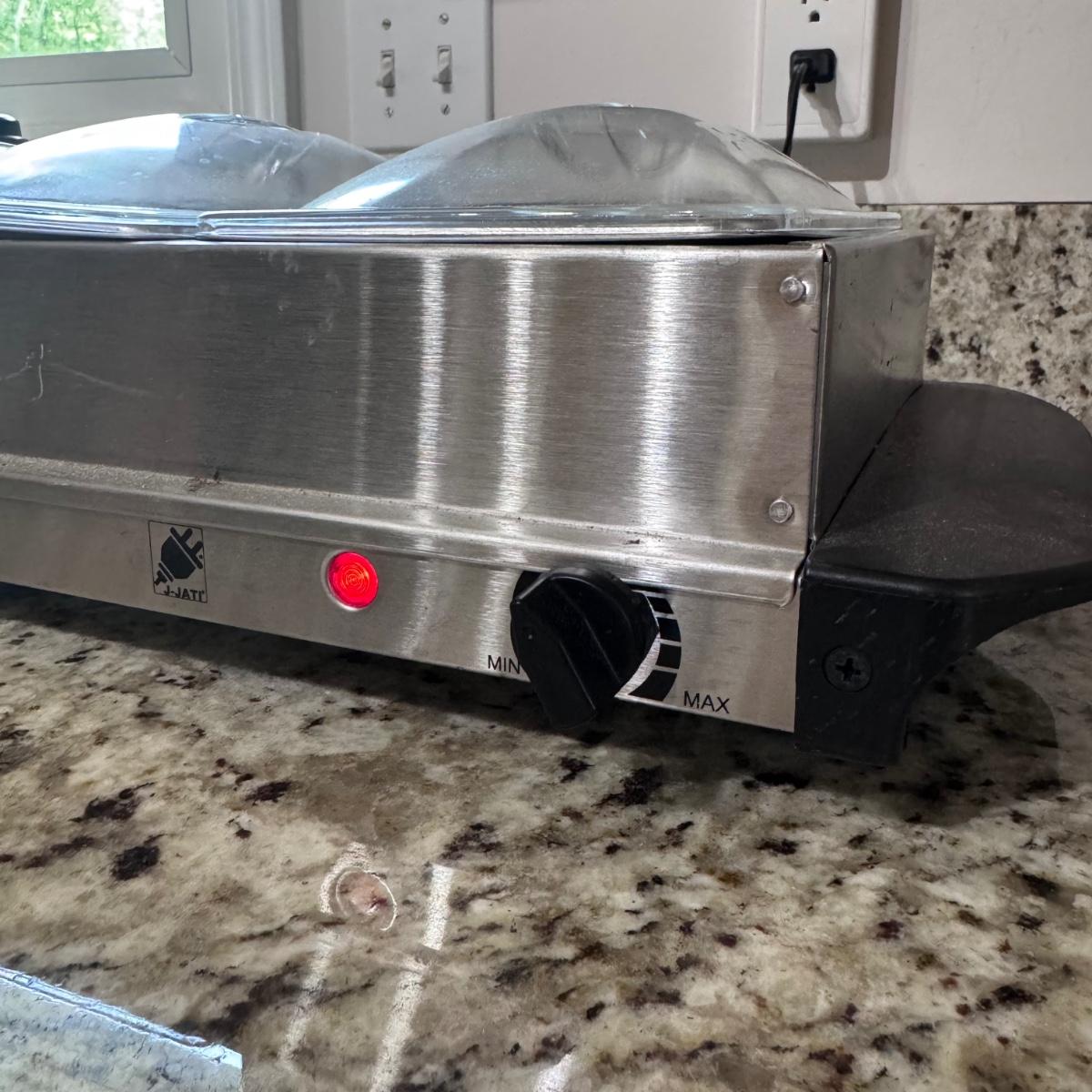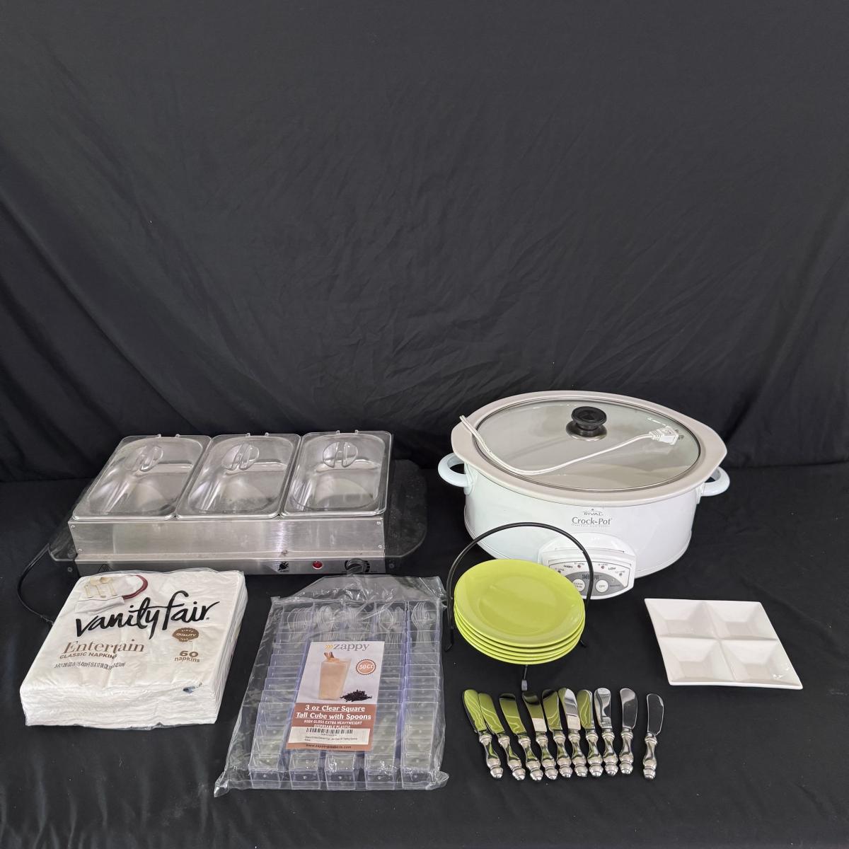 Lot includes one Rival crockpot, one buffet warmer with three inserts, set of five Signature green ceramic plates in a black storage basket, and ten Amco cheese knives. Also included are brand new set of Vanity Fair napkins, brand new 50 count 3 oz clear square tall cubes with spoons, and one World Market serving plate that is ceramic. The buffet server and food warmer measures 22” x 10” x 5”H. Both the crockpot and food warmer powered on when plugged in - see pictures included.