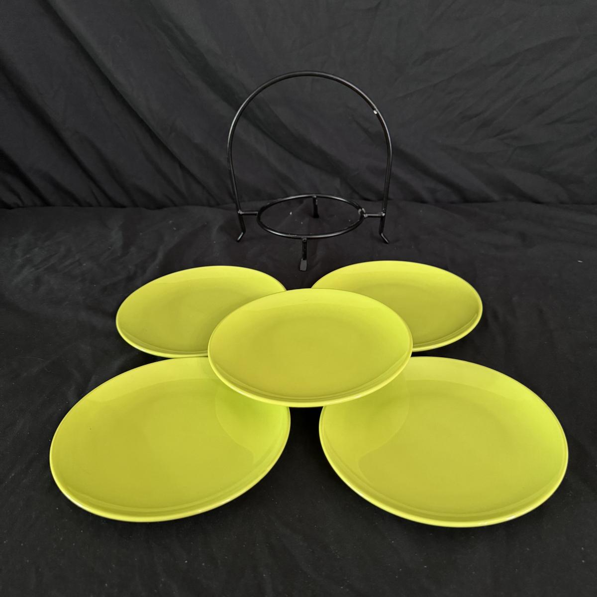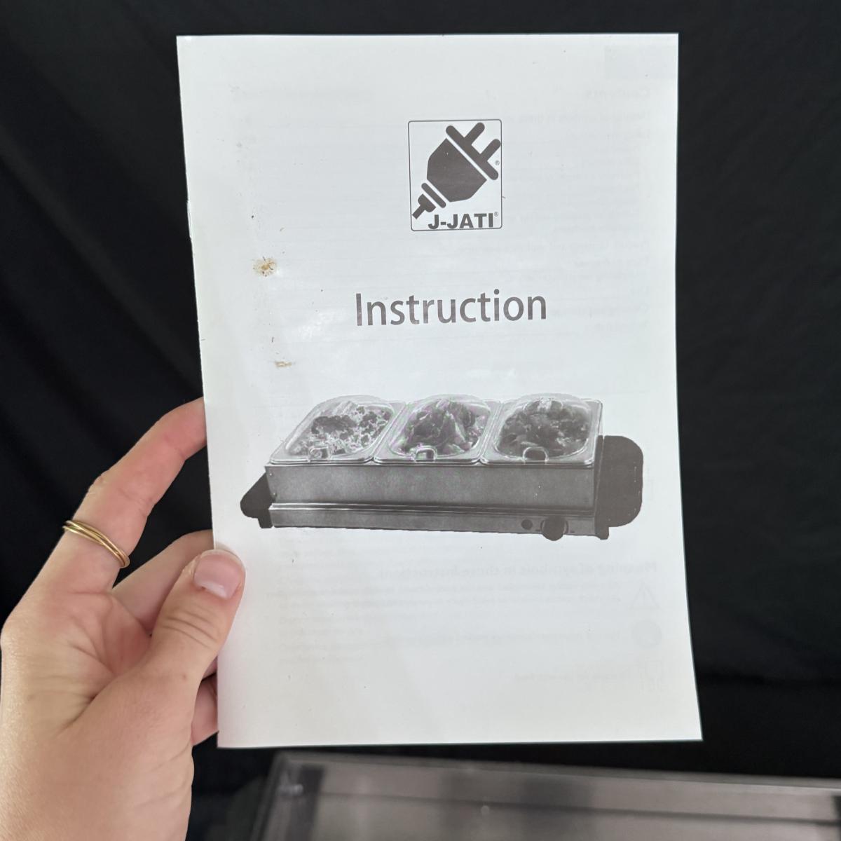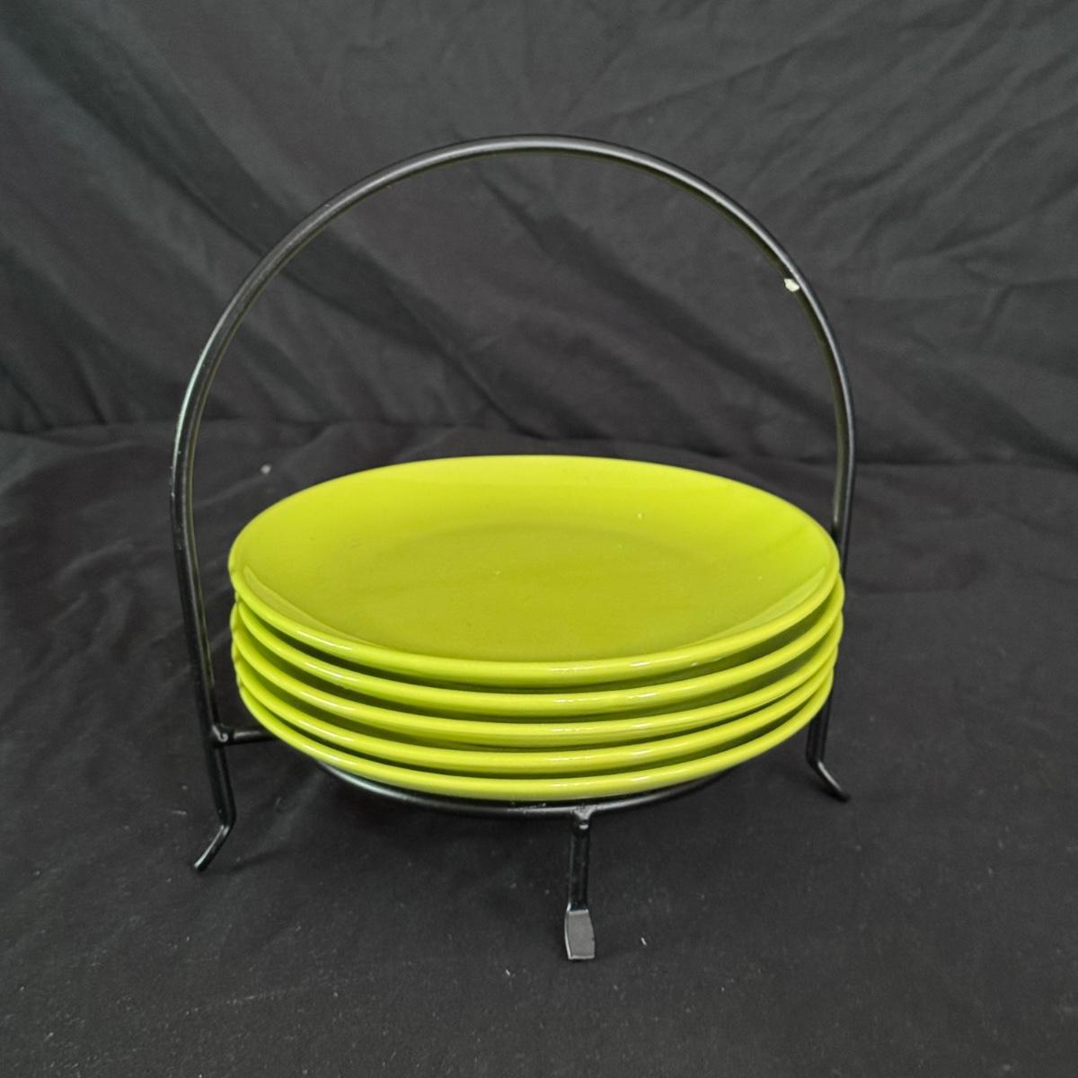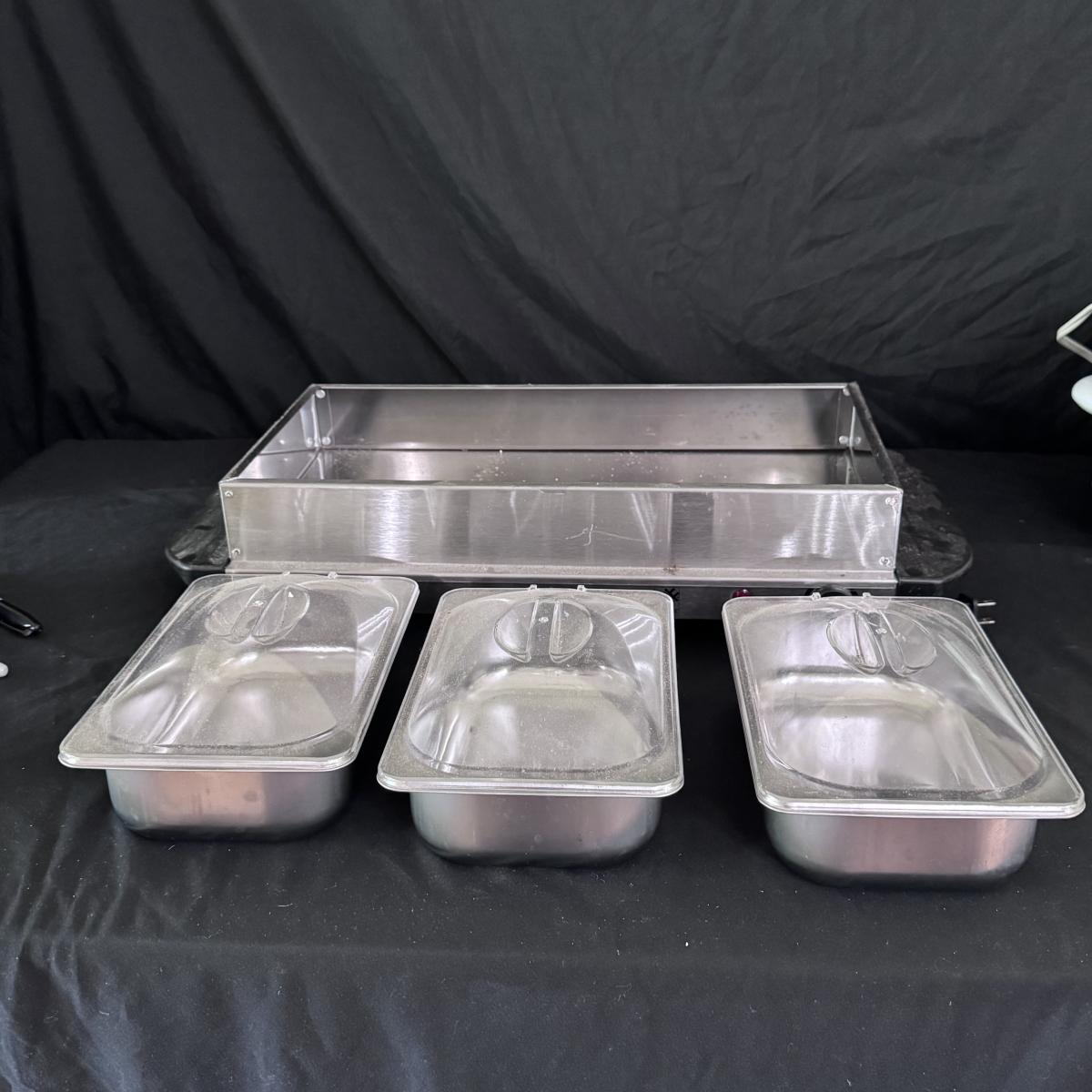 Lot includes one Rival crockpot, one buffet warmer with three inserts, set of five Signature green ceramic plates in a black storage basket, and ten Amco cheese knives. Also included are brand new set of Vanity Fair napkins, brand new 50 count 3 oz clear square tall cubes with spoons, and one World Market serving plate that is ceramic. The buffet server and food warmer measures 22” x 10” x 5”H. Both the crockpot and food warmer powered on when plugged in - see pictures included.