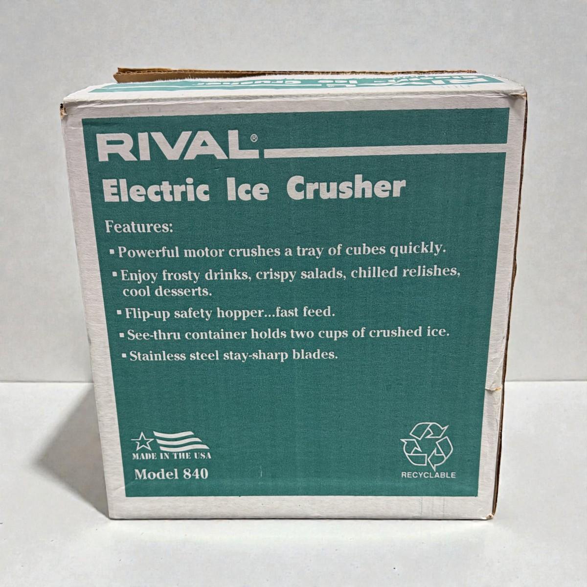 Rival Electric Ice Crusher in Original Box. It has a crushed ice capacity of 2 cups