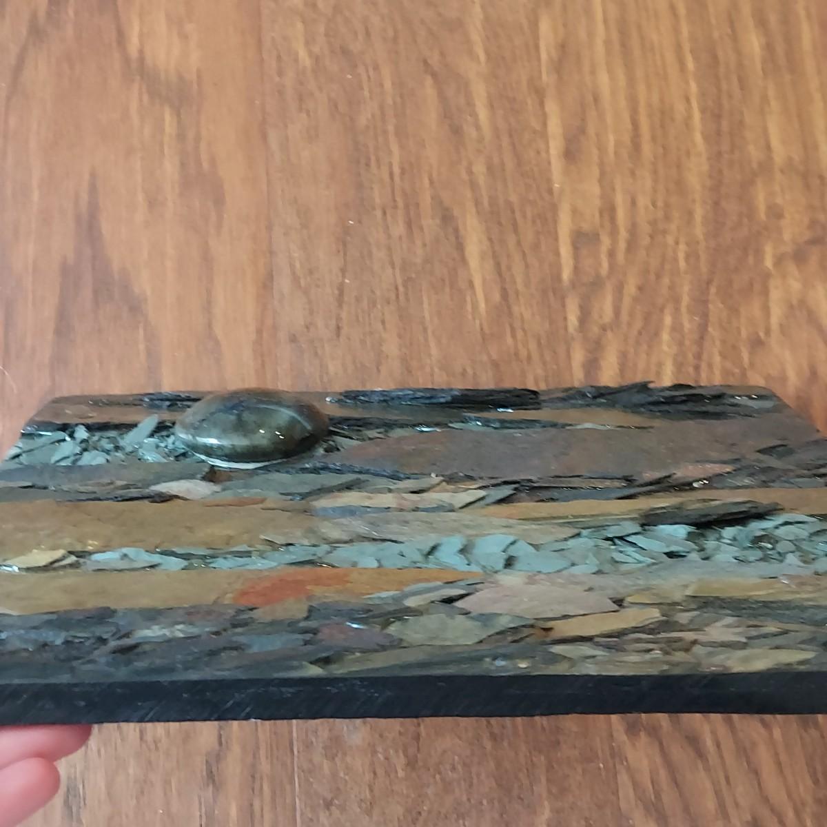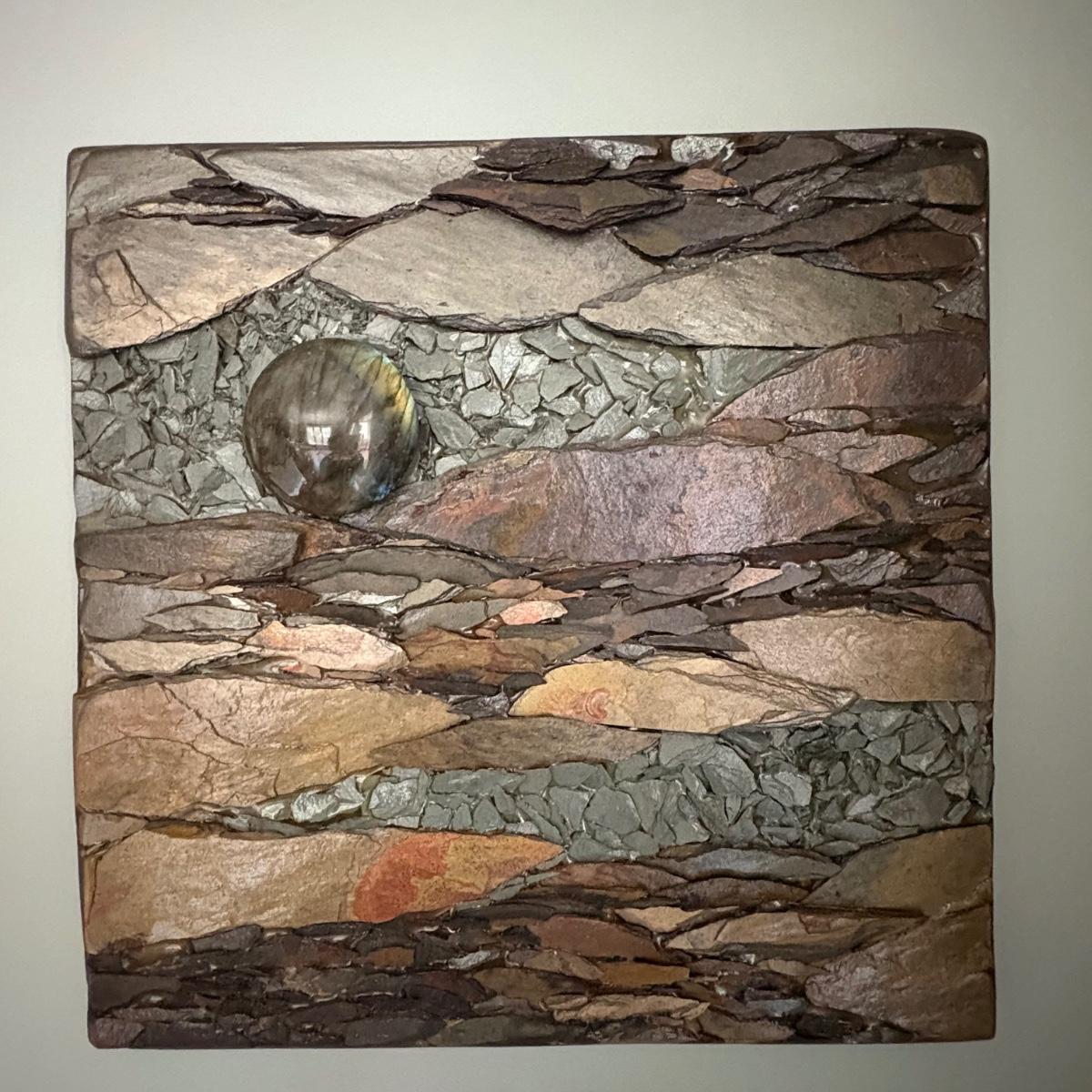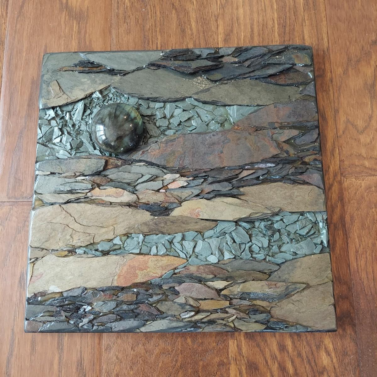Mixed media mosaic with stone. Measures 12” x 12”H. Per the homeowner, this piece is titled "River Rock" by Erika Bell and was purchased Santa Kilim Gallery in New Mexico. Shipping available.