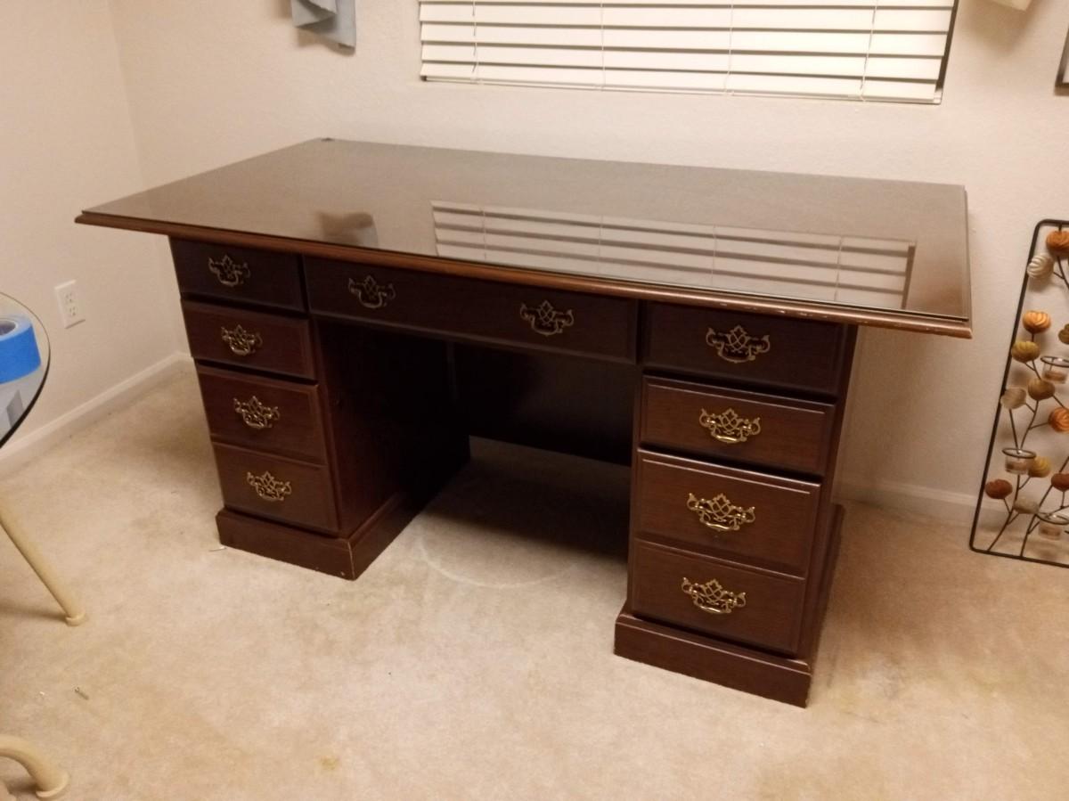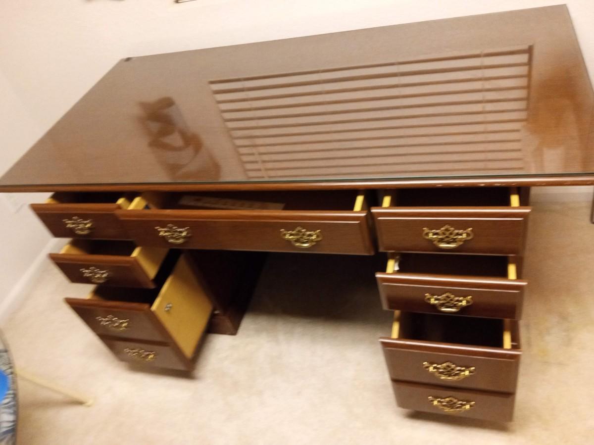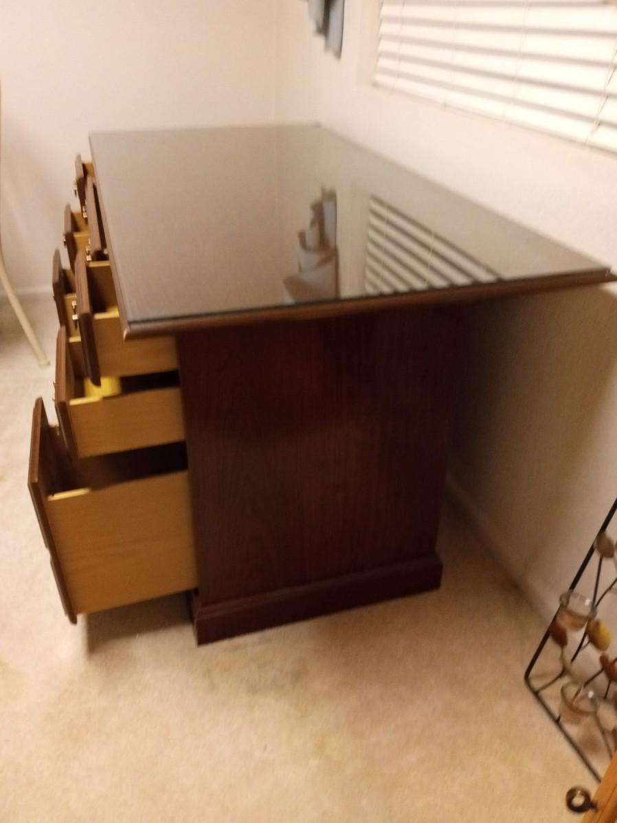 FILING DRAWER ON EACH SIDE, MIDDLE DRAWER AND 2 SMALLER DRAWERS ON EACH SIDE. IT HAS A FITTED PIECE OF GLASS ON THE TOP (THE CORNER IS CRACKED)