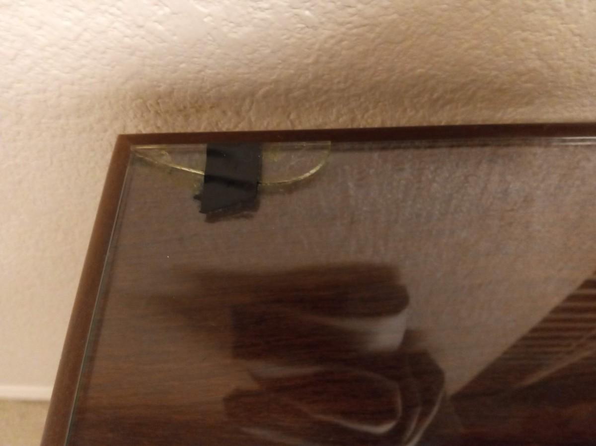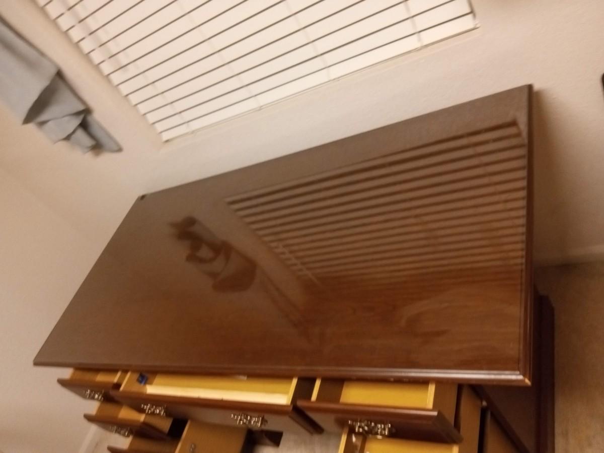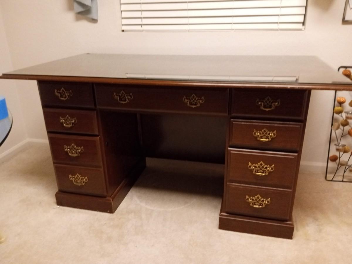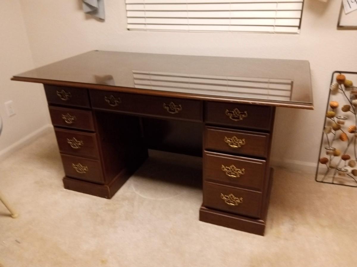 FILING DRAWER ON EACH SIDE, MIDDLE DRAWER AND 2 SMALLER DRAWERS ON EACH SIDE. IT HAS A FITTED PIECE OF GLASS ON THE TOP (THE CORNER IS CRACKED)