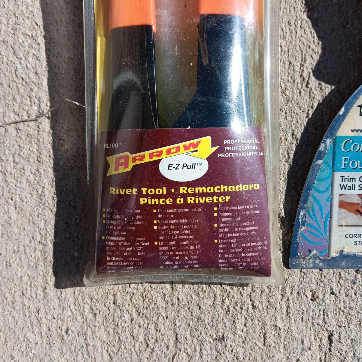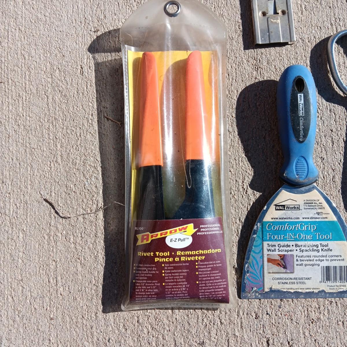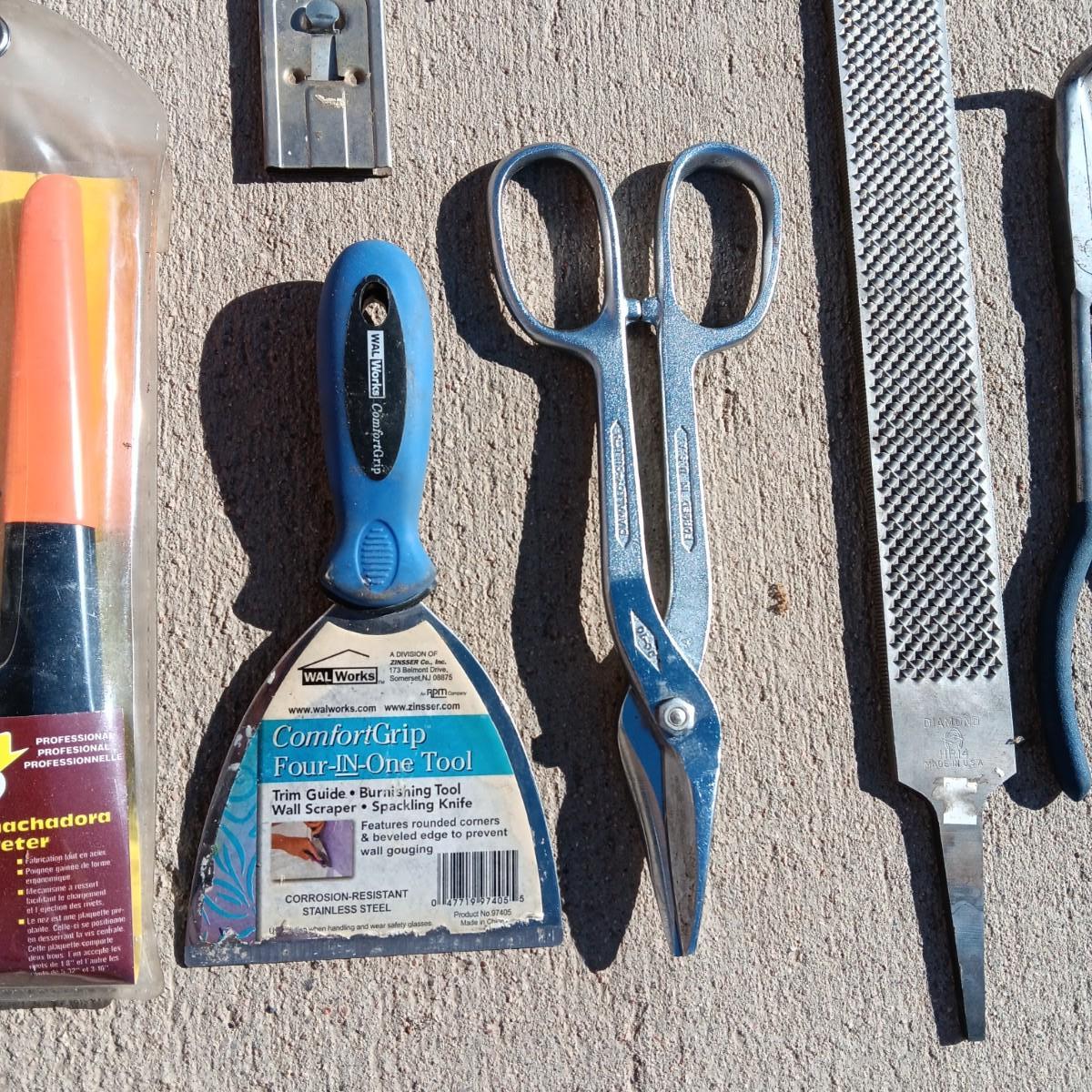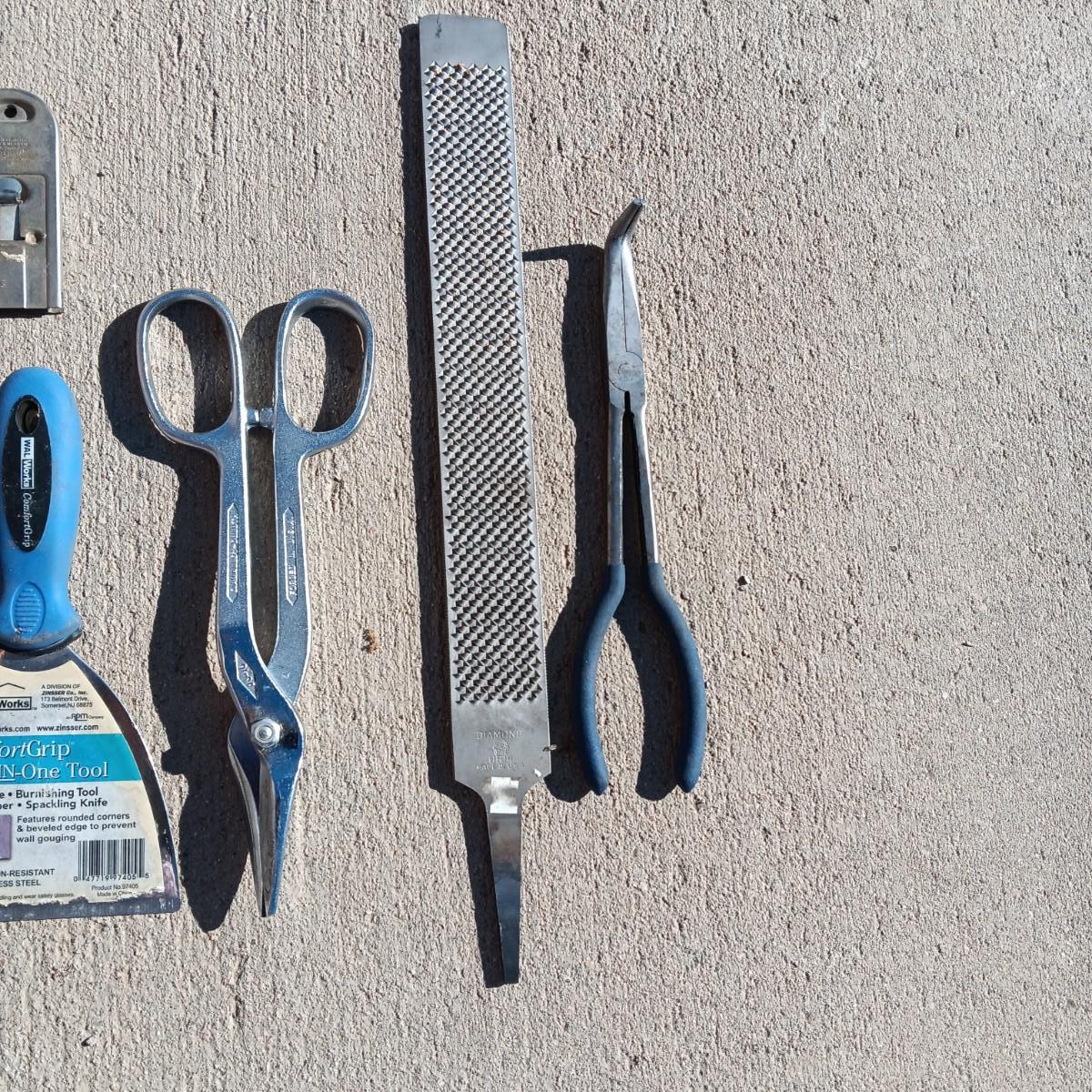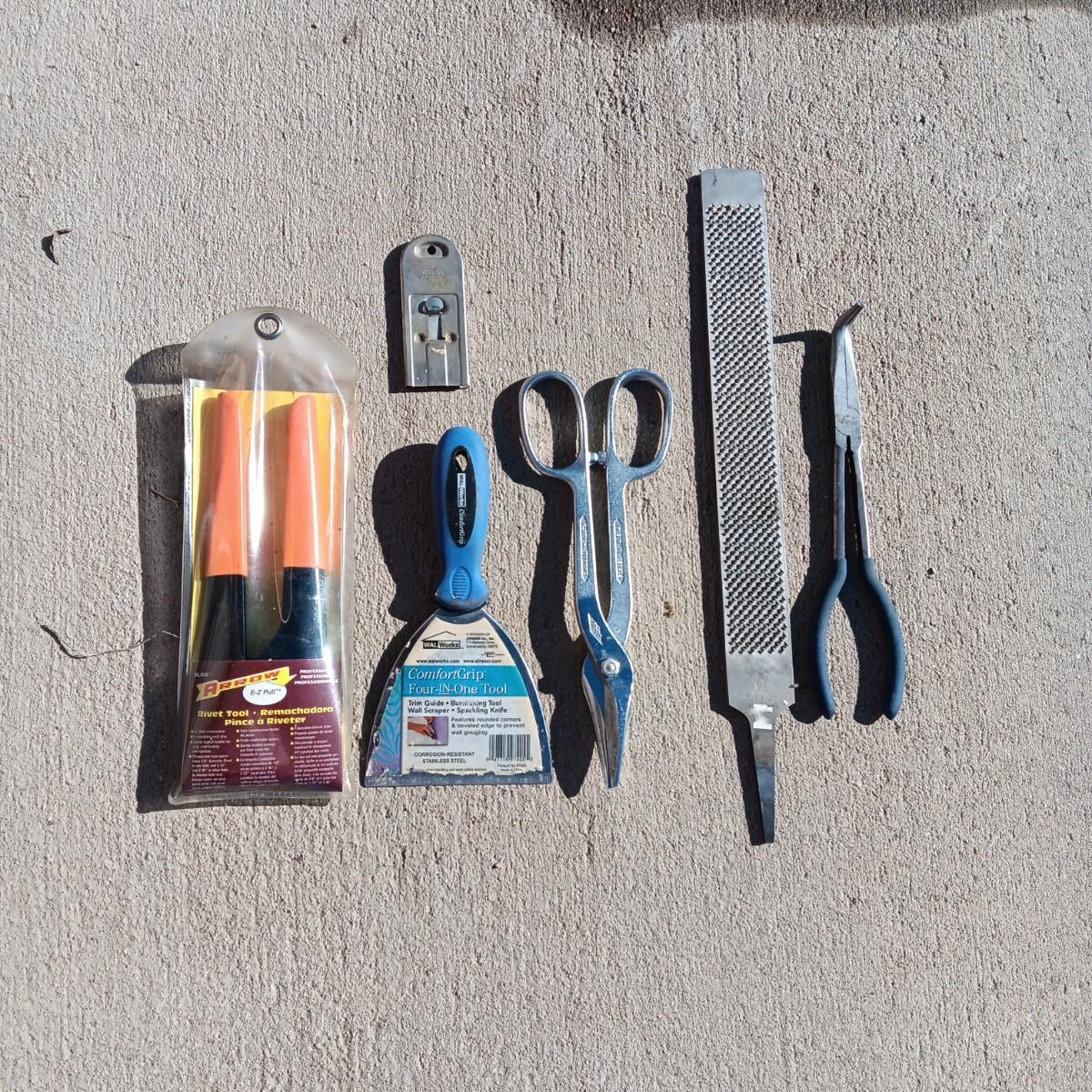 RIVET TOOL, SNIPS, LARGE FILE, NEEDLE NOSE PLIERS, PUTTY KNIFE AND BLADE SCRAPER