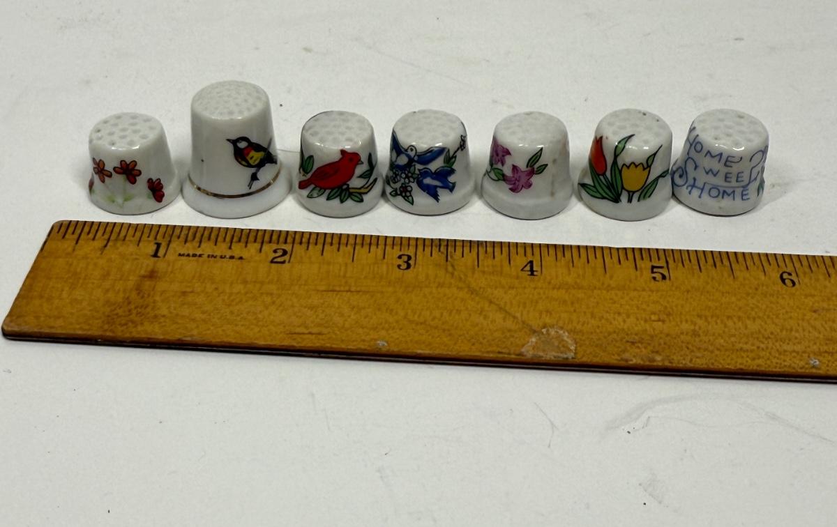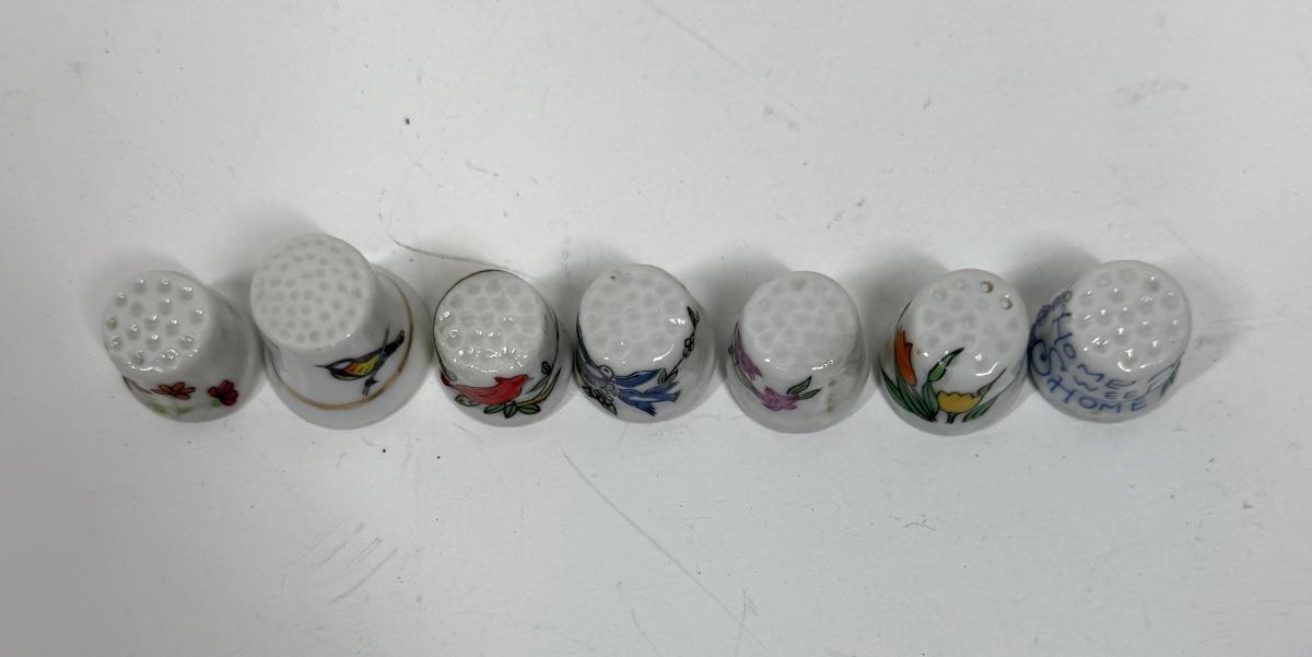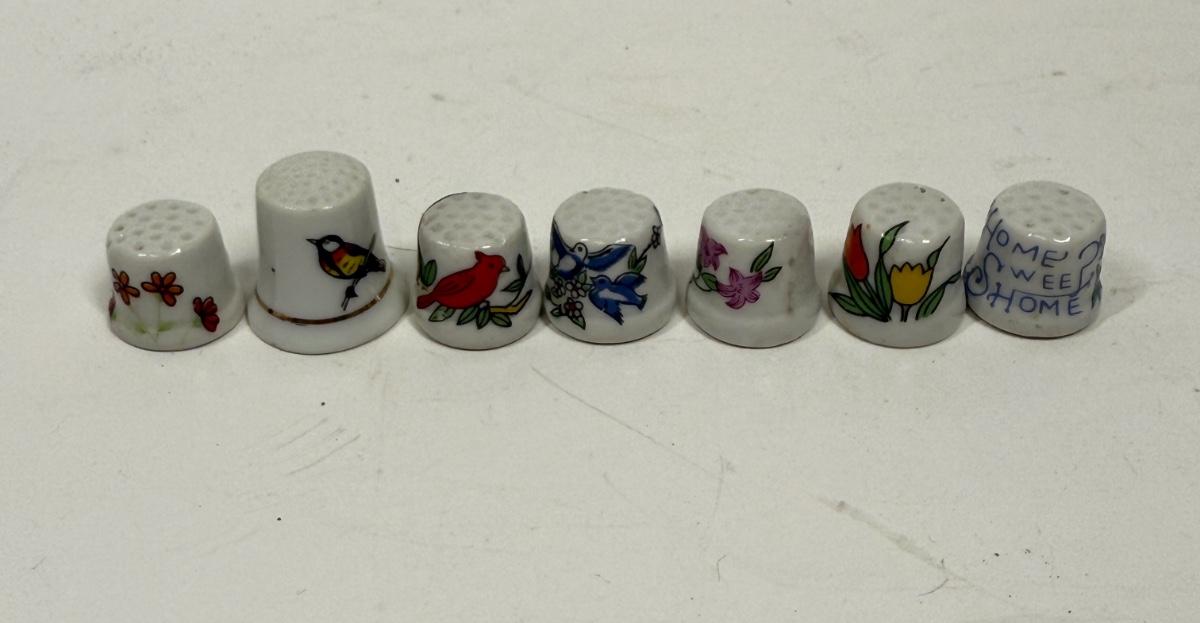 Colorful designs of birds and flowers. Total of 7 thimbles.
