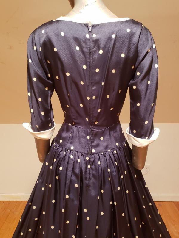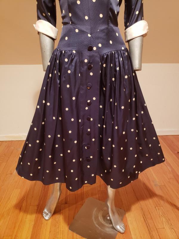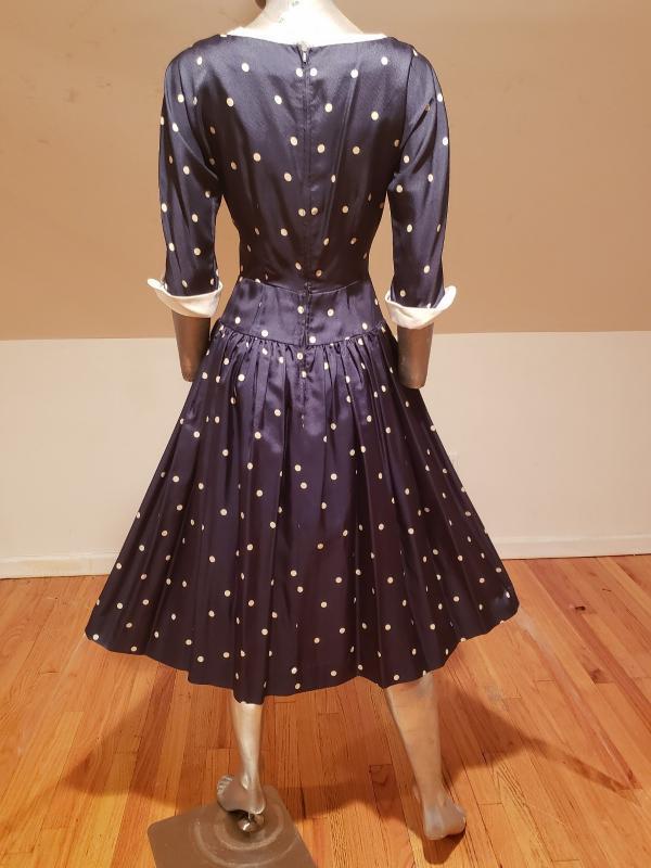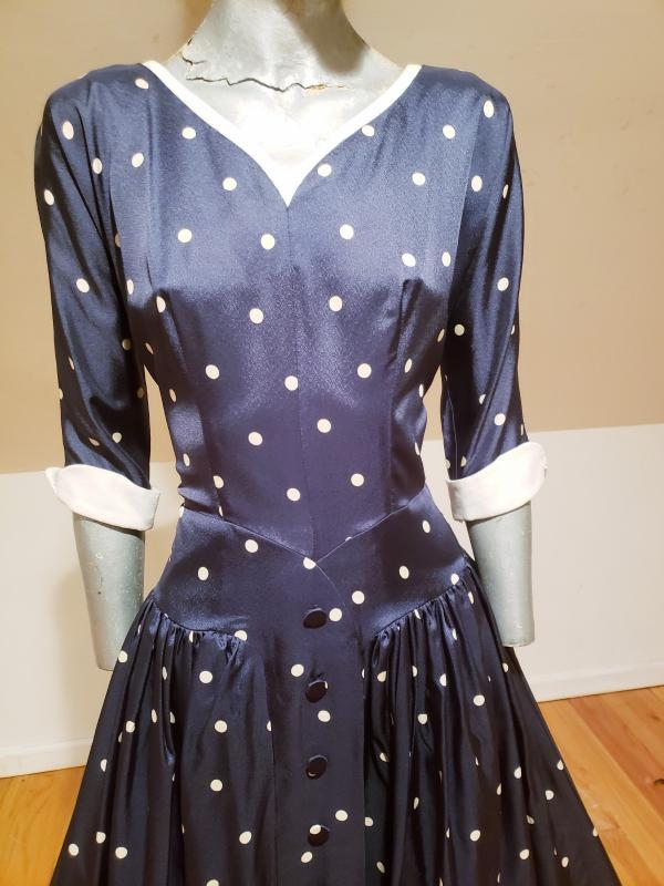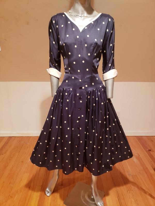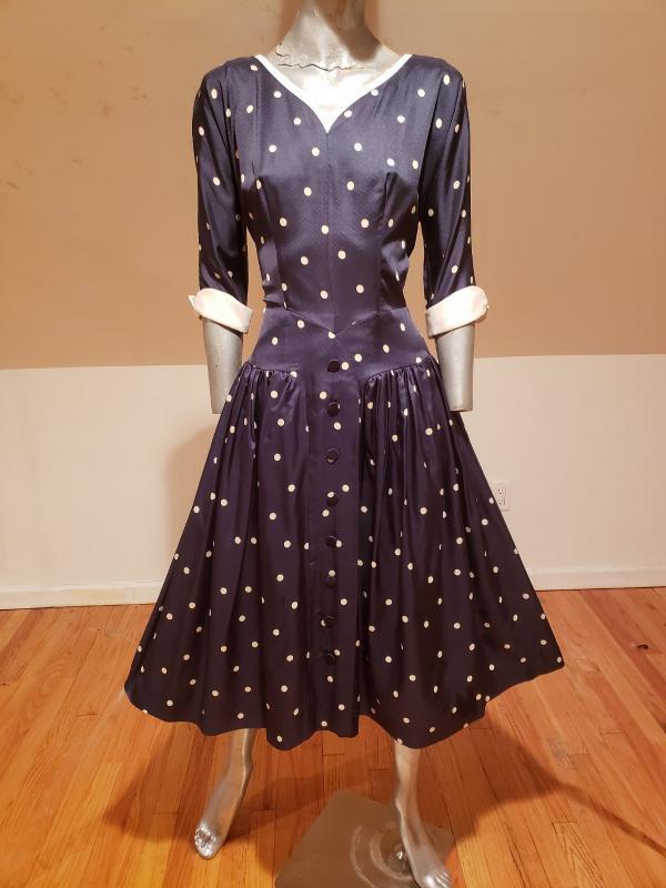 A Darling Lucy style full swep navy white polka dot dress . Raglan sleeves fitted waist and beautiful button details. It is a silk satin or peau de soie very fluid and beautiful. Perfect vintage condition.