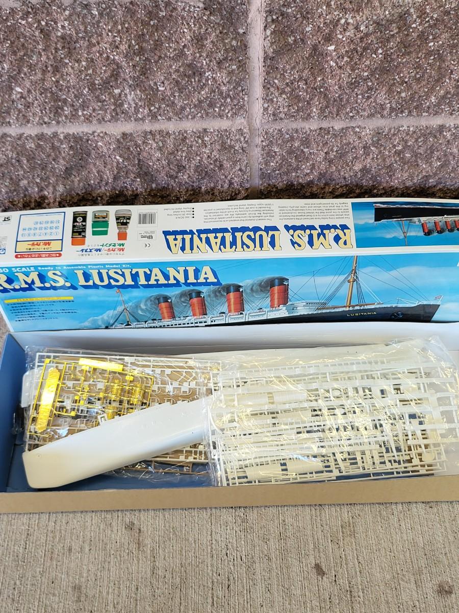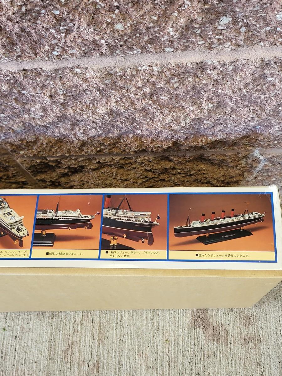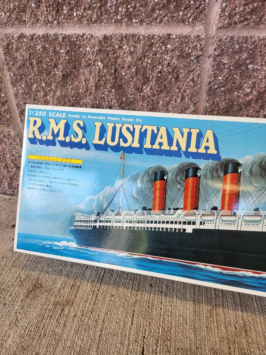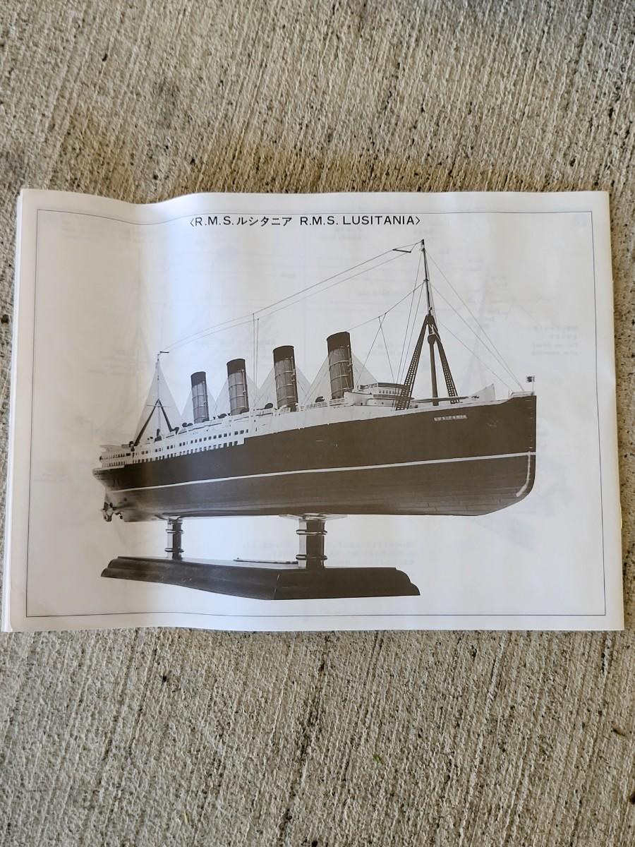 Vintage RMS Lusitania ship model, ready to be put together. Open box, appears all pieces are present. Japanese. Shipping not available for this item.