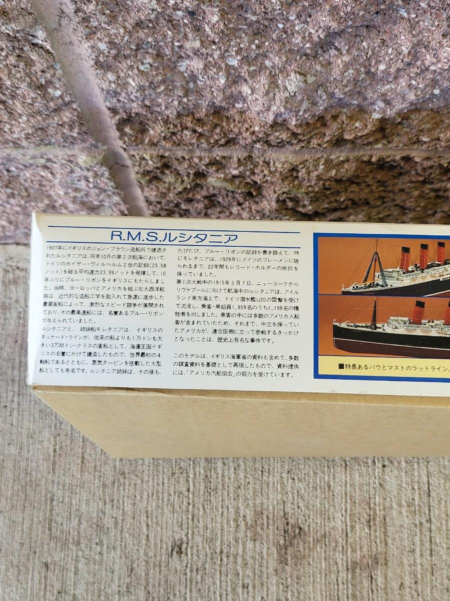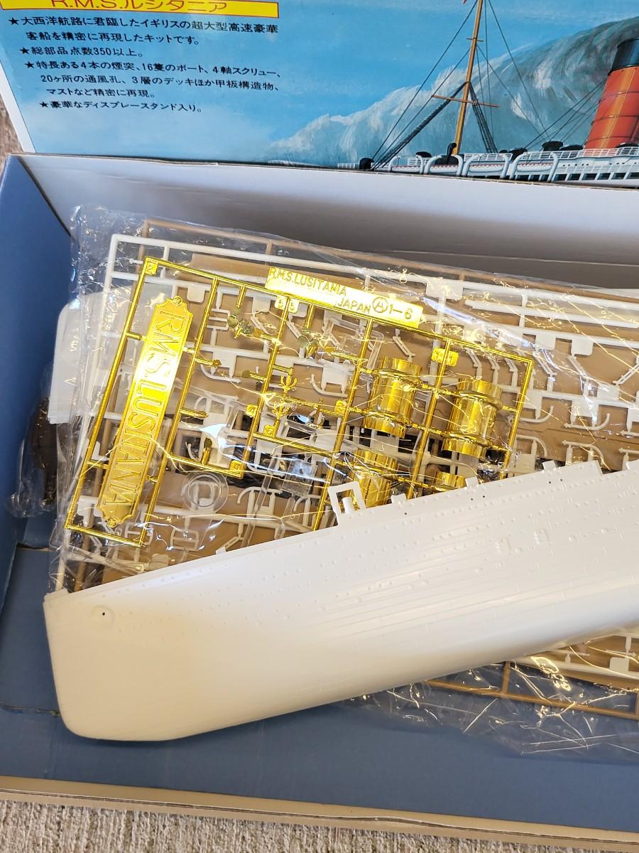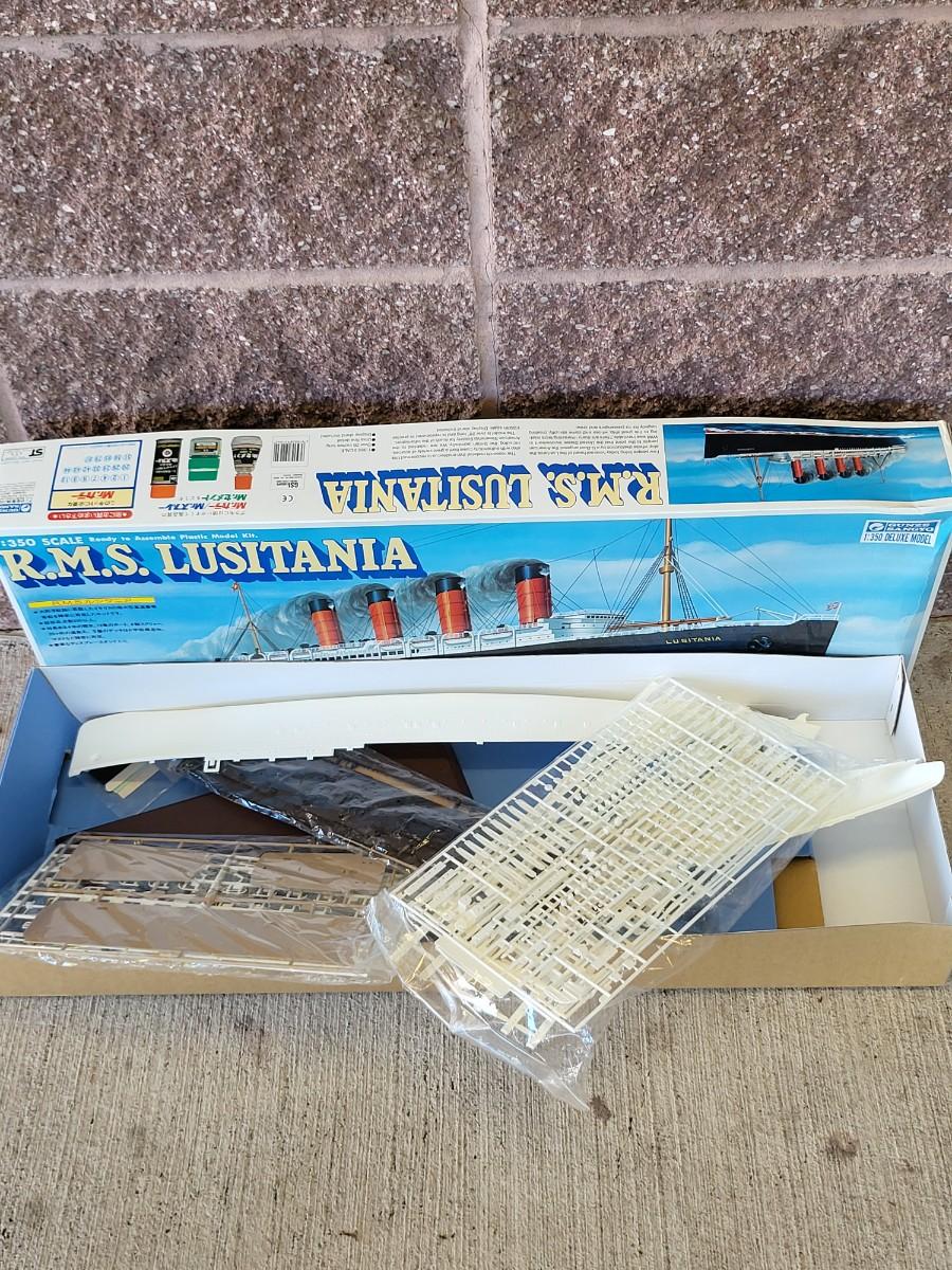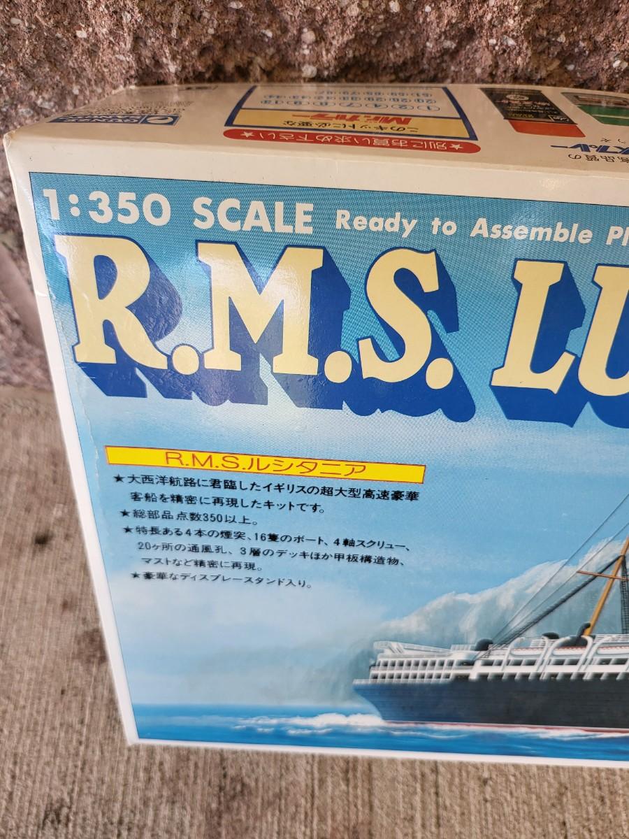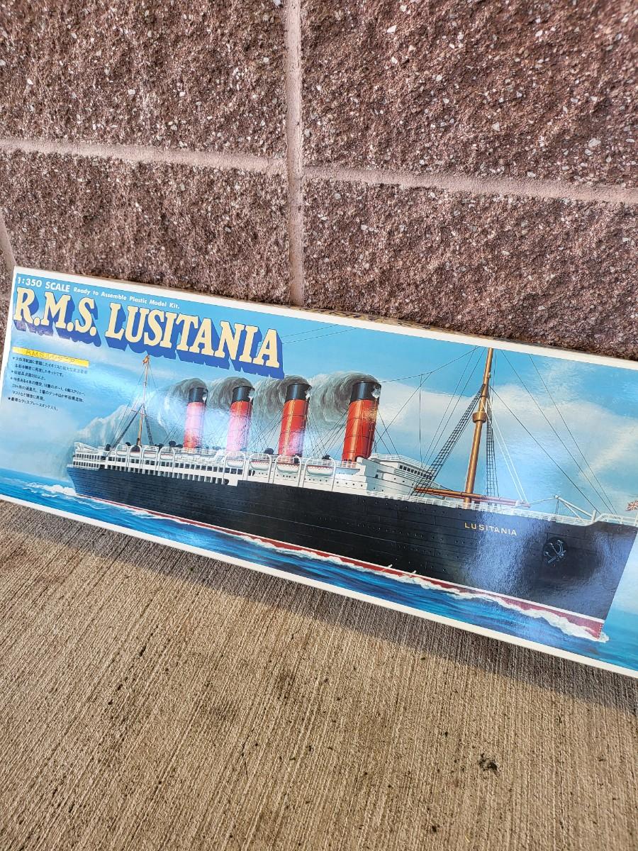 Vintage RMS Lusitania ship model, ready to be put together. Open box, appears all pieces are present. Japanese. Shipping not available for this item.