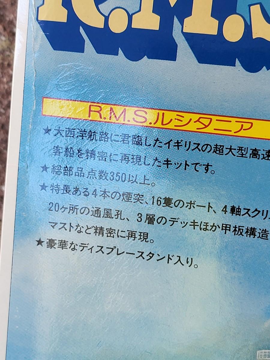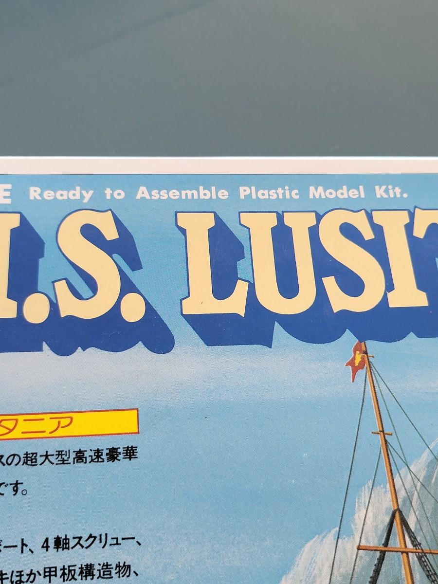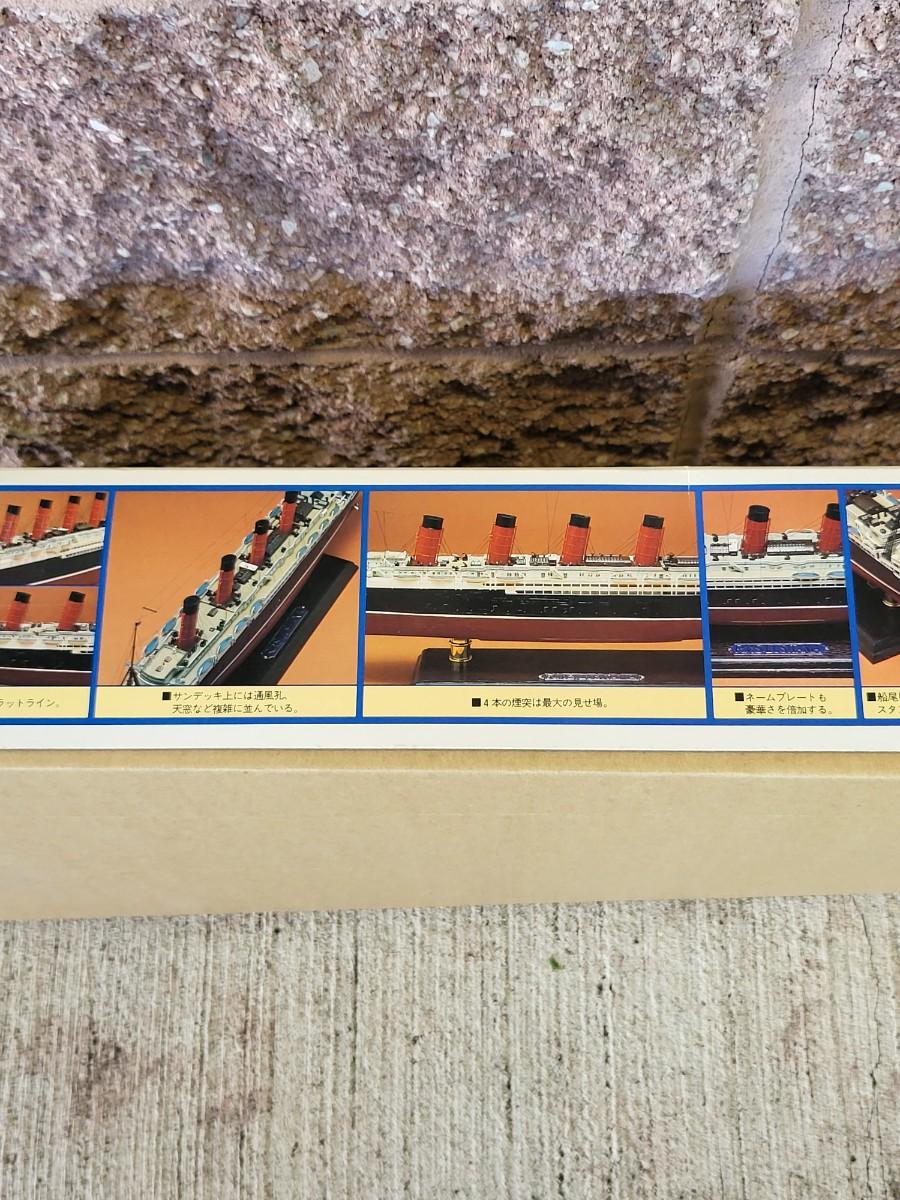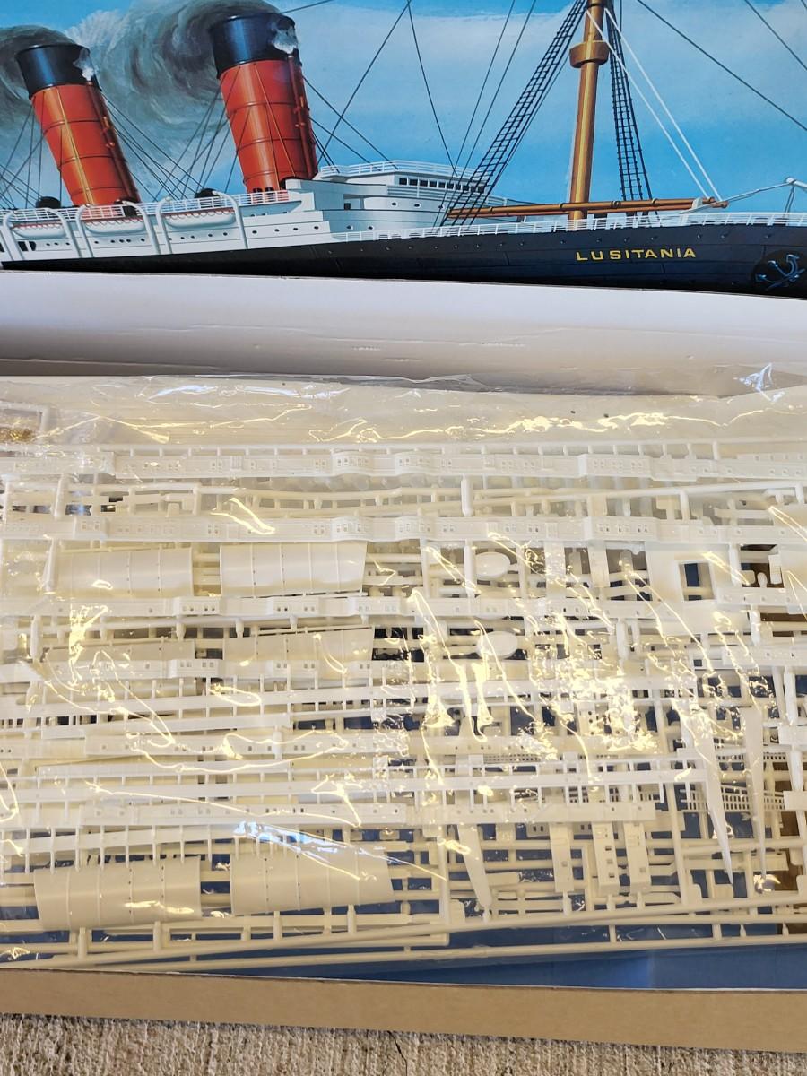 Vintage RMS Lusitania ship model, ready to be put together. Open box, appears all pieces are present. Japanese. Shipping not available for this item.