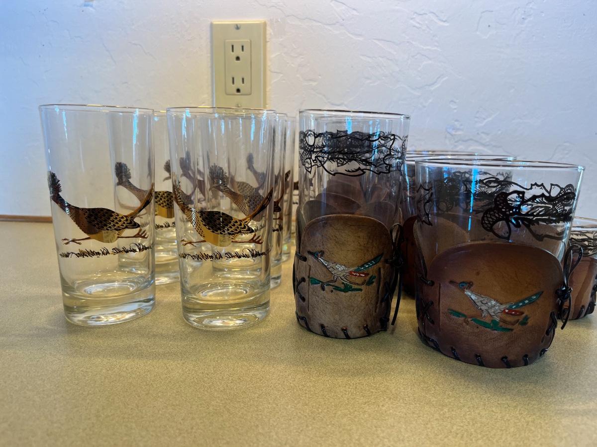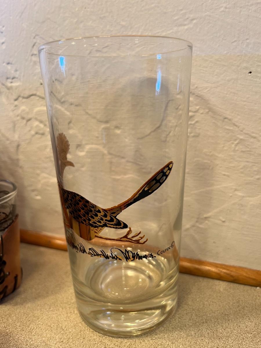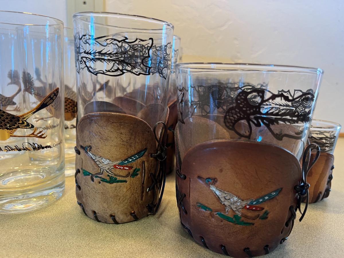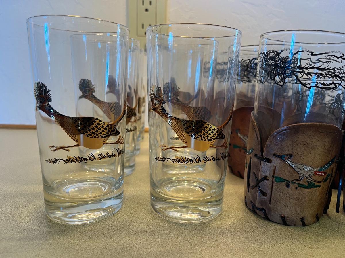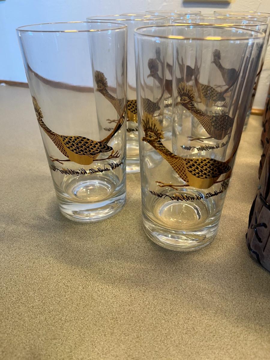 8 pc roadrunners glasses by Couroc, and 12 pc autumn etched glasses 4 drinking 4 whiskey 4 shot glasses