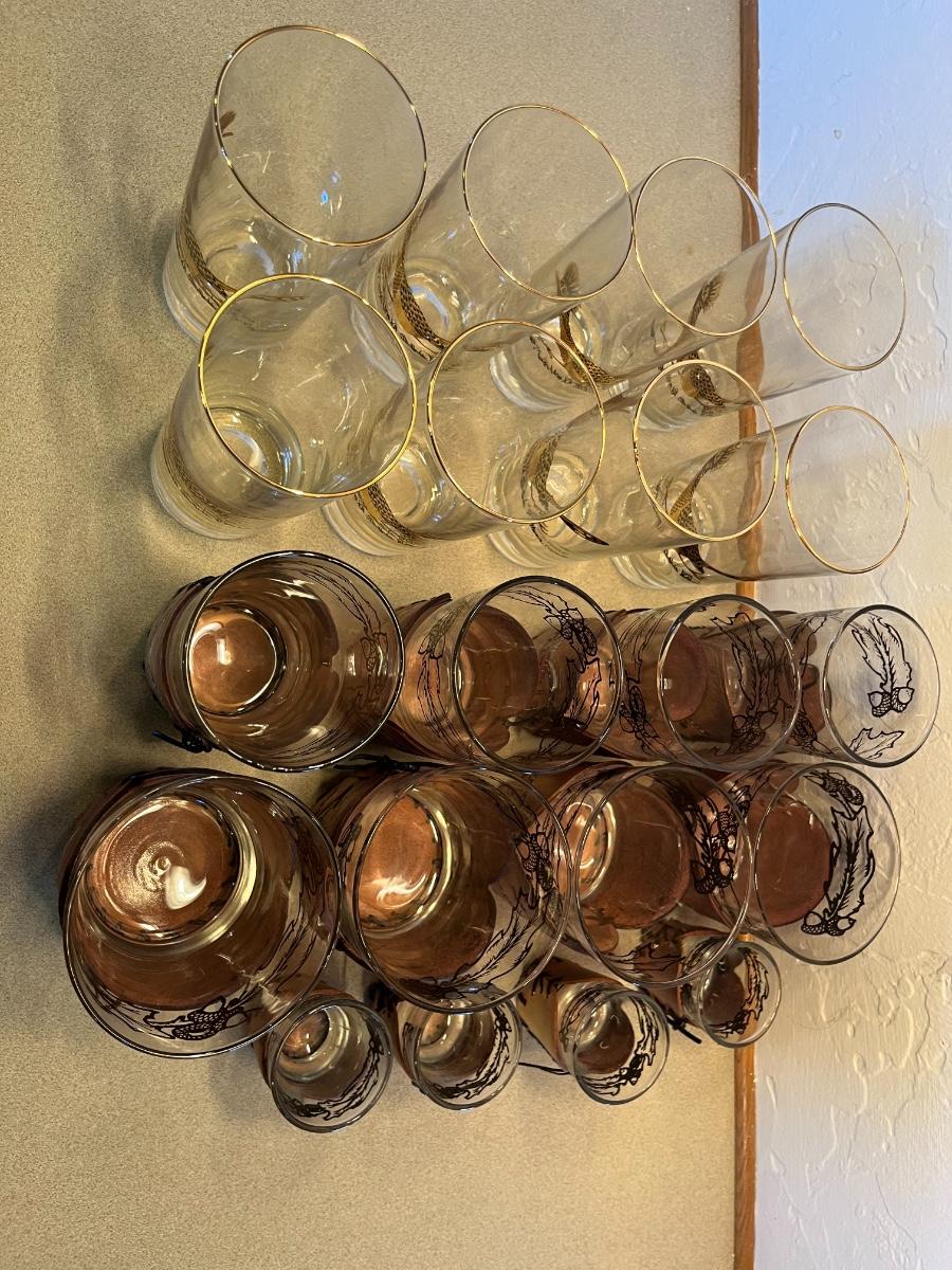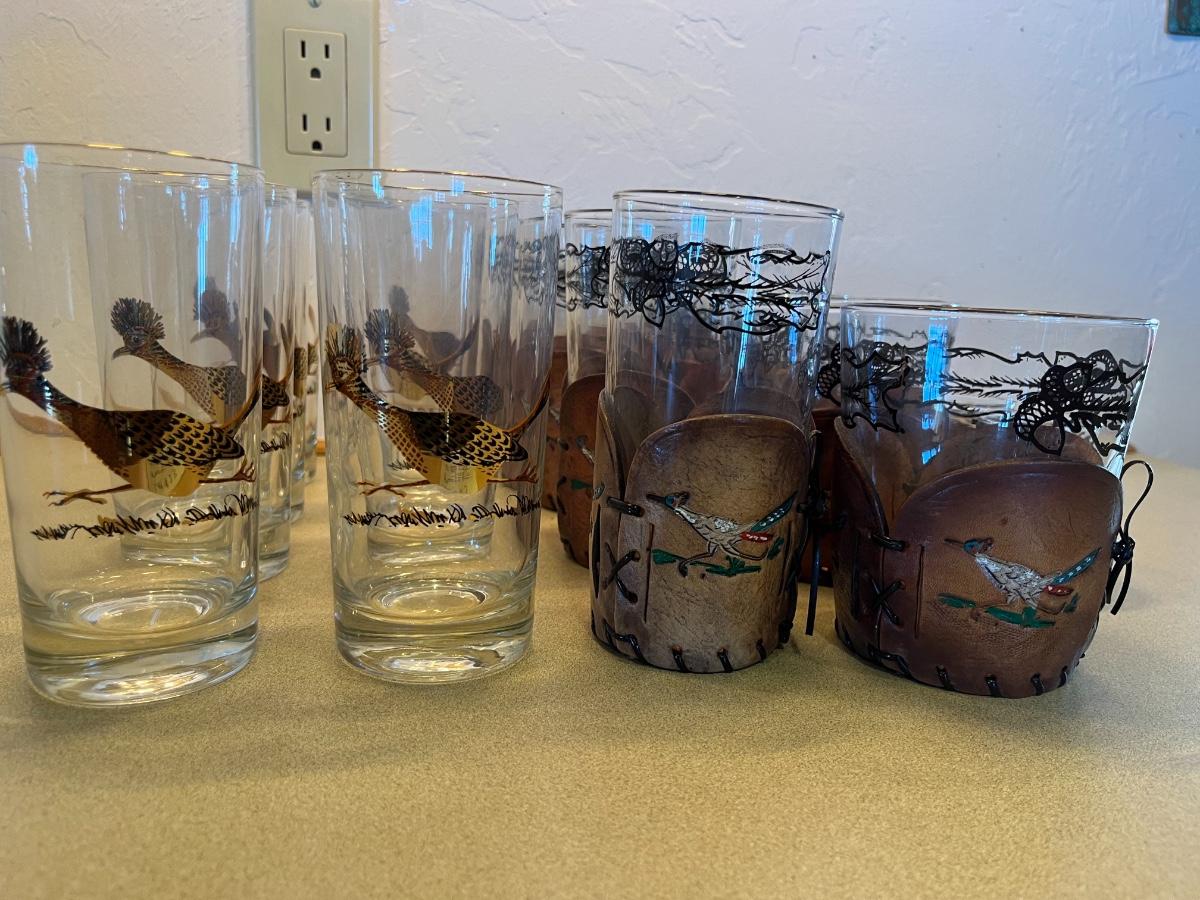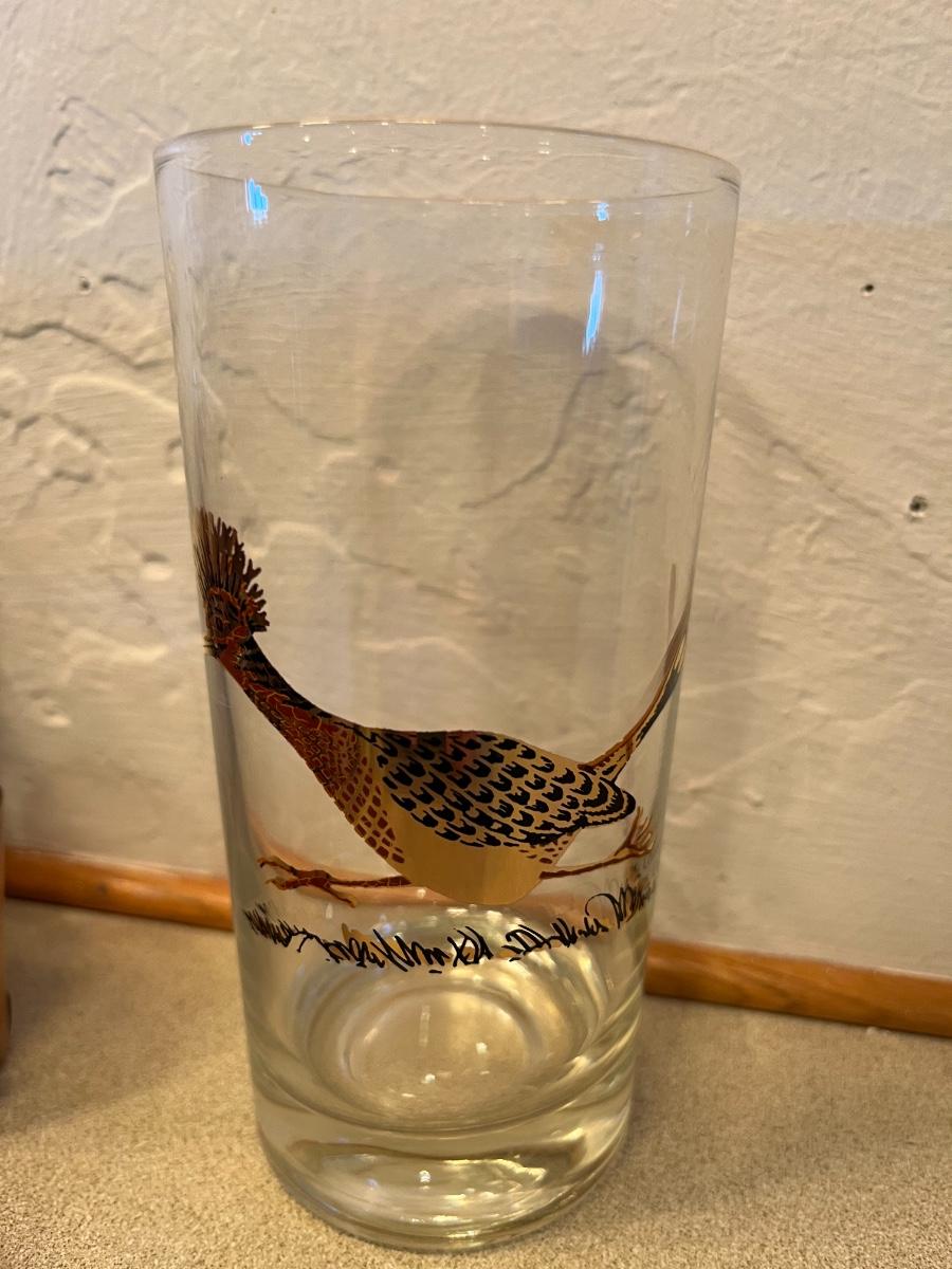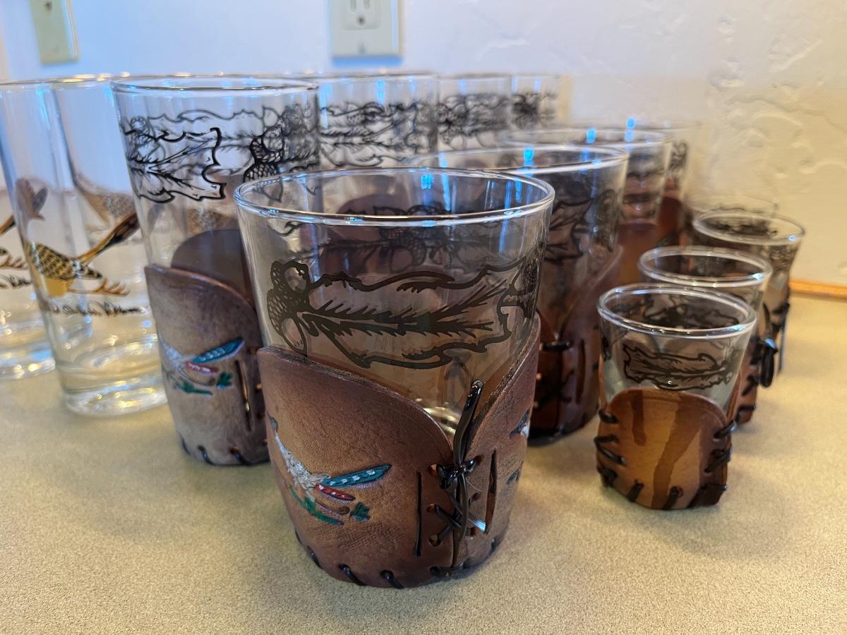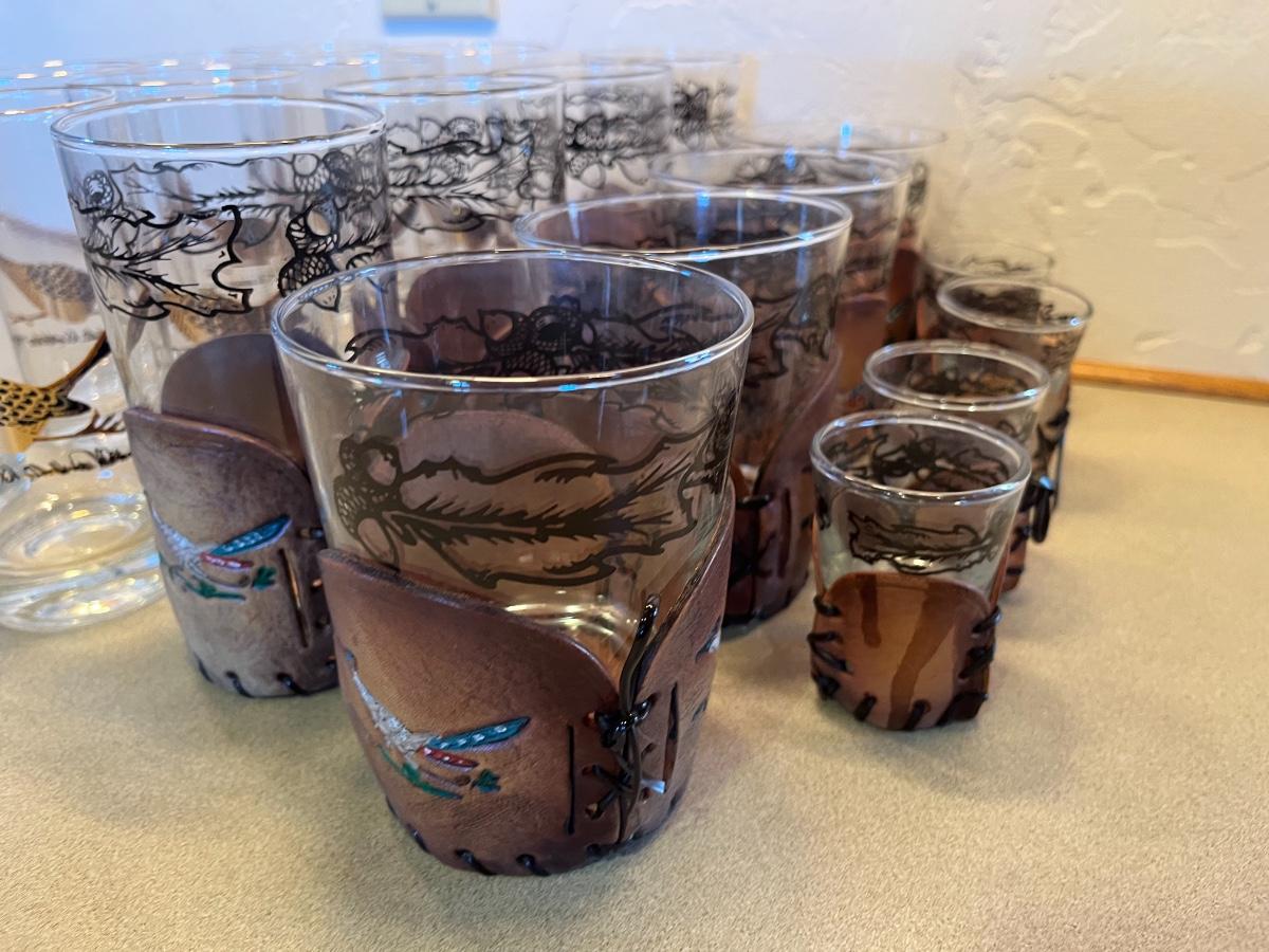 8 pc roadrunners glasses by Couroc, and 12 pc autumn etched glasses 4 drinking 4 whiskey 4 shot glasses