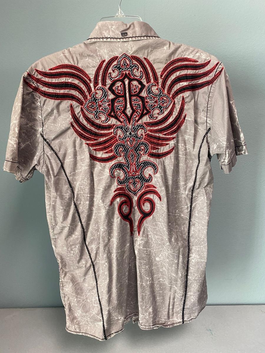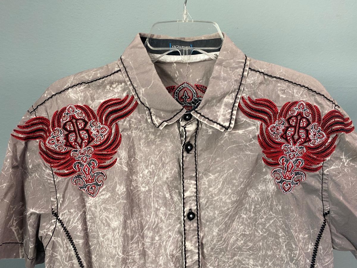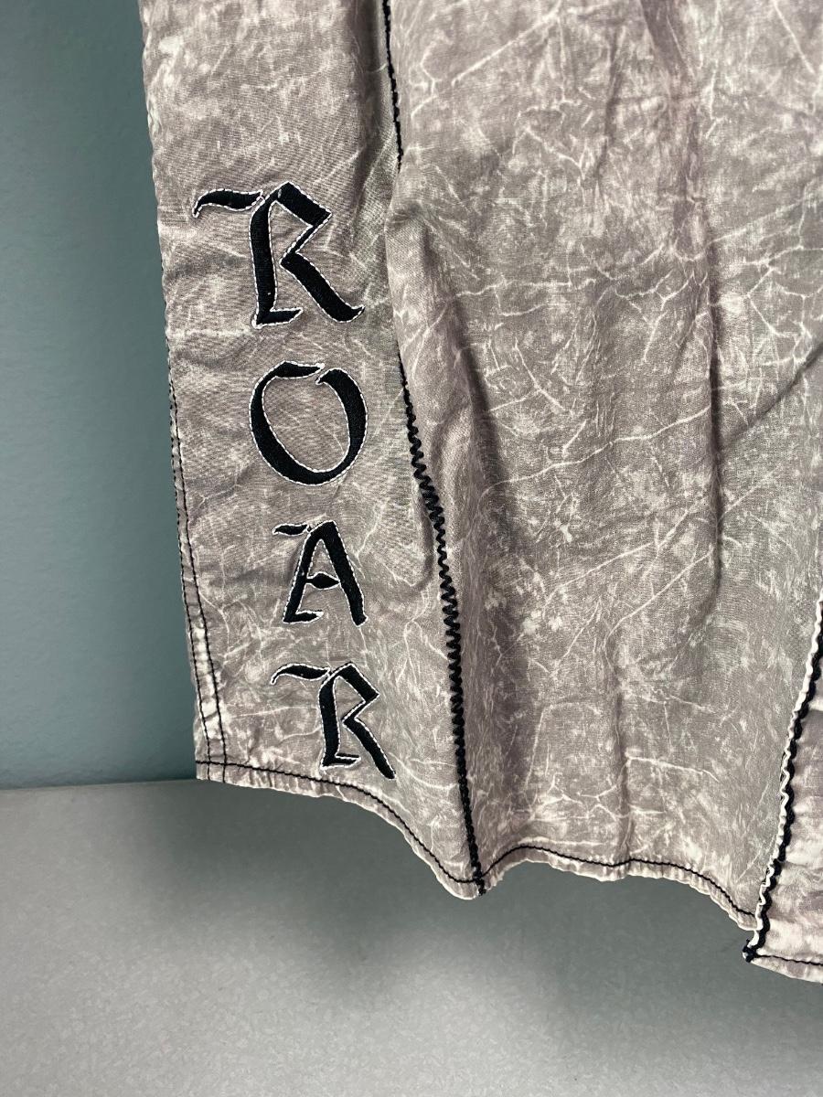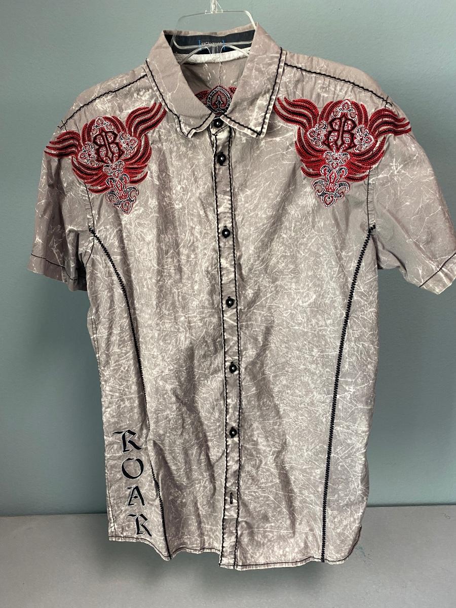 Roar Distressed Embroidered Button Front Short Sleeve Shirt. No size tag, small/medium, possibly slim fit. Good condition.
