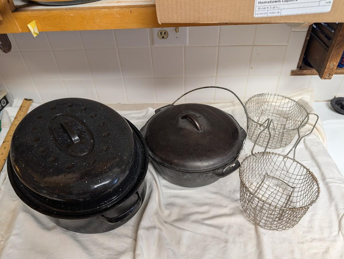 Cast iron Dutch oven 8G1 with lid, roaster frying baskets.