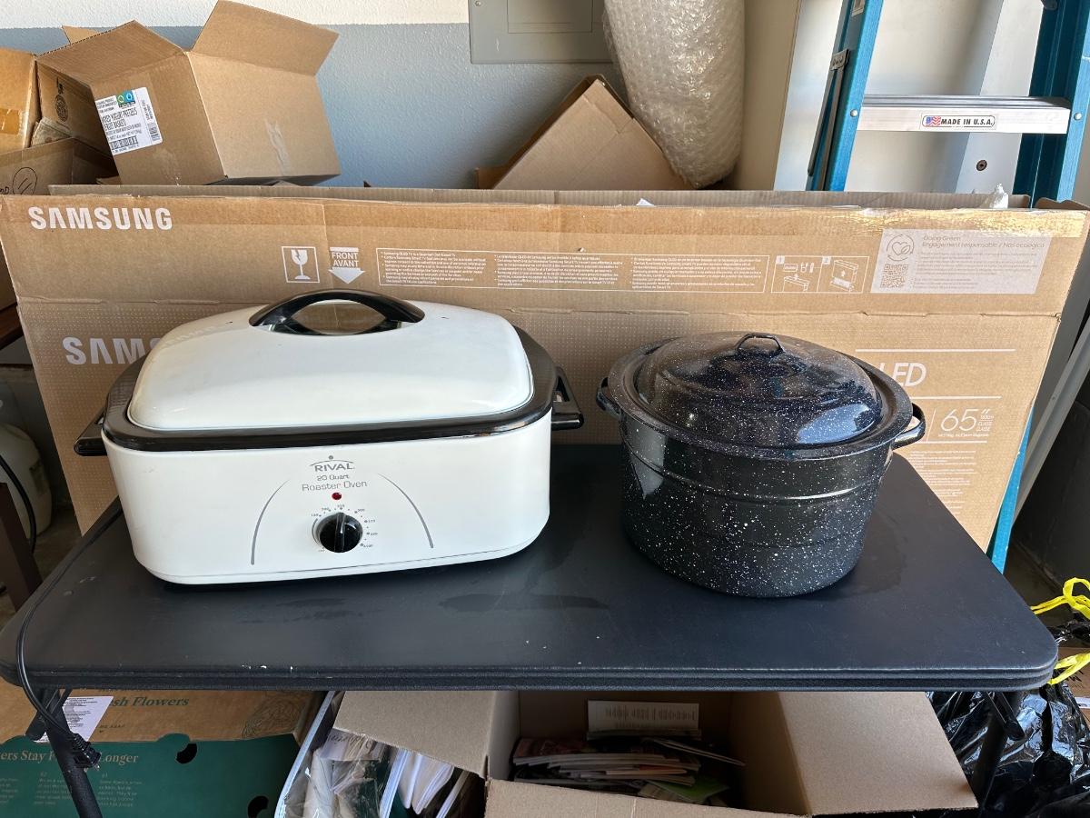 Rival 20qt roaster over and granite ware canner with lid and jar rack.
