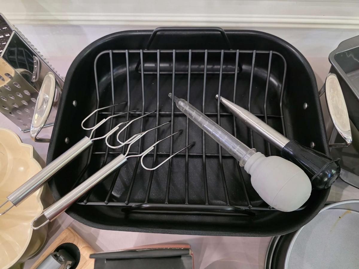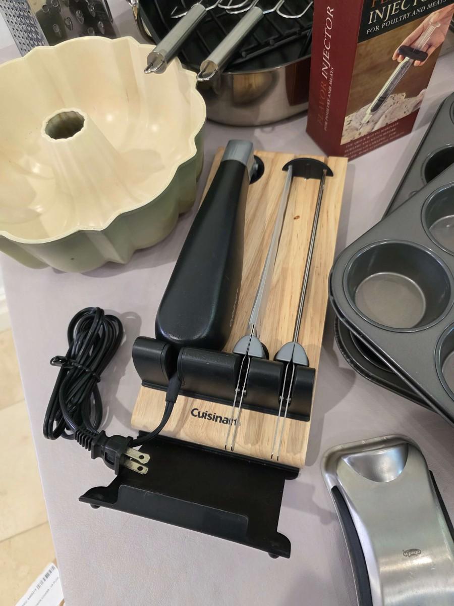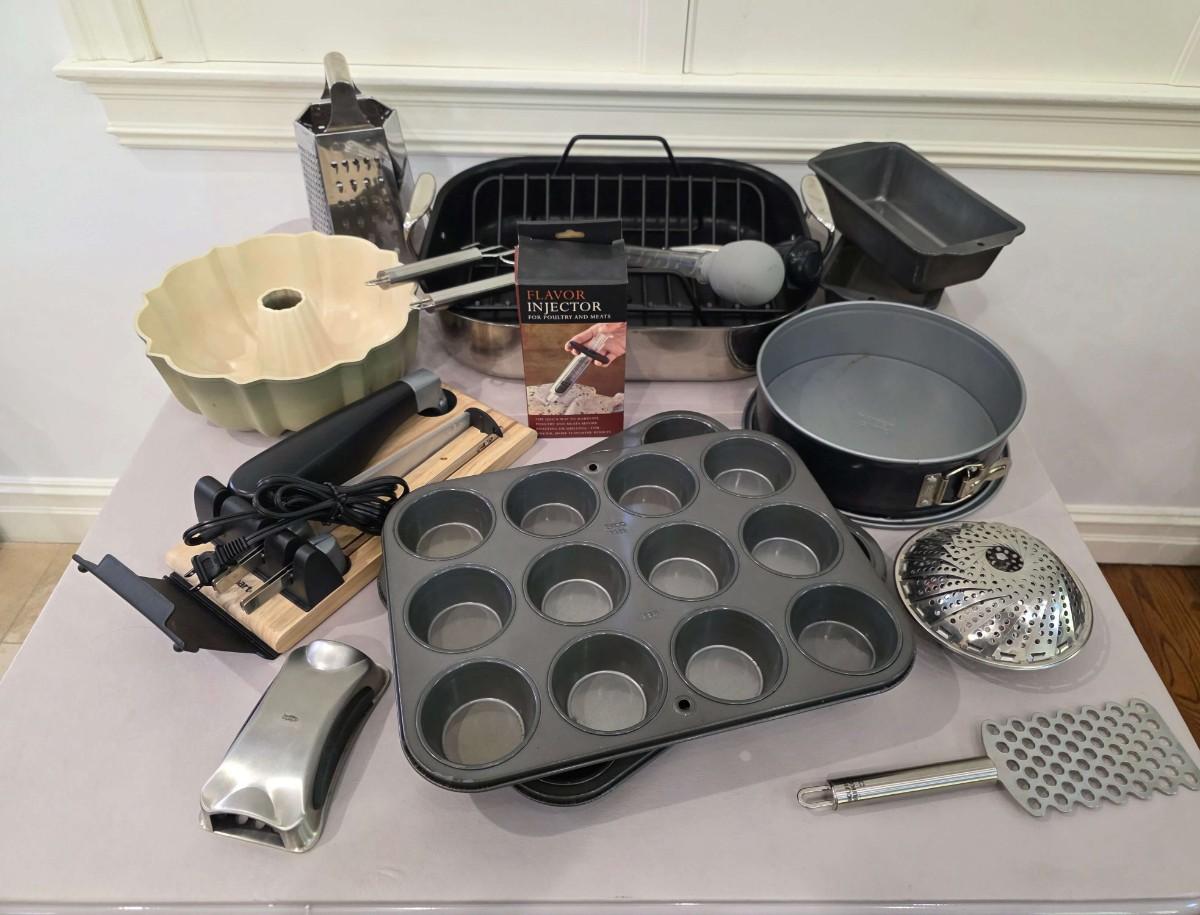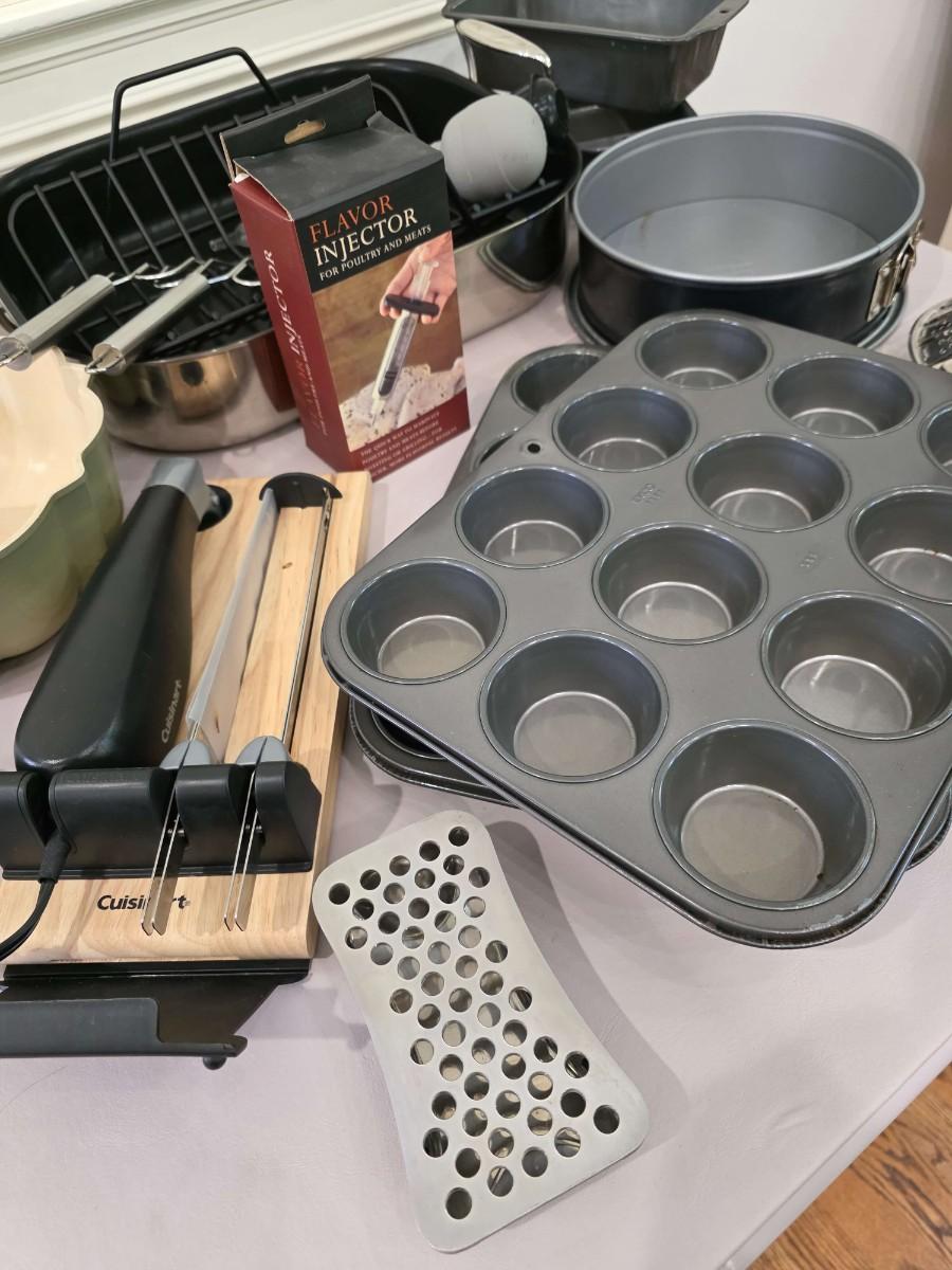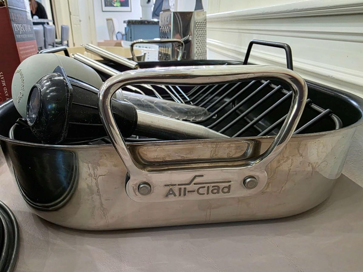 Just in time for the holidays! This is a lot of various roasting and baking items including an All-Clad roasting pan and an electric Cuisinart carving knife. You are bidding on the lot meaning you must pay for and take the entire lot.