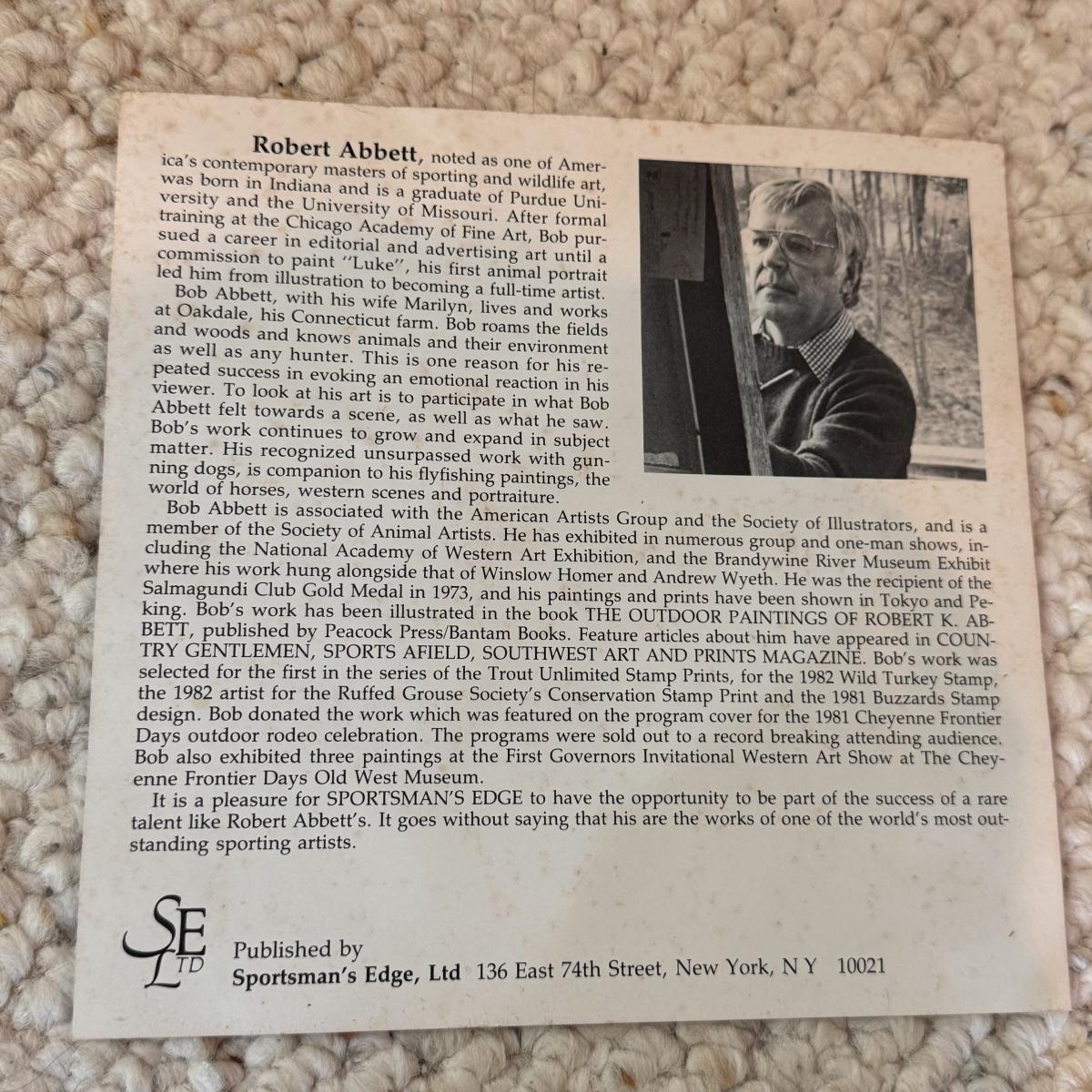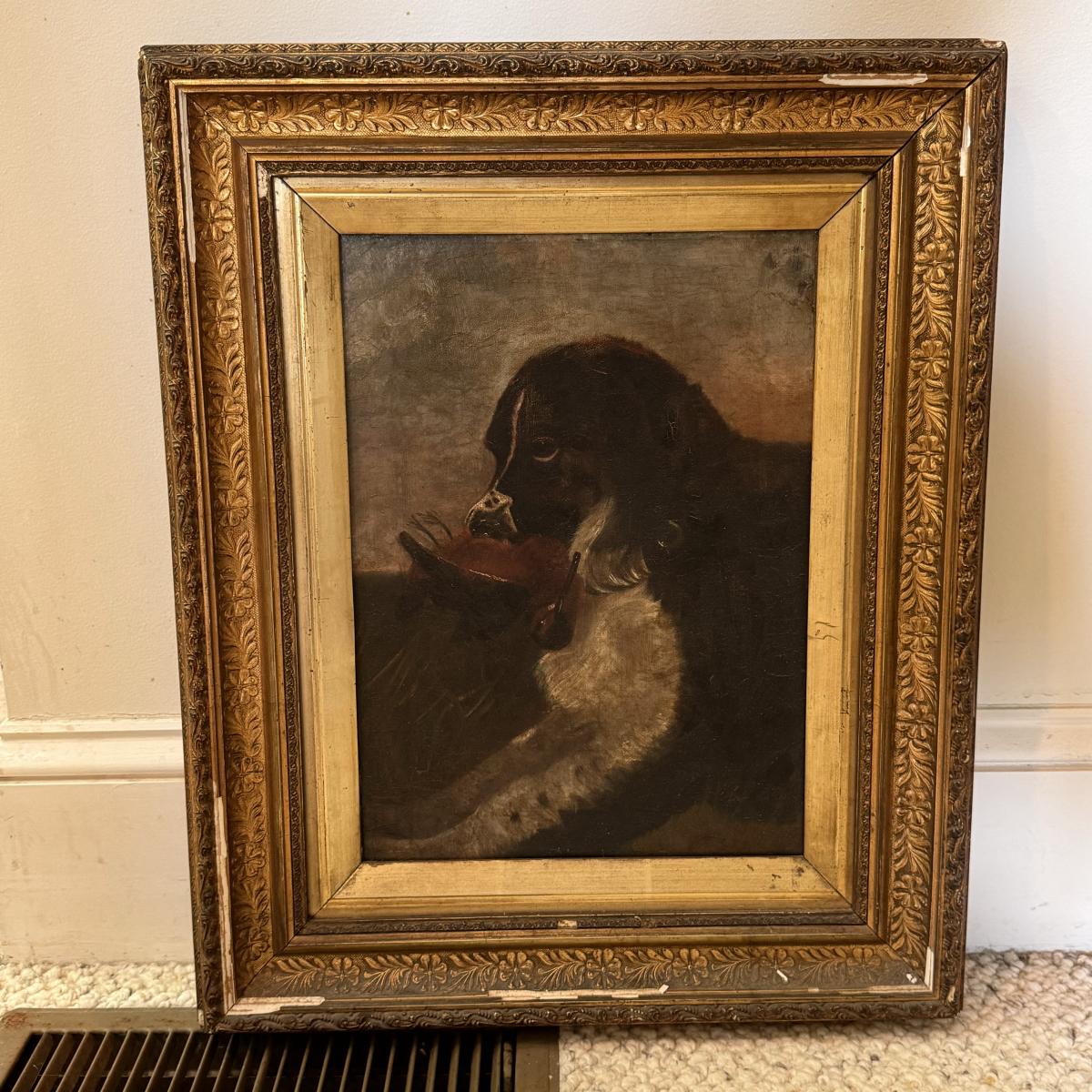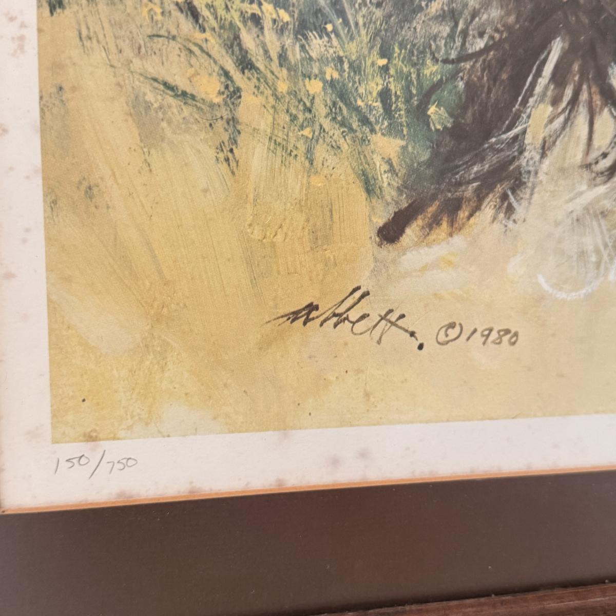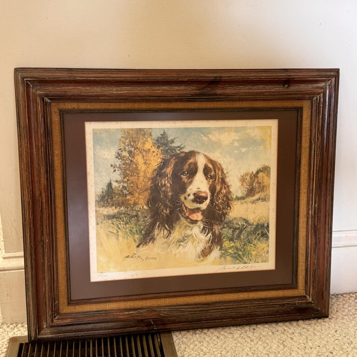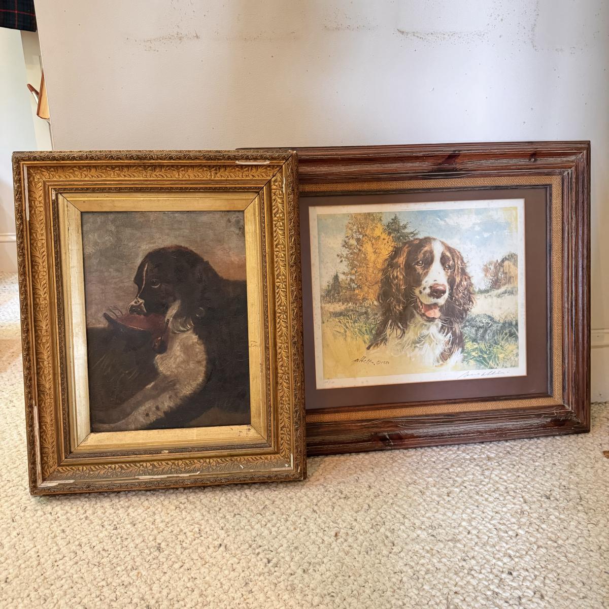 This lot includes one signed and numbered Robert Abbett print and one antique painting - both of Springer Spaniels. Both pieces of art are in wooden frames. Robert Abbett print measures 26” x 22.5”H and the other is 18” x 23”H. There are a signs of wear due to age on both pieces of art - see pictures included.
