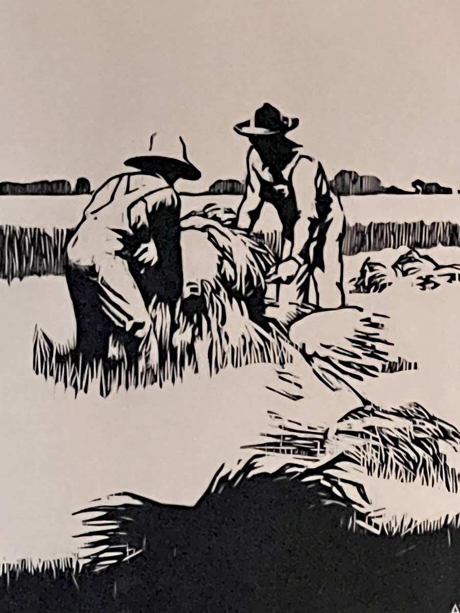 Lovely pristine contrasty depiction of two farmers shocking wheat