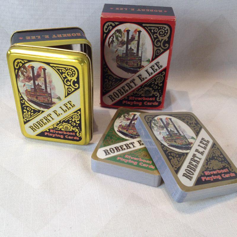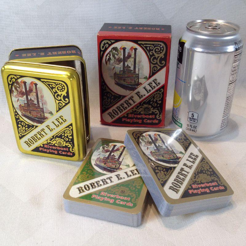This auction lot is for a nice bridge set of vintage-looking playing cards in a great tin with the nostalgic motif of the Robert E. Lee Steamboat. The cards are in their original packaging and unopened. The tin sits in a box which shows a little wear.