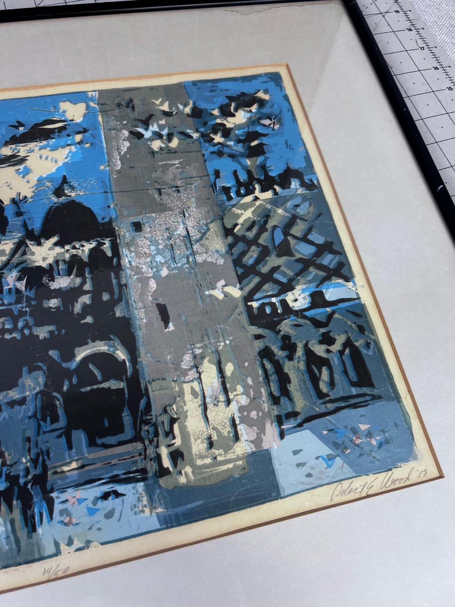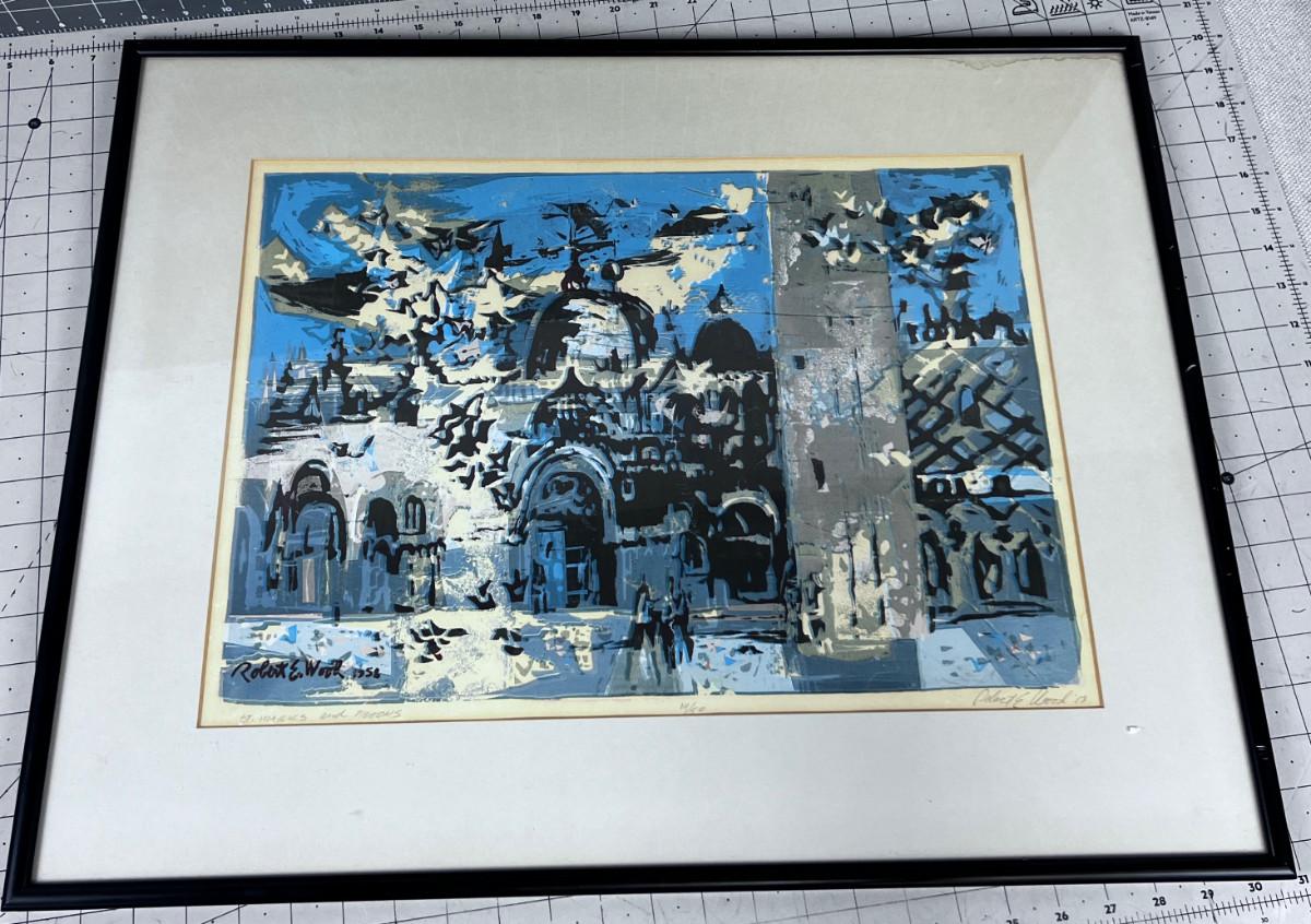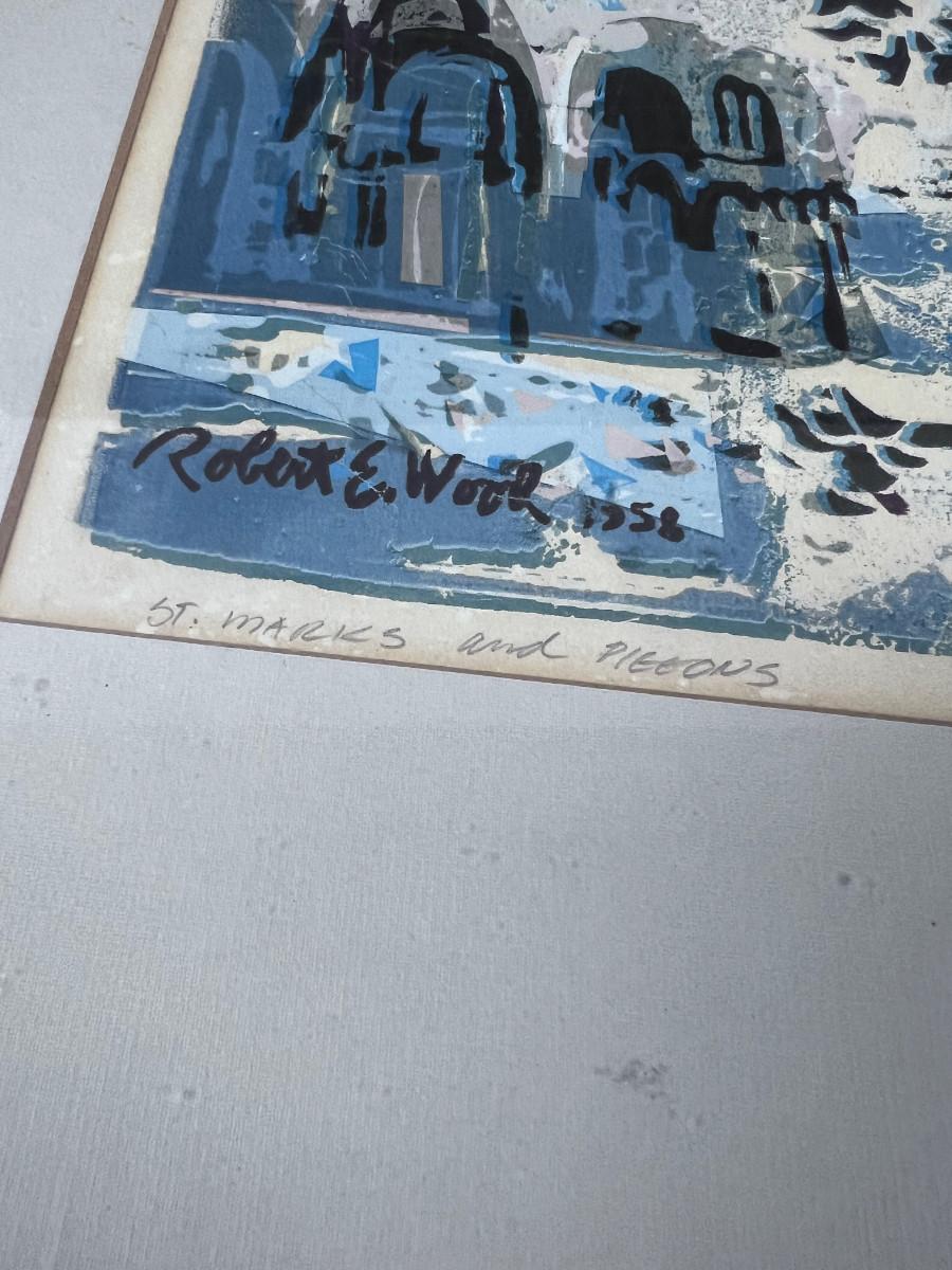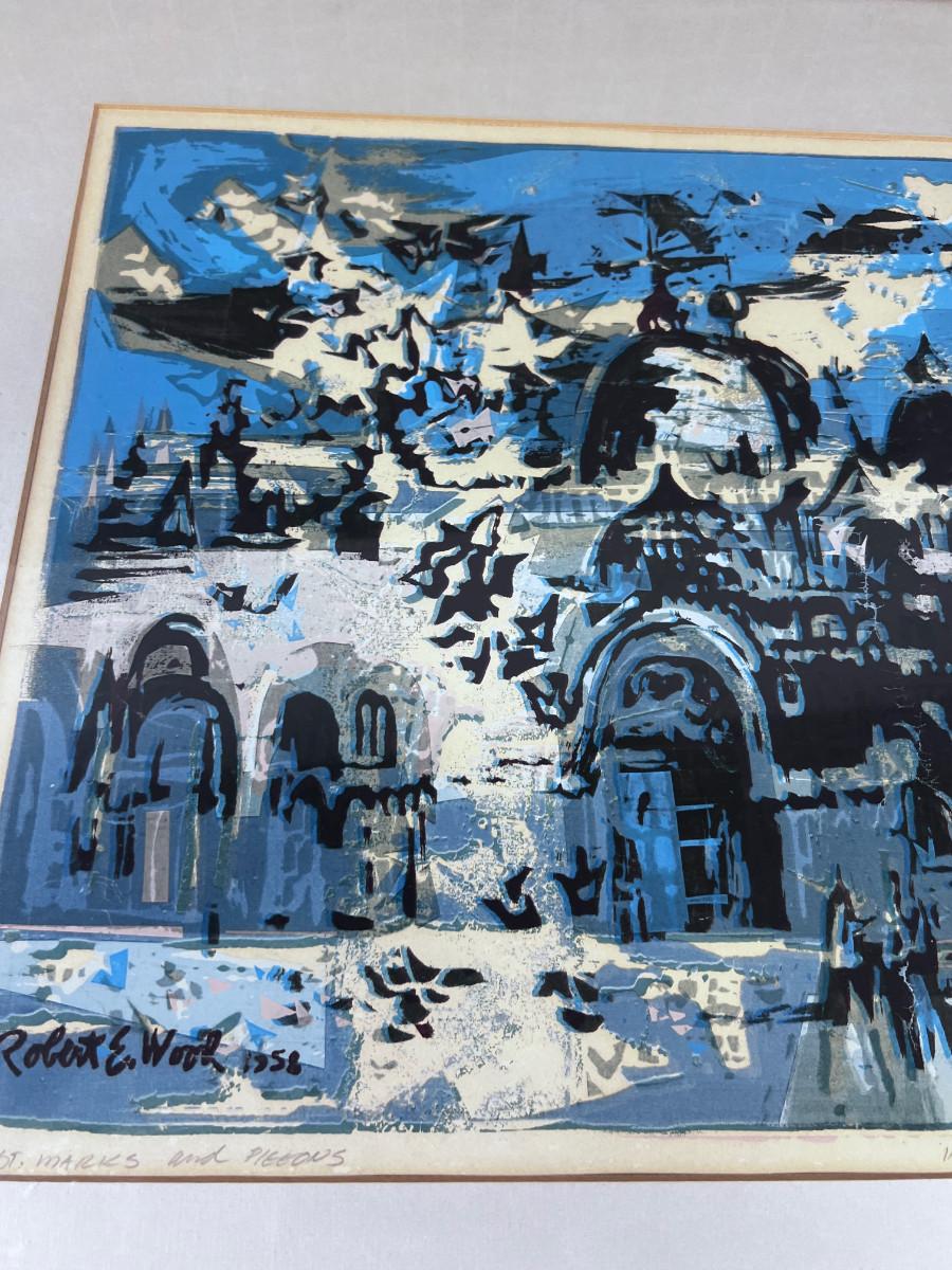 Robert E Wood Limited Serigraph Framed under Glass Title St. Marks and Pigeons Artist Signed.