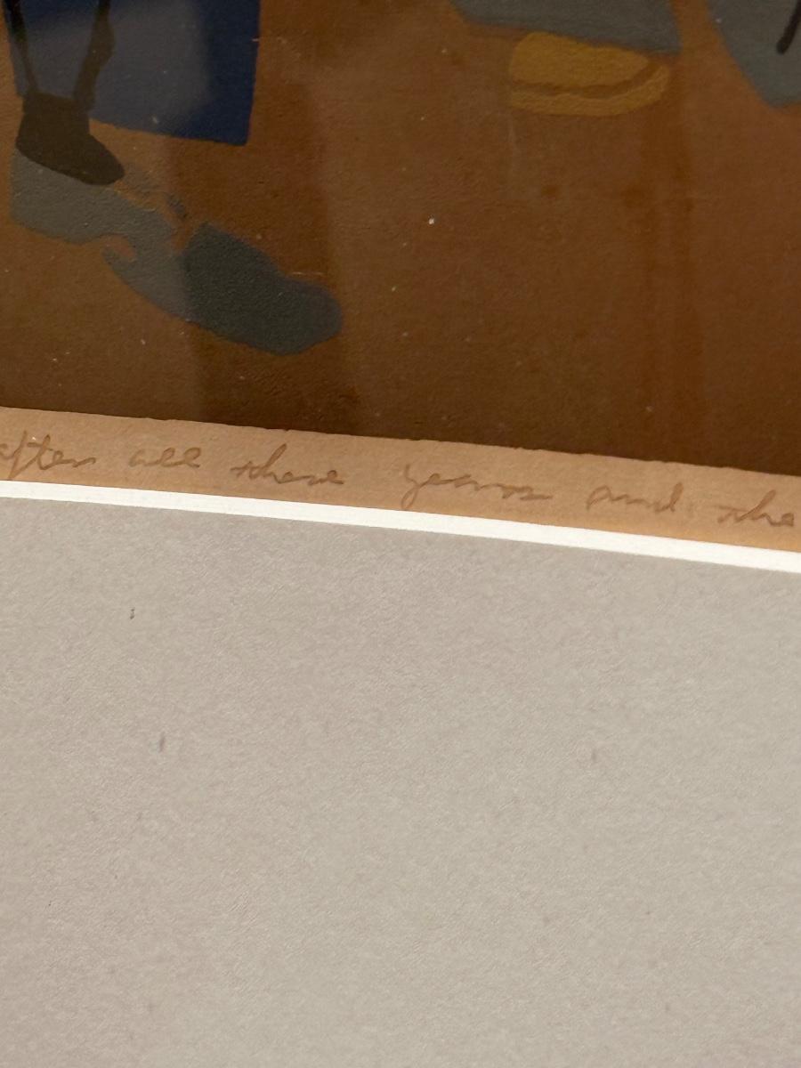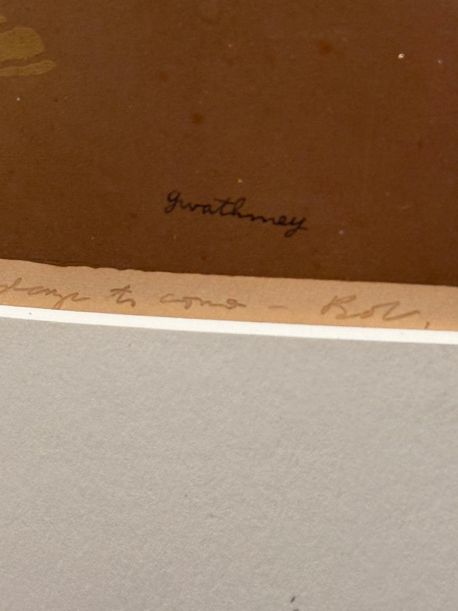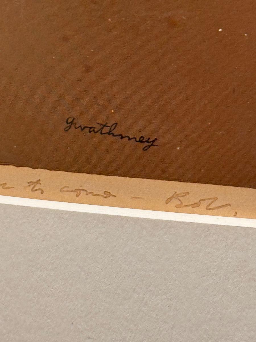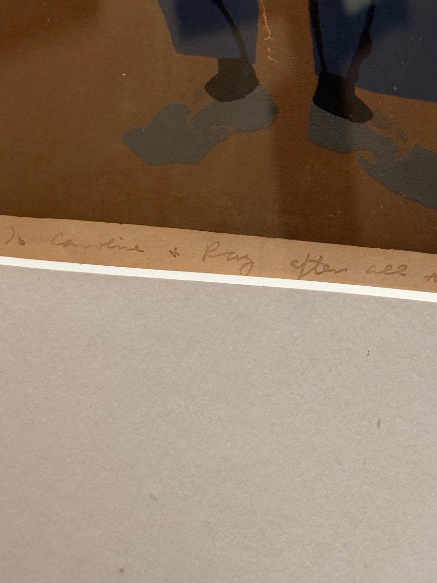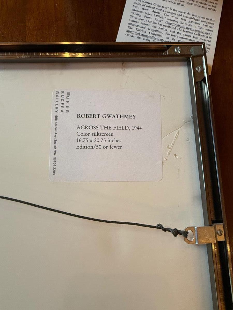 According to information found on the back, this is a color silkscreen of "Across the Field" by Robert Gwathmey. This print is inscribed to …”Caroline and Ray after all these years and the good days to come - Bob”… by the artist. The piece is matted in approximately a 5.5” cream mat, behind glass, and framed in a metal frame that measures 24.25” x 23.25”.