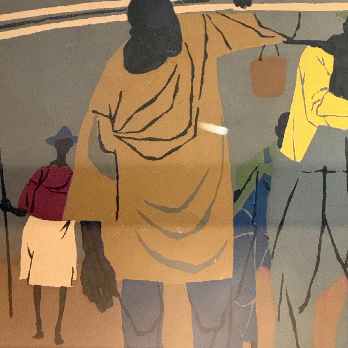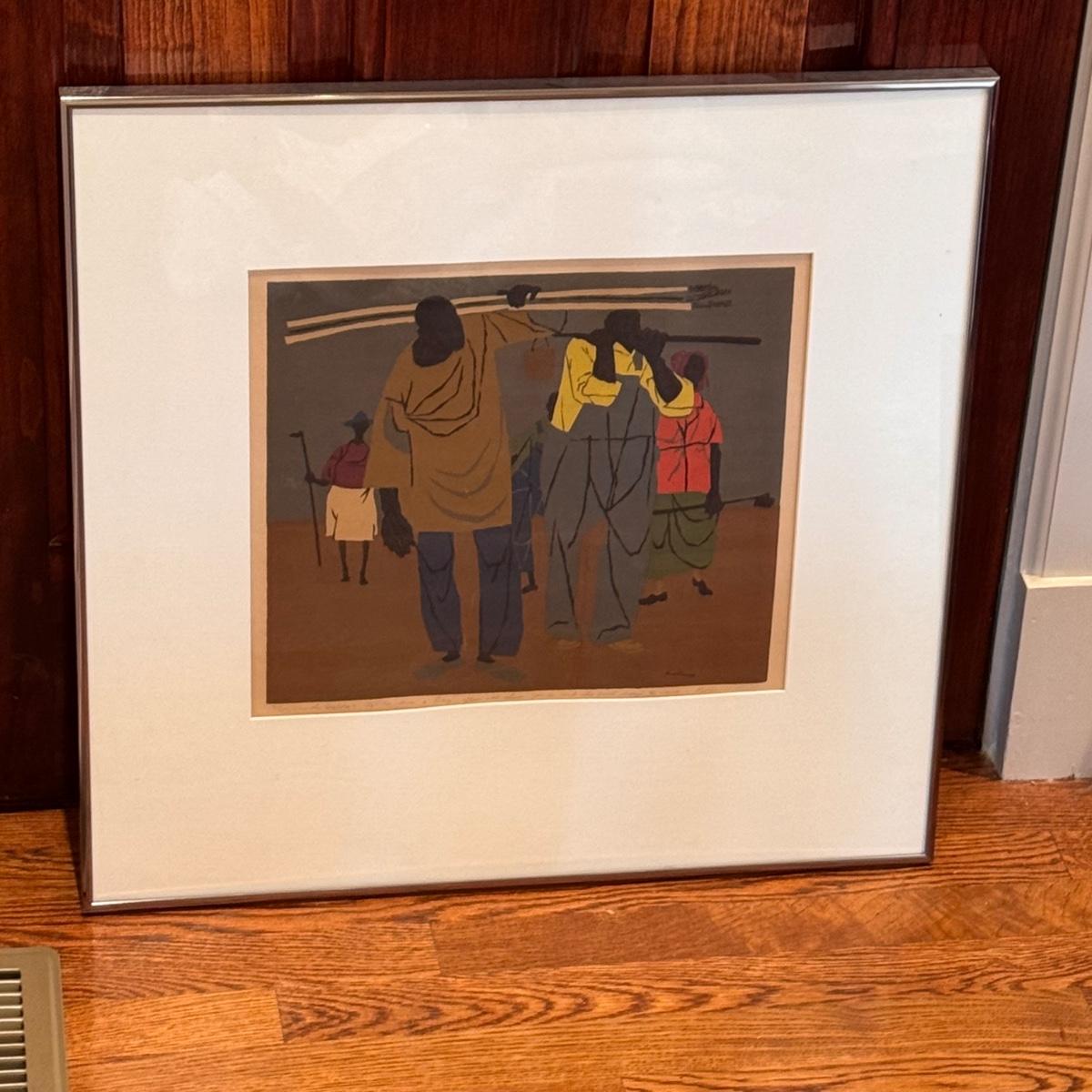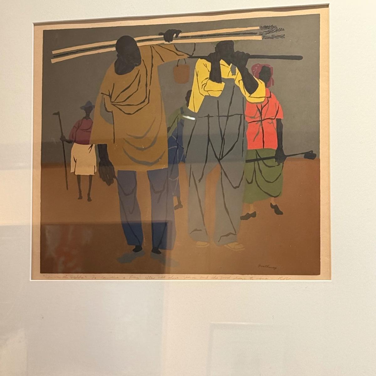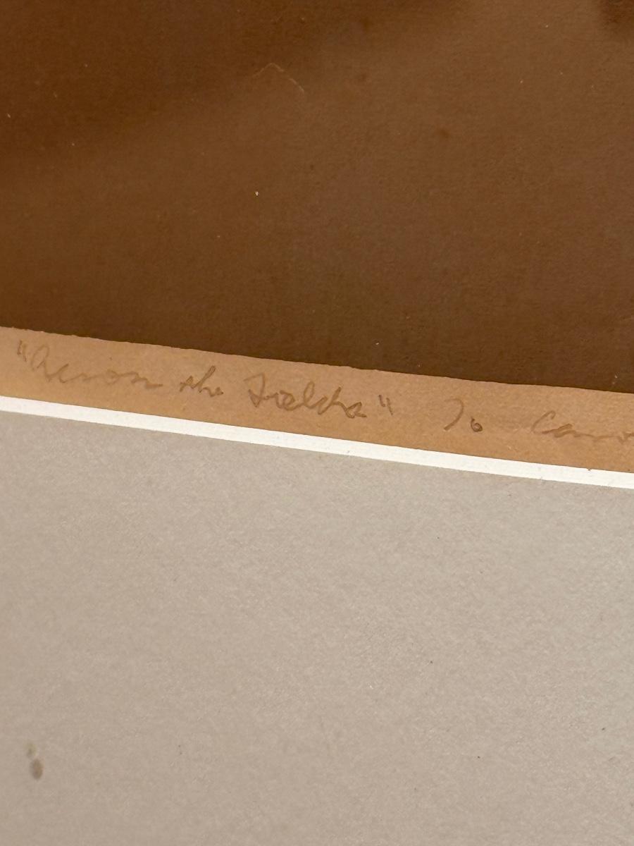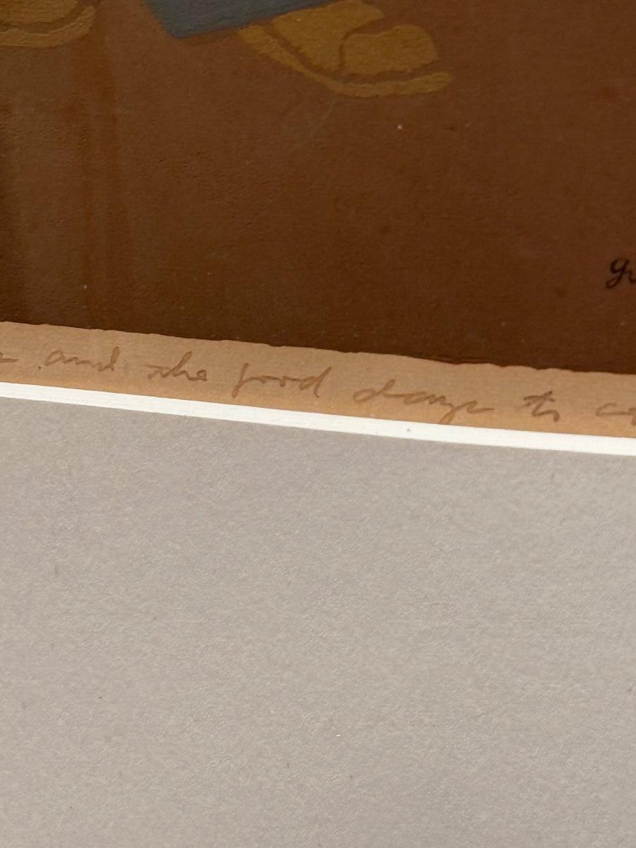 According to information found on the back, this is a color silkscreen of "Across the Field" by Robert Gwathmey. This print is inscribed to …”Caroline and Ray after all these years and the good days to come - Bob”… by the artist. The piece is matted in approximately a 5.5” cream mat, behind glass, and framed in a metal frame that measures 24.25” x 23.25”.