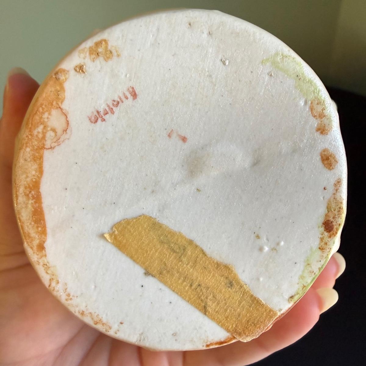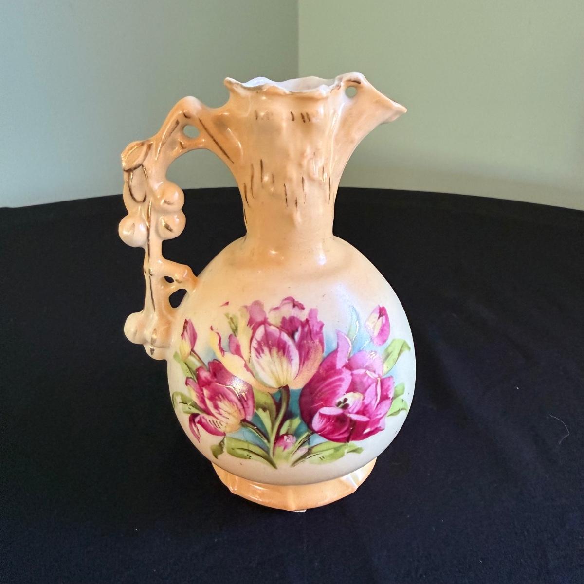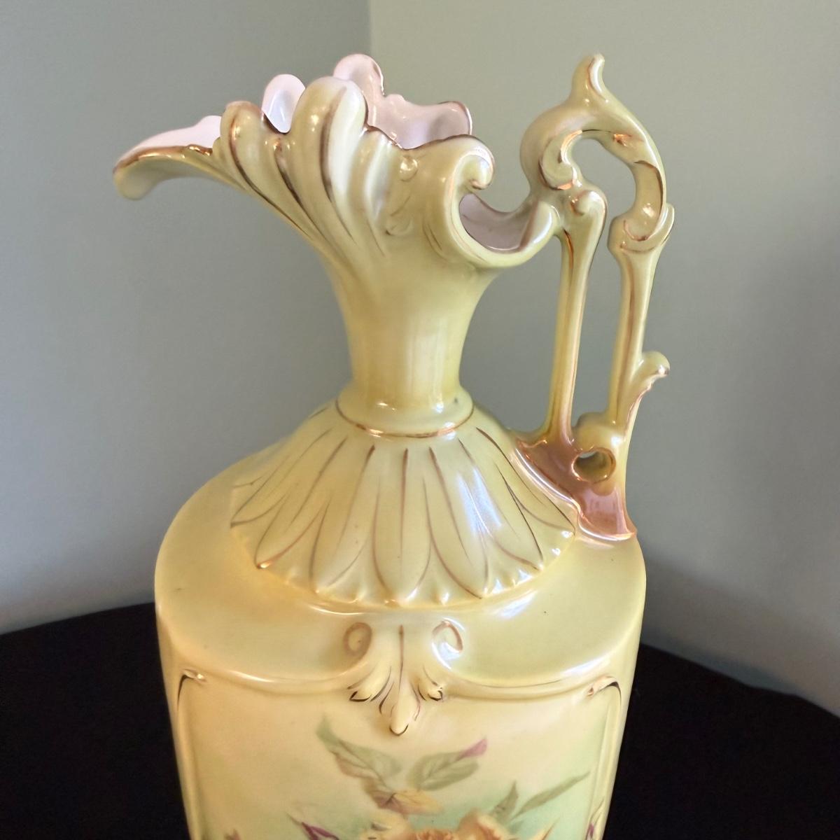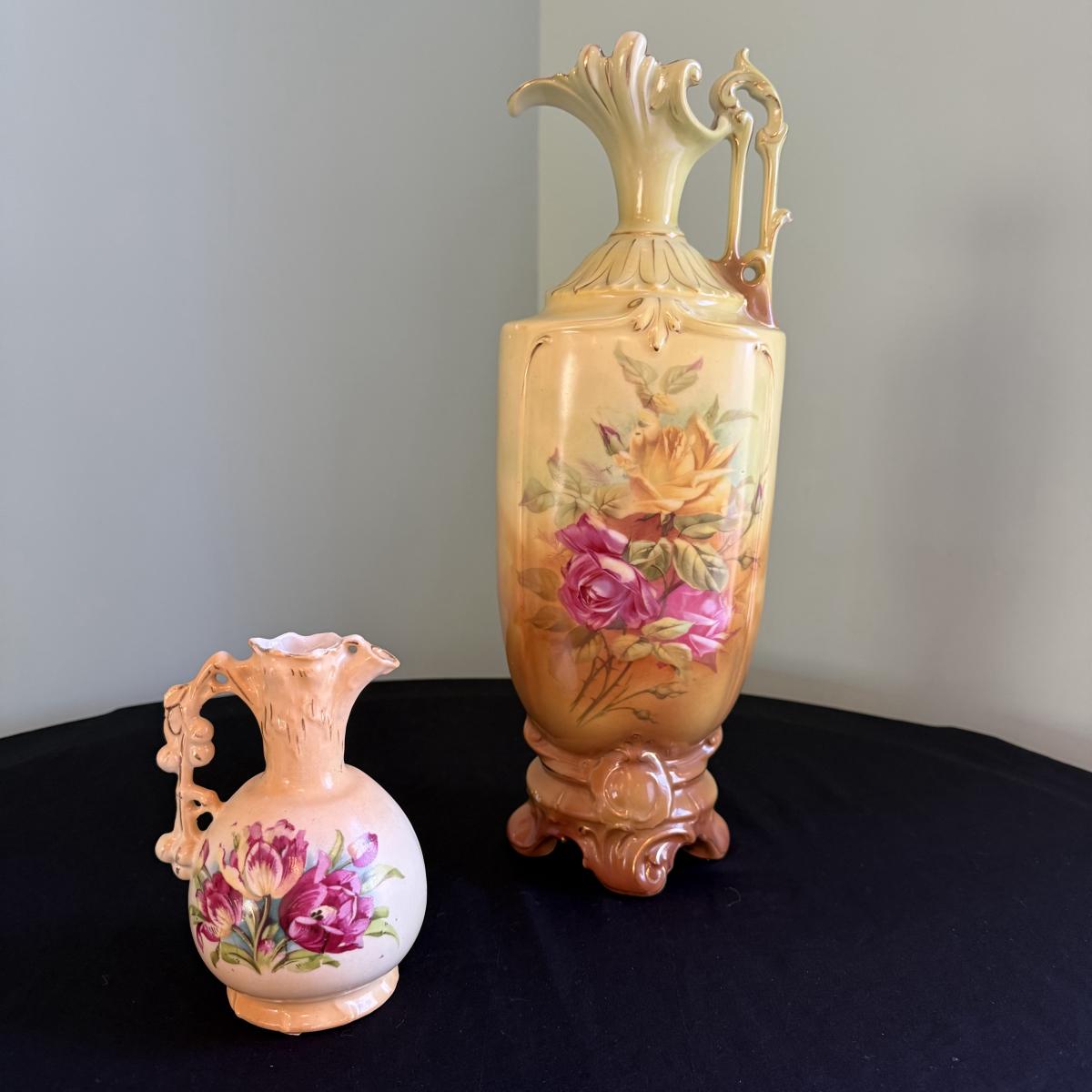 This lot contains two gorgeous vases. The first is a Robert Hanke Royal Wettina vase. This gorgeous piece features a pale yellow background with blossoming roses and an art nouveau style with the handle and footed base. This piece measures 5” x 4” x 15”H. Next we have a small pitcher vase. This piece is a blush cream also featuring blooming flowers and gilded accents. This piece is stamped but the stamp couldn’t be discerned. It measures 4” x 3.75” x 5.75”H. Shipping available.