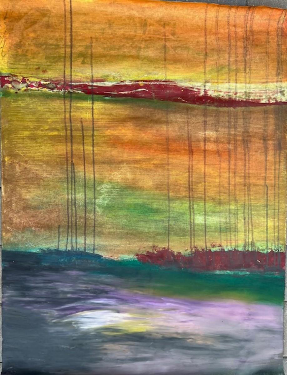 Titled "Purple Rain." Measures 41"L X 31" W. This piece is unframed, and has been rolled for storage.