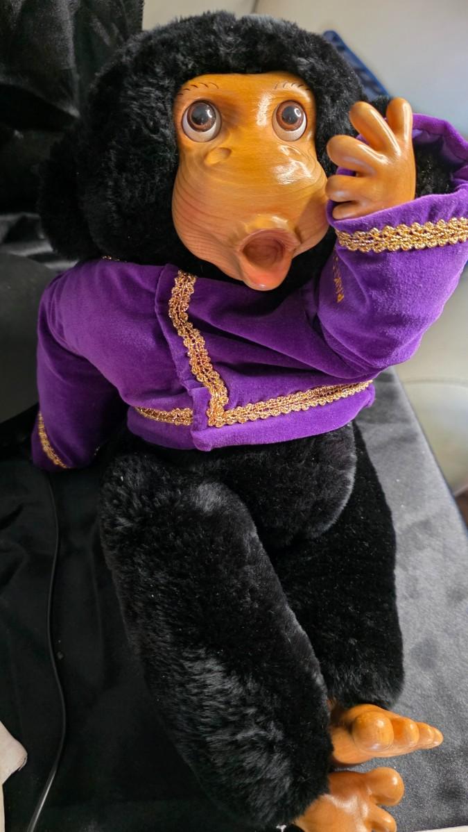 In the spotlight's electric blaze, where the big top pulses with the roar of the crowd and the scent of popcorn lingers like a promise of wonder, Maurice the Ringmaster Monkey commands the ring—a plush figure in regal purple velvet trimmed with golden braid, his black fur coat gleaming under imaginary spotlights, fez perched at a jaunty angle, mouth open in a triumphant call that echoes the thrill of the finale. The wooden paws and face, carved with mischievous precision, grip an invisible whip, while the sequined jacket catches every imagined flash, evoking the chaotic joy of acrobats soaring and lions leaping in perfect anarchy.