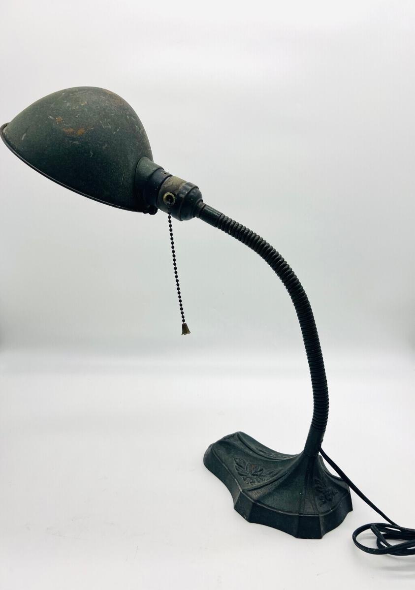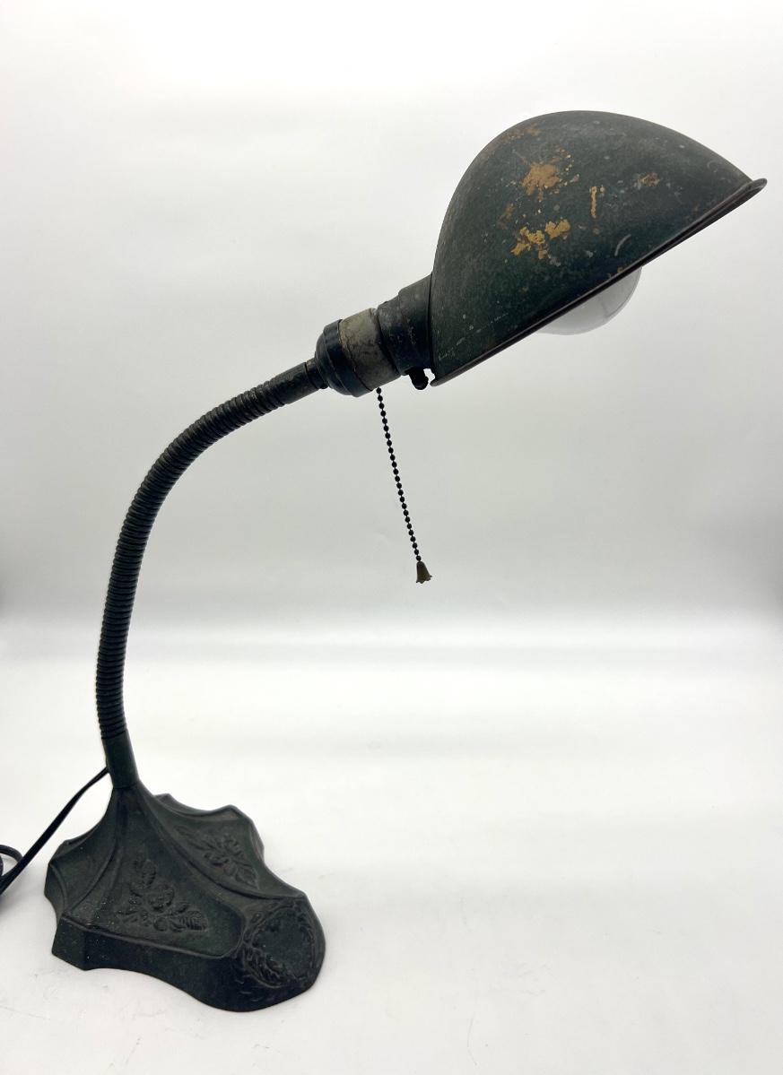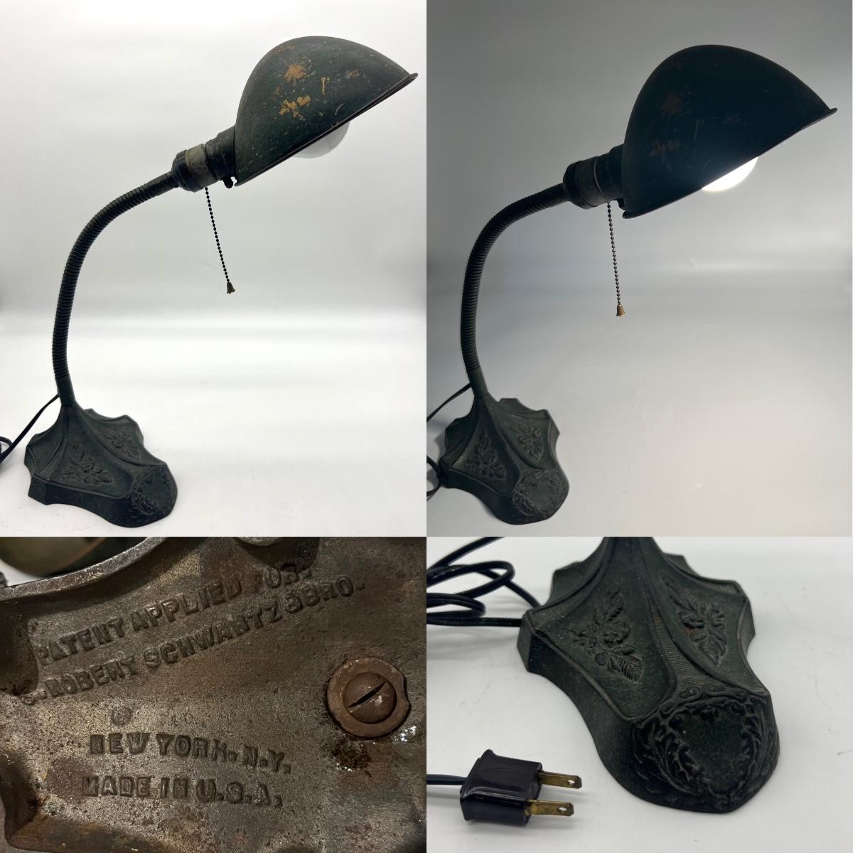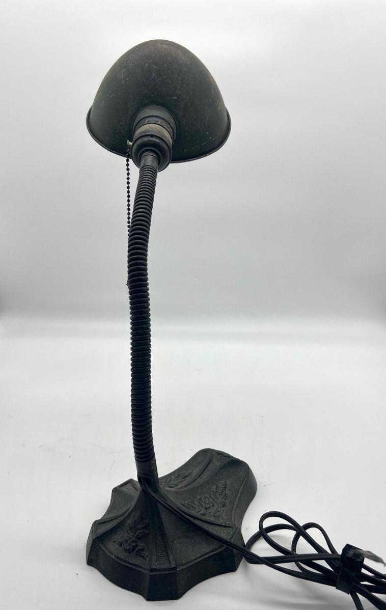 Antique metal gooseneck light, Robert Schwartz Brother desk lamp, with an ornate cast iron base, circa 1920s. As pictured measures 18 inches tall, base measures 8 inches at its longest.