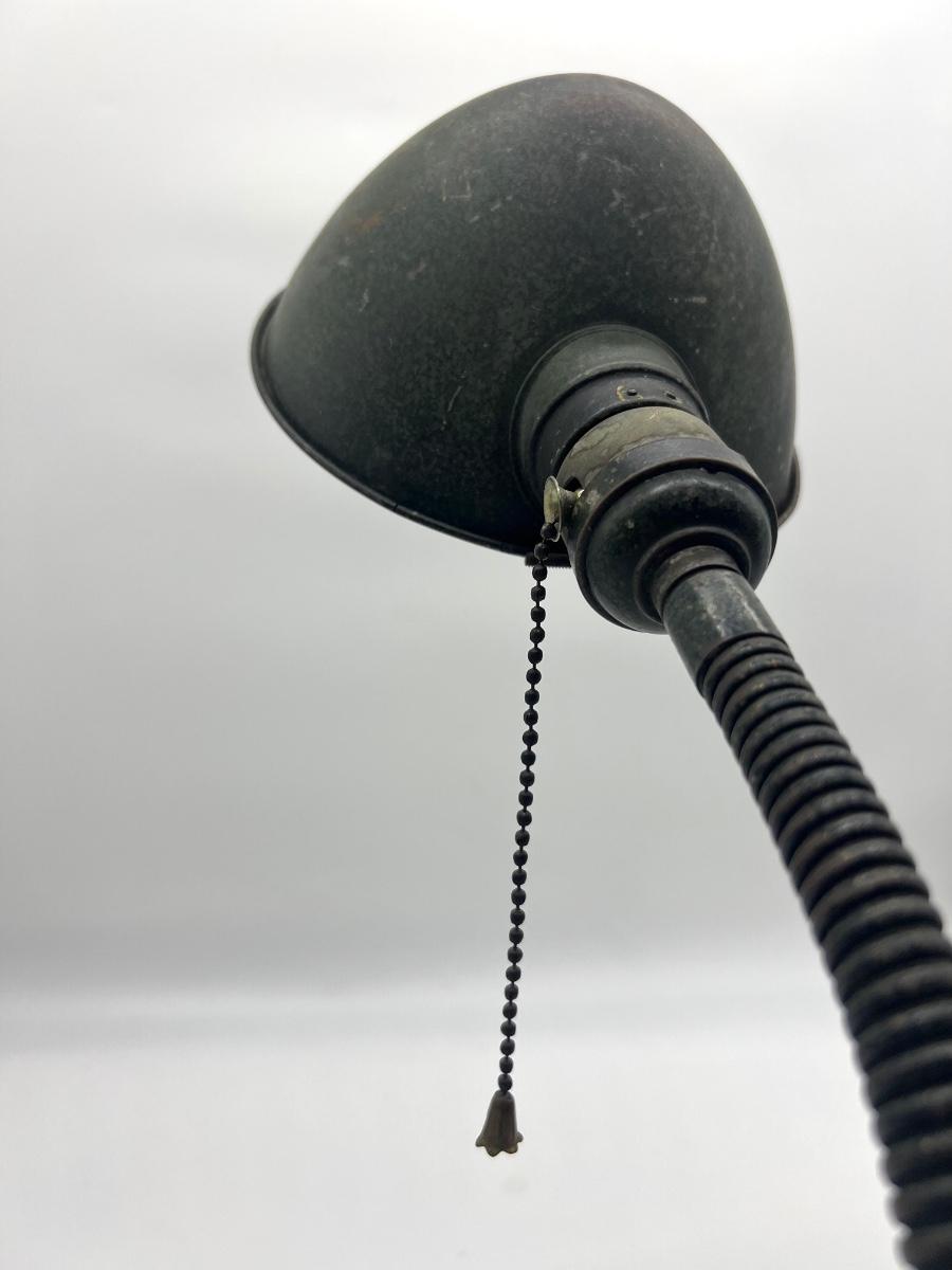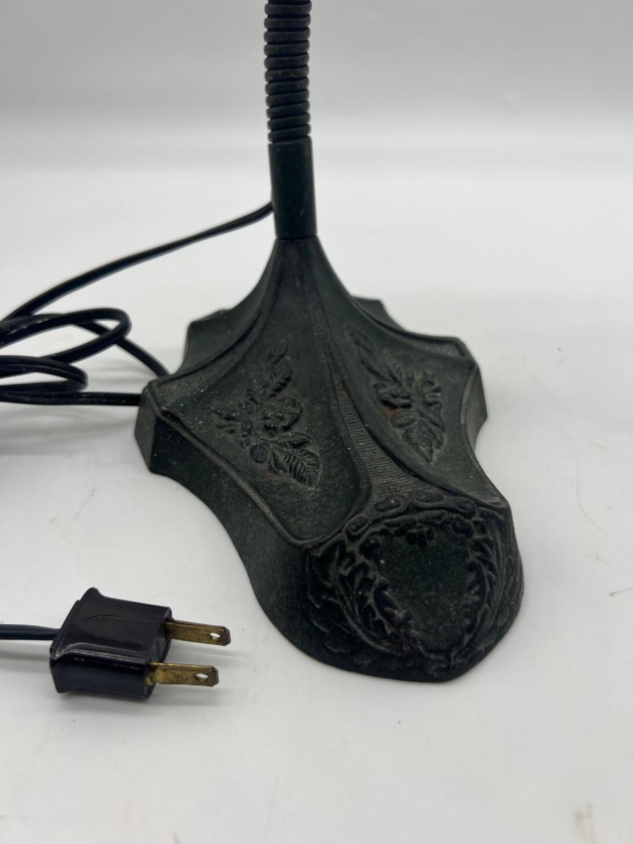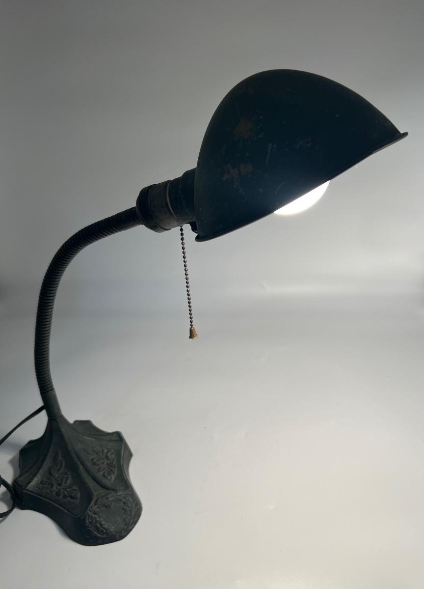 Antique metal gooseneck light, Robert Schwartz Brother desk lamp, with an ornate cast iron base, circa 1920s. As pictured measures 18 inches tall, base measures 8 inches at its longest.