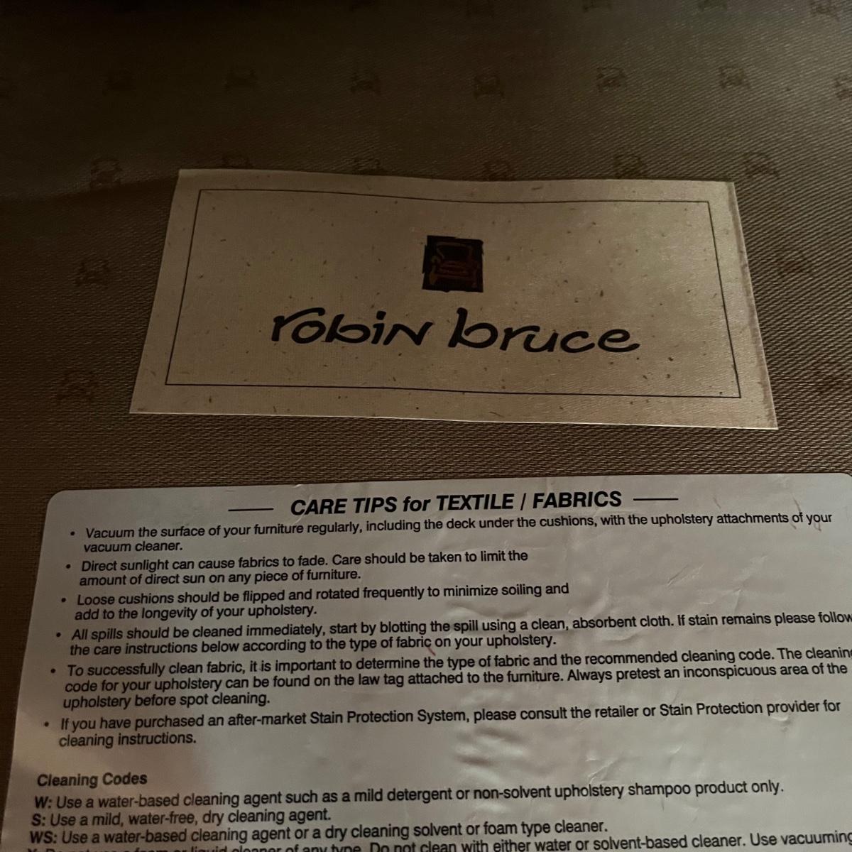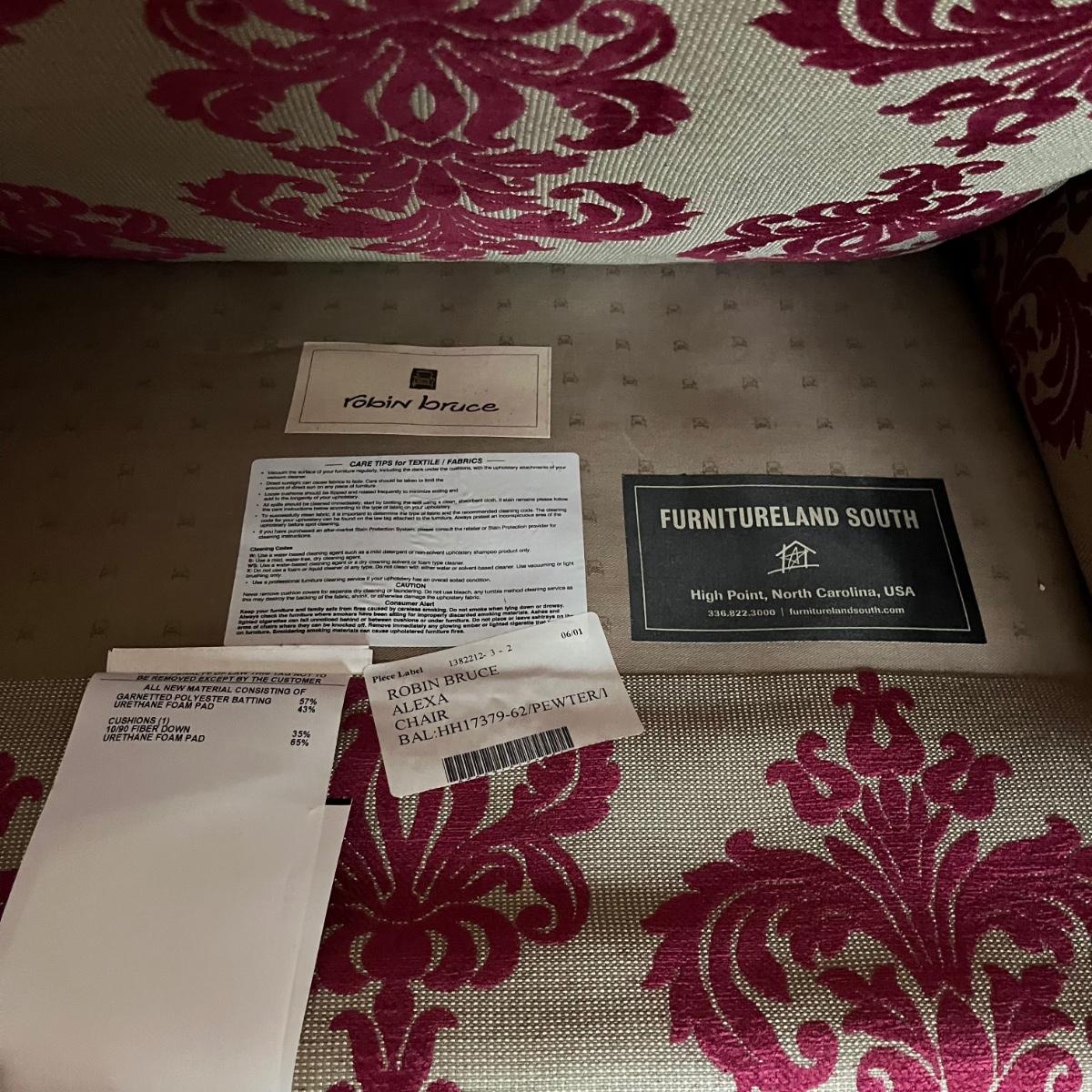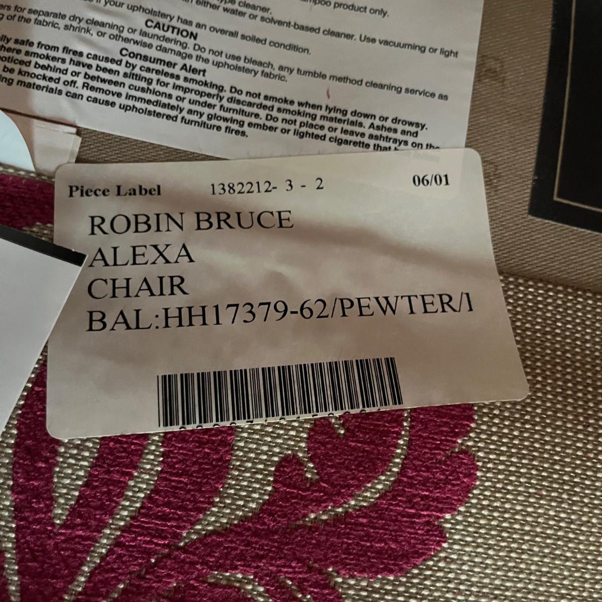 Lot includes a Robin Bruce padded and upholstered chair with casters on the front Alexa Chair. Also includes matching pillow. Chair measures 29” x 33” x 41” with a seat height of 21”.