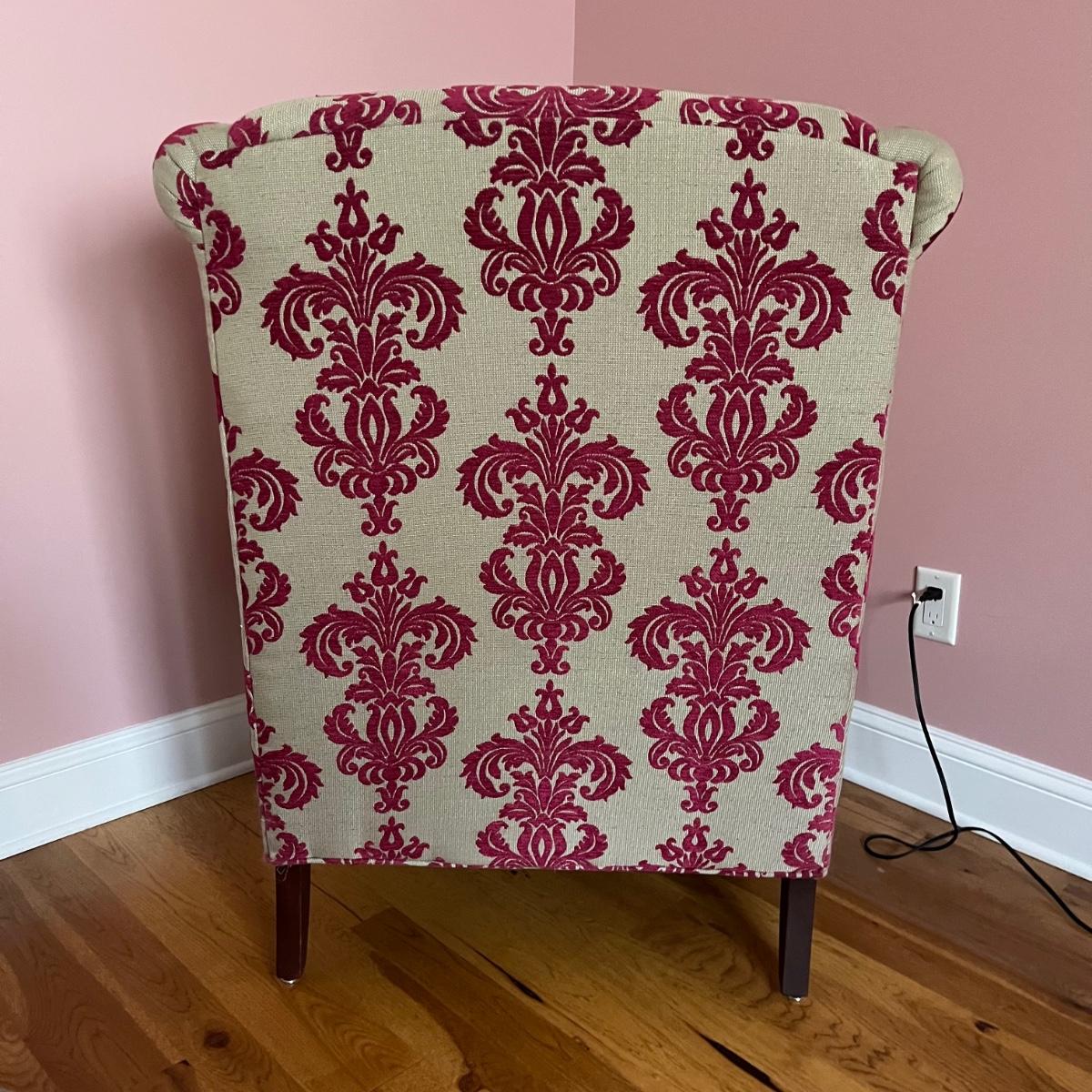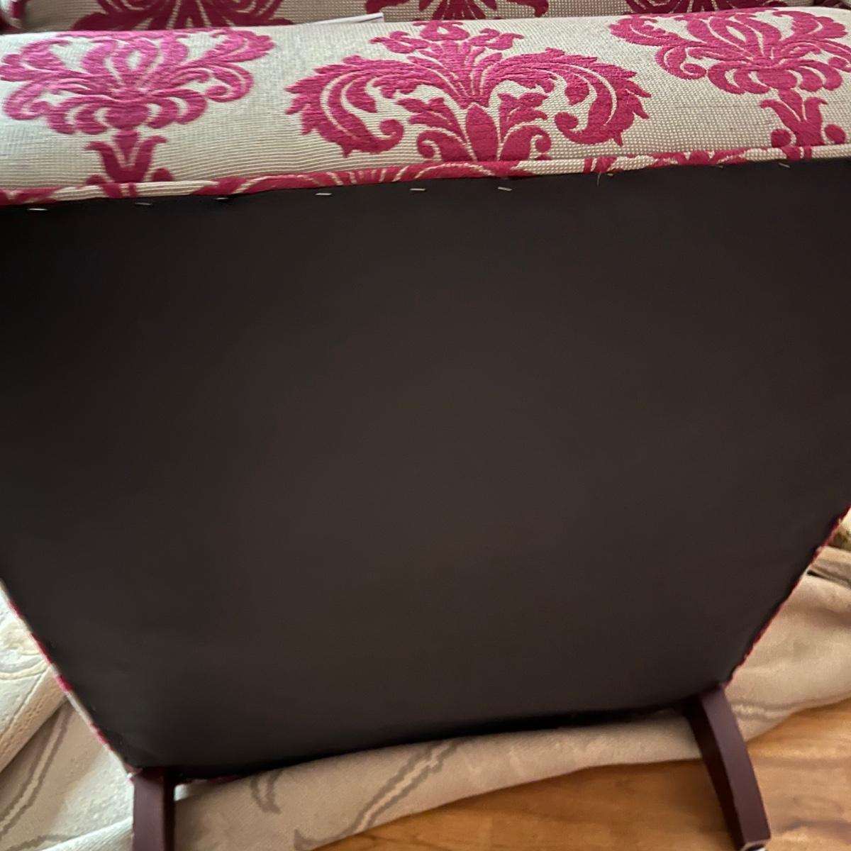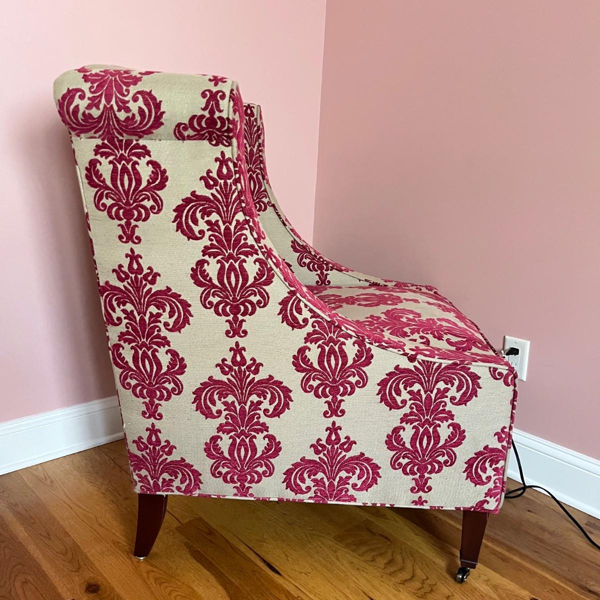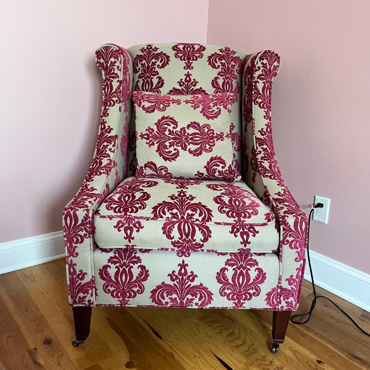 Lot includes a Robin Bruce padded and upholstered chair with casters on the front Alexa Chair. Also includes matching pillow. Chair measures 29” x 33” x 41” with a seat height of 21”.