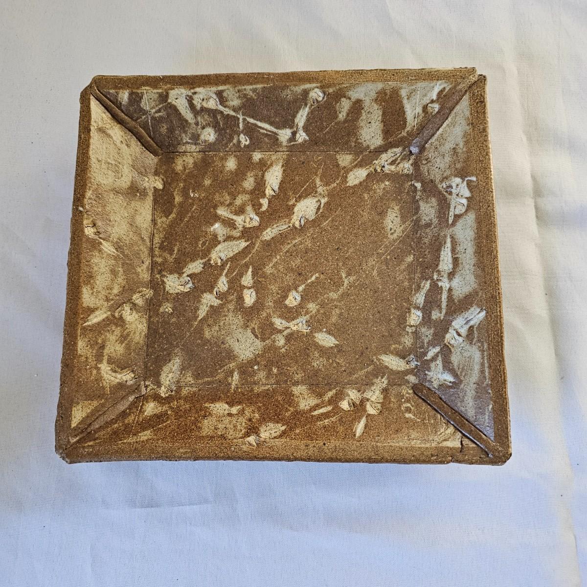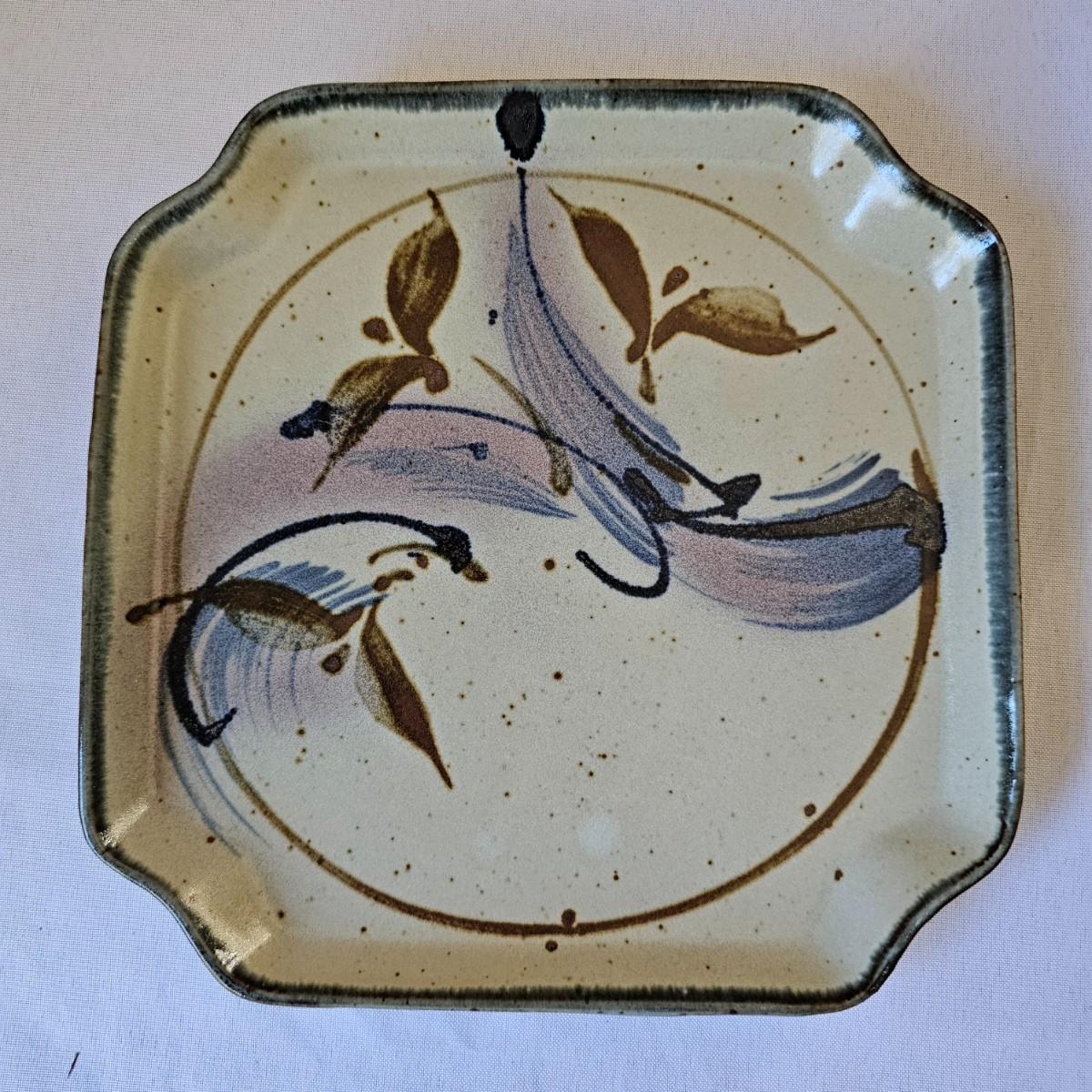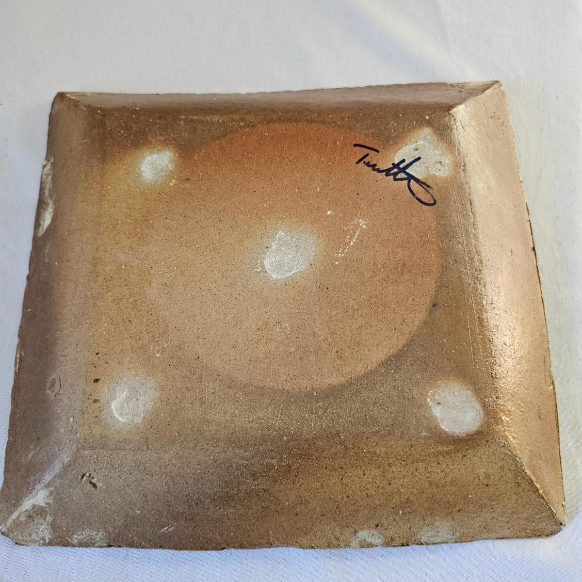 Two plates in browns and tans that appear to be Robin Cage Pottery. Large plate measures 11"SQ. Marked on the bottoms. A hand formed piece with turned up corners, very rough and textured, 10" x 10" x 1.5". The small bowls measures 4.5"D x 3"H. See photos for markings and other details. Shipping available.