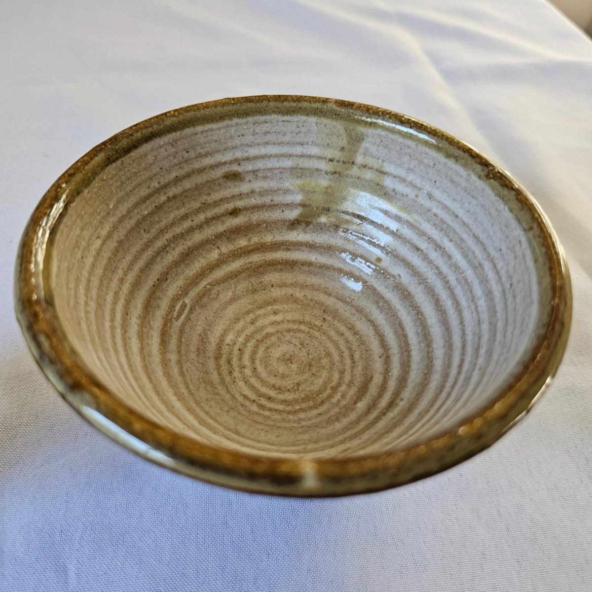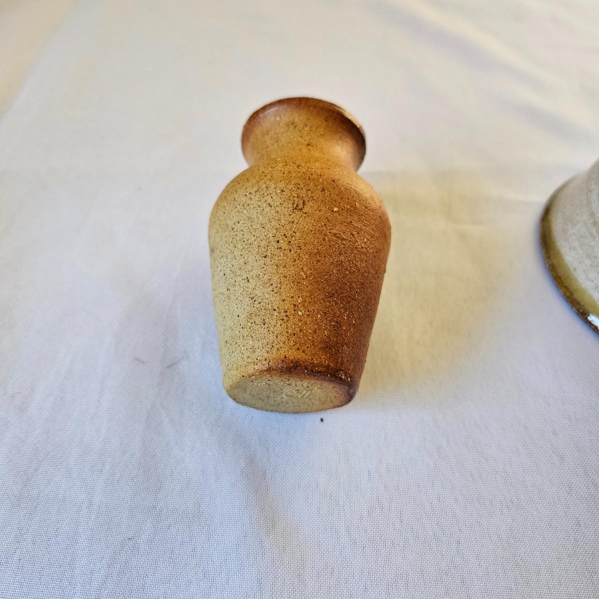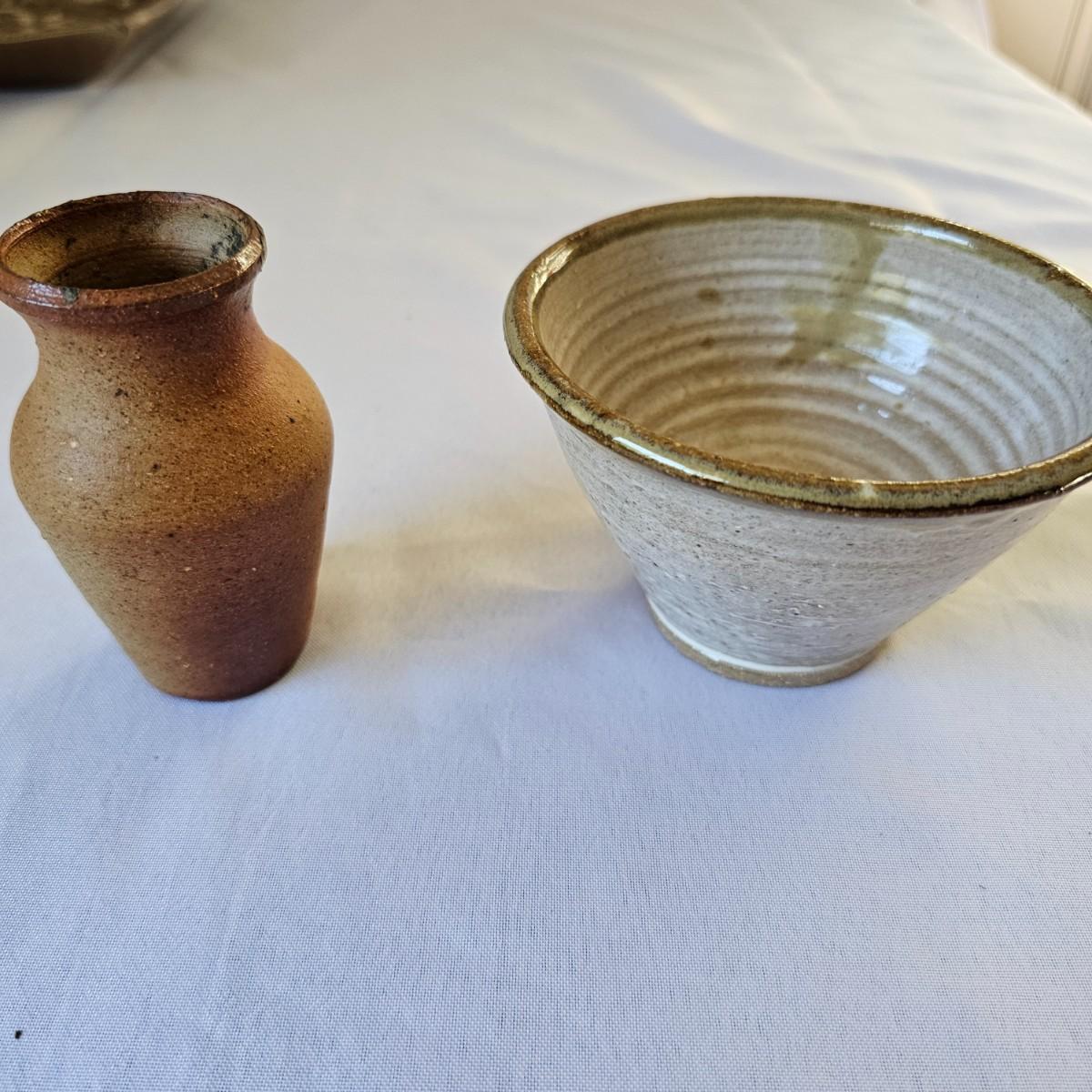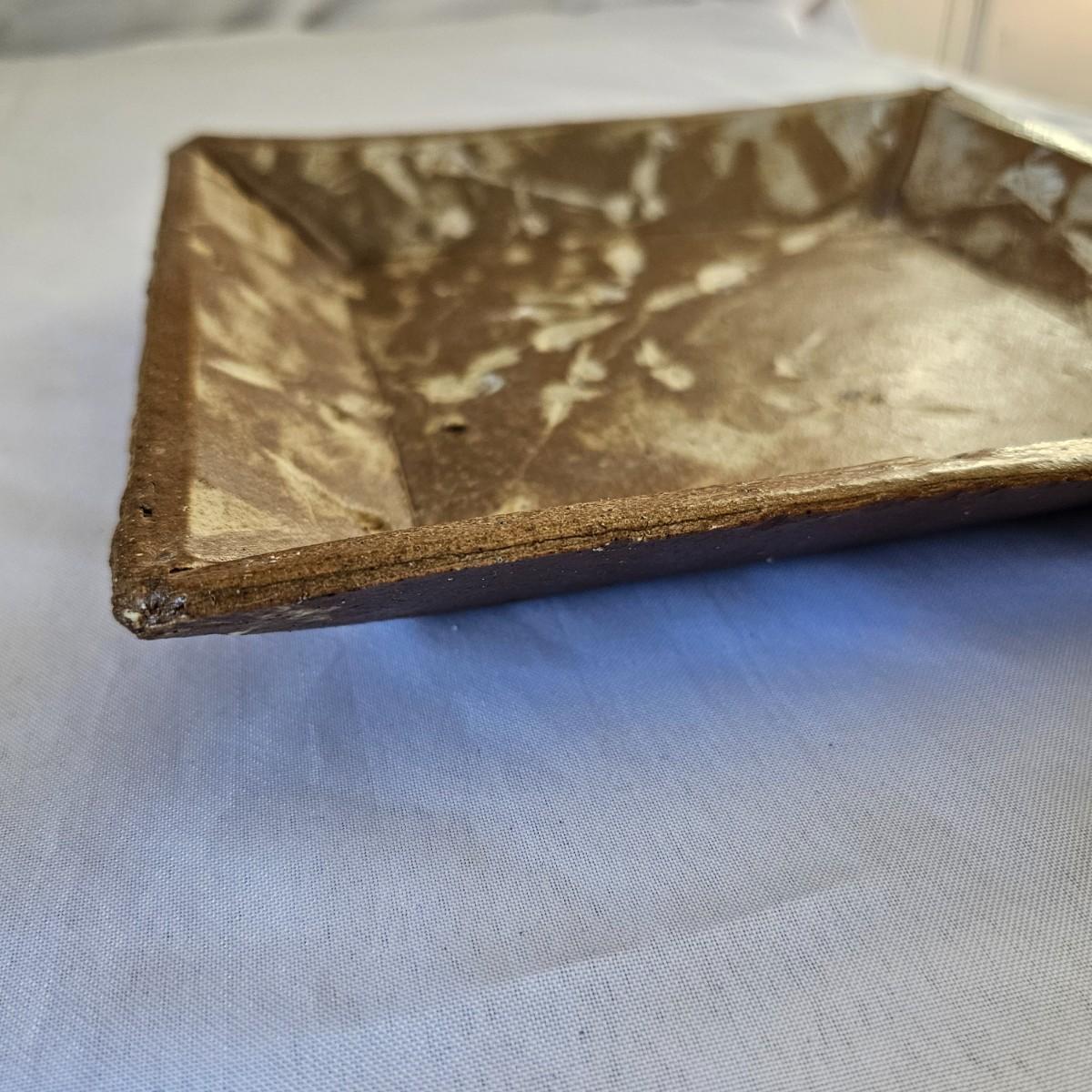 Two plates in browns and tans that appear to be Robin Cage Pottery. Large plate measures 11"SQ. Marked on the bottoms. A hand formed piece with turned up corners, very rough and textured, 10" x 10" x 1.5". The small bowls measures 4.5"D x 3"H. See photos for markings and other details. Shipping available.