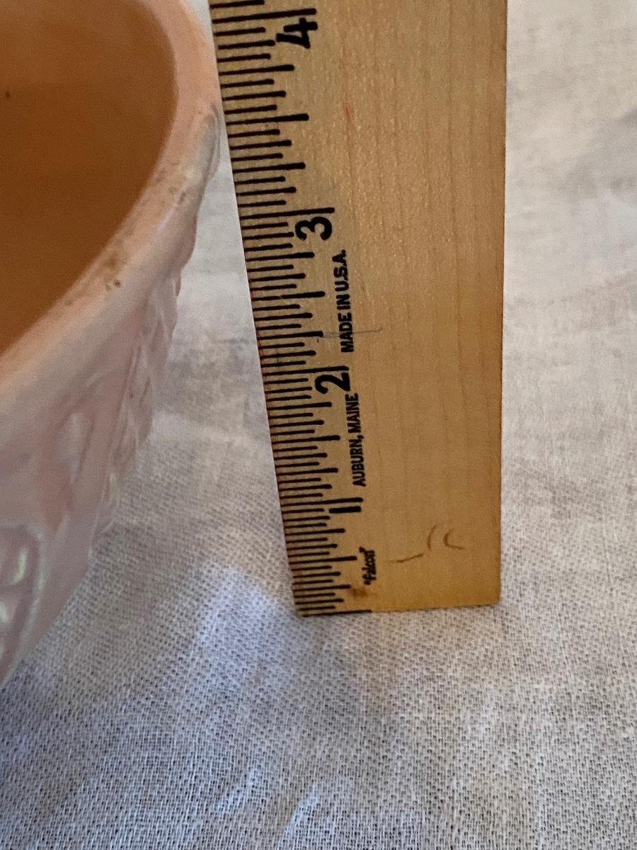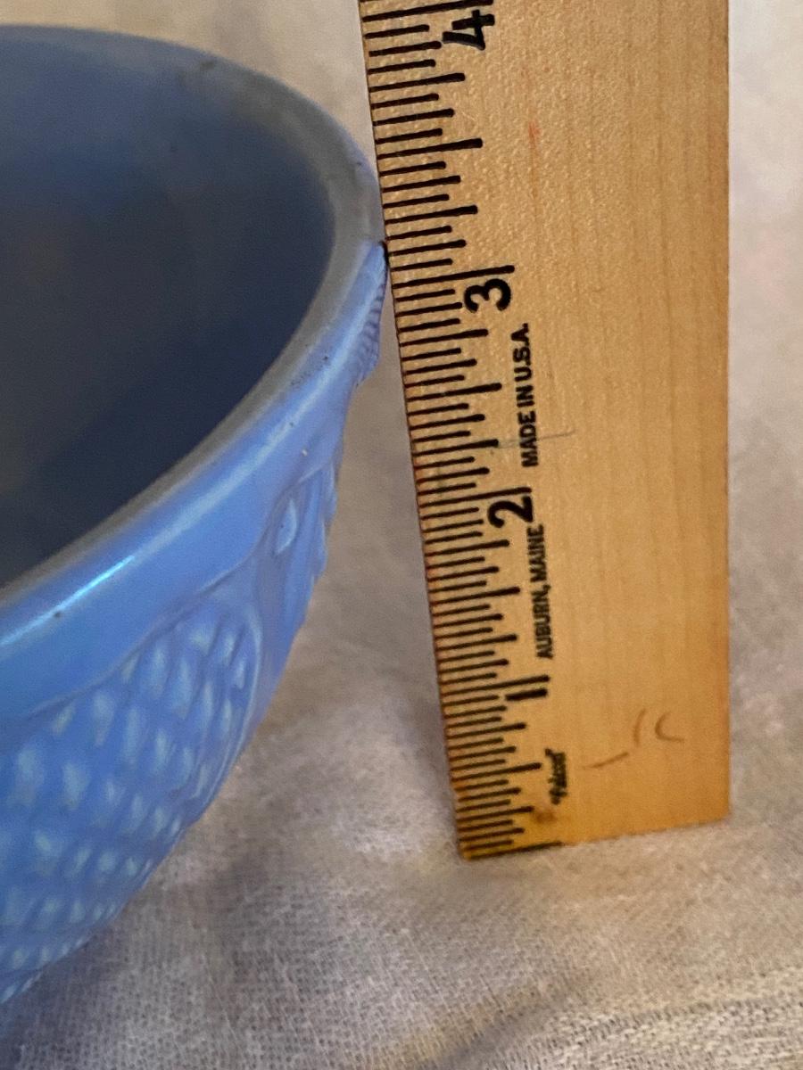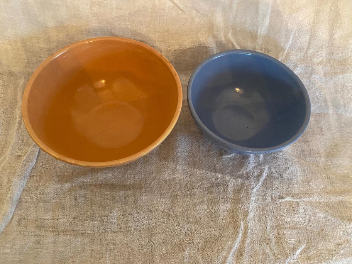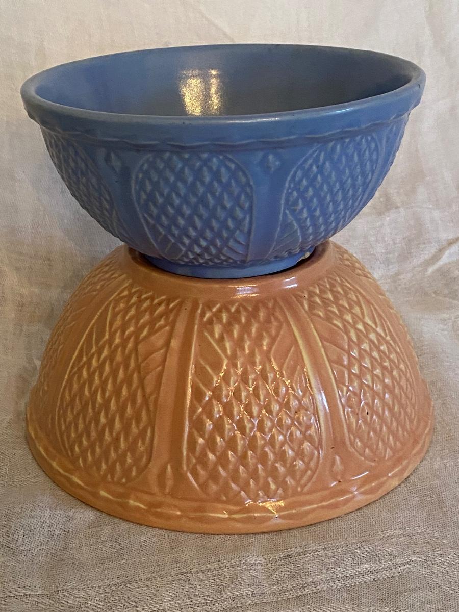 Robinson Ransbottom 8 and 6.5" inch Bowls, Diamond Hobnail. Has a pretty raised diamond hobnail design and warm glaze. The bowl is in vintage condition with signs of past batters stirred, but no cracks or chips.
