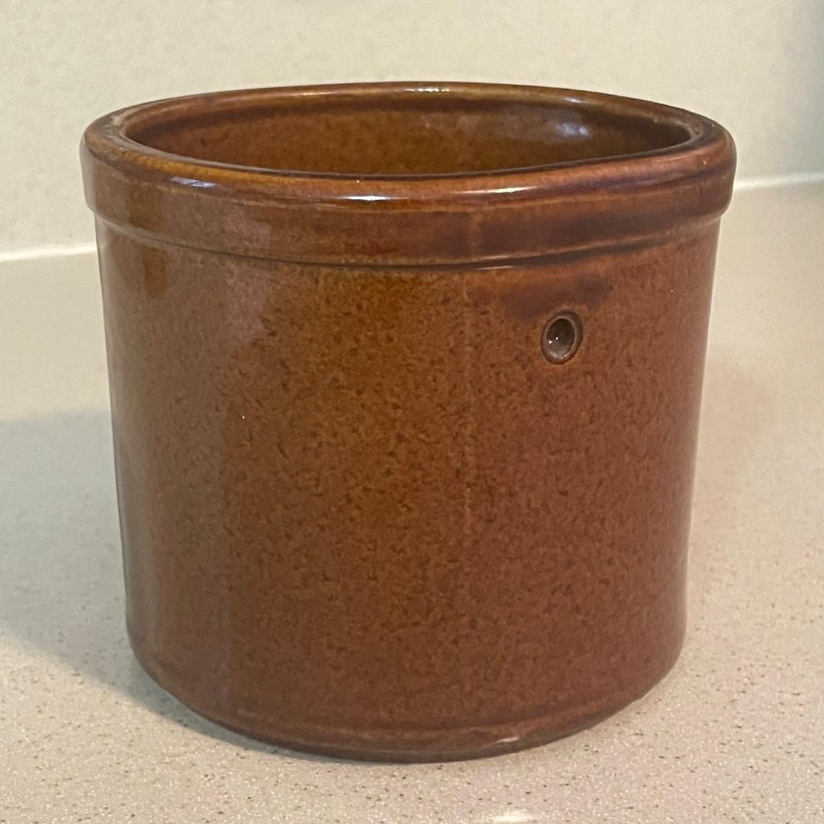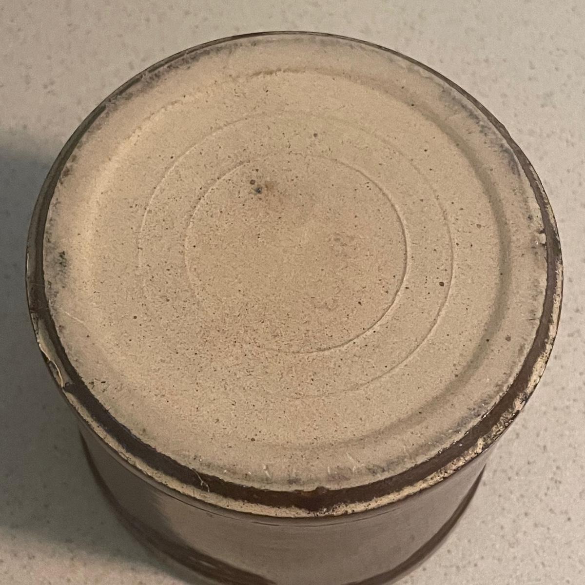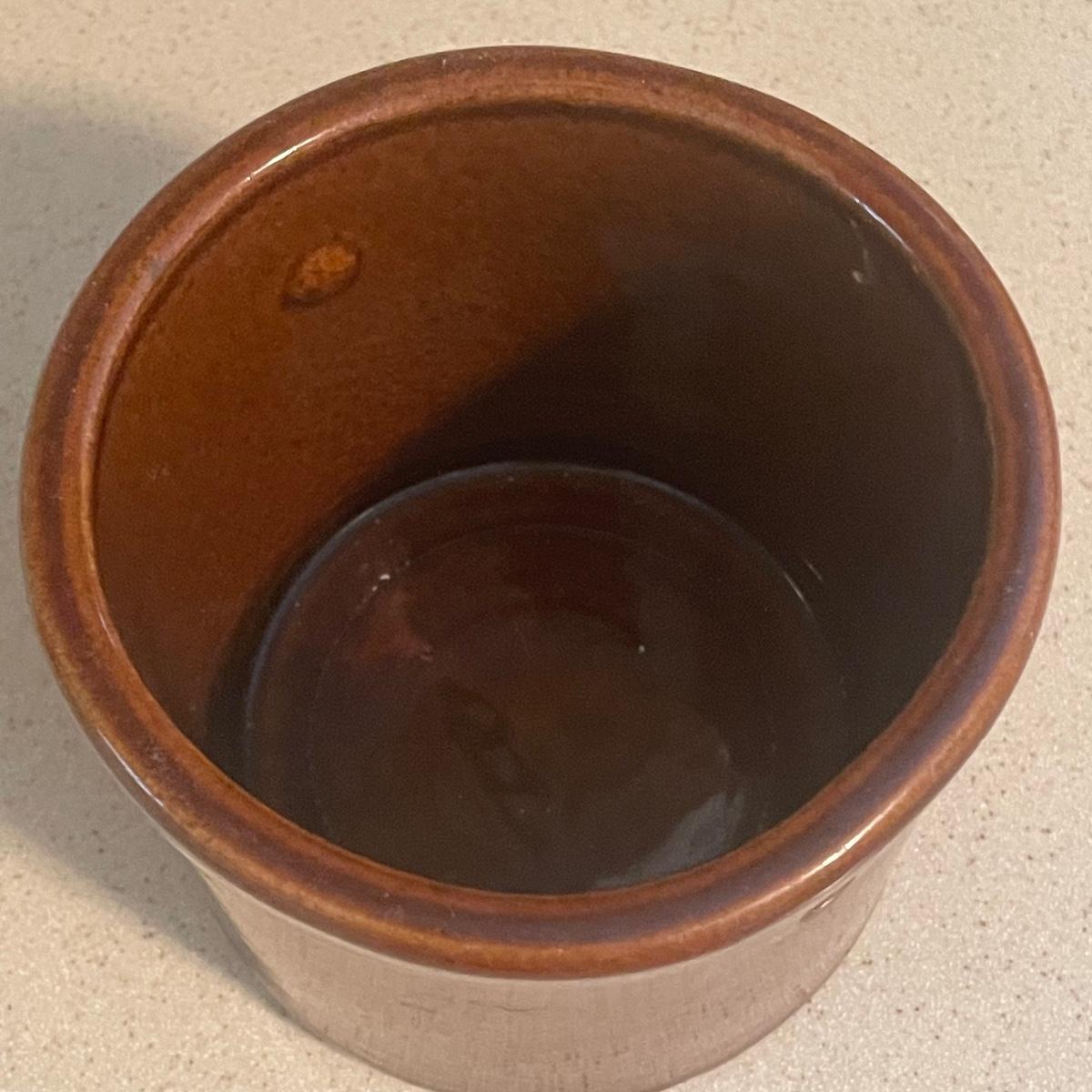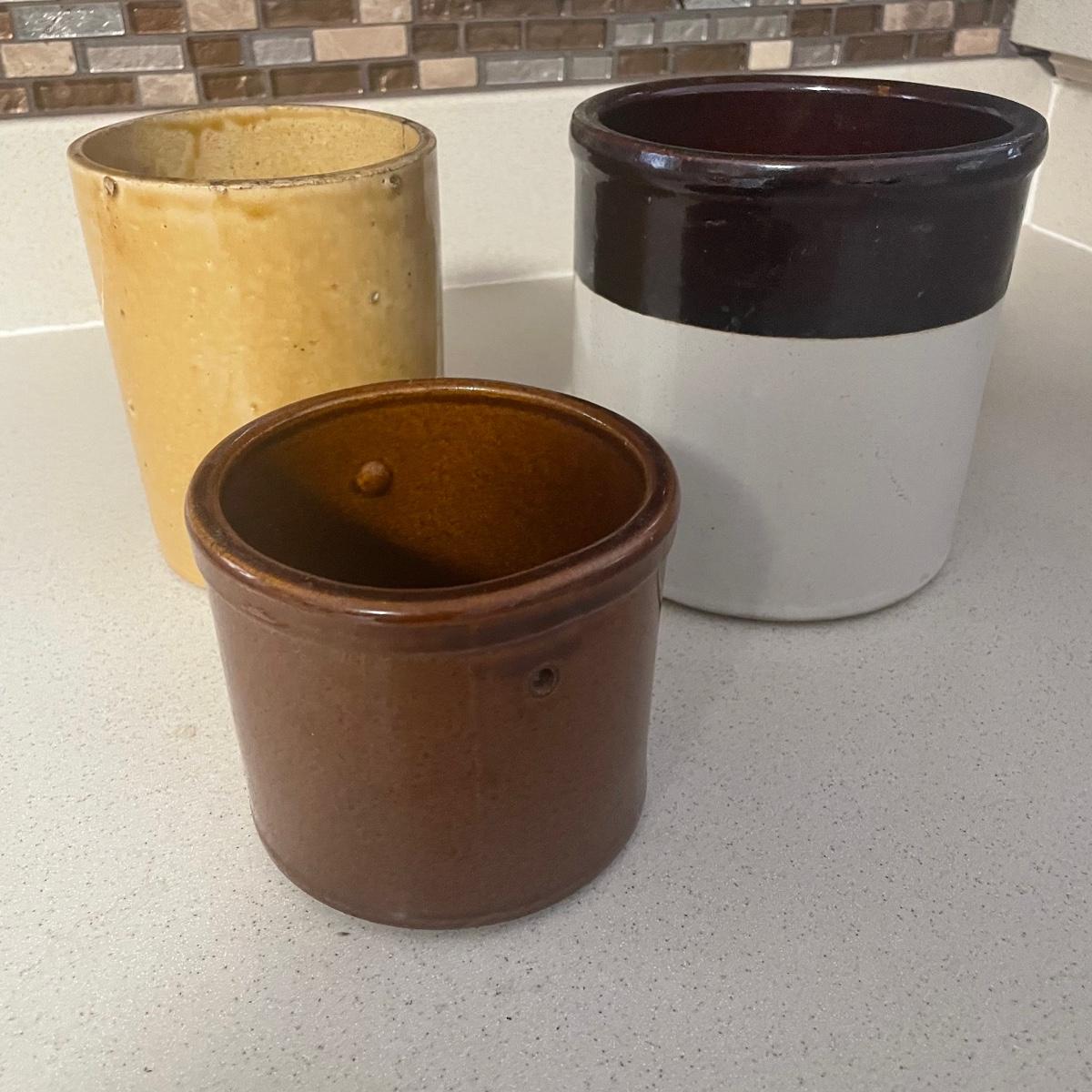 Three stoneware crocks here, the largest being a Robinson Ransbottom Pottery Co. from Roseville, Ohio. It measures 6” d x 6” tall. Two more crocks make up the remaining items.