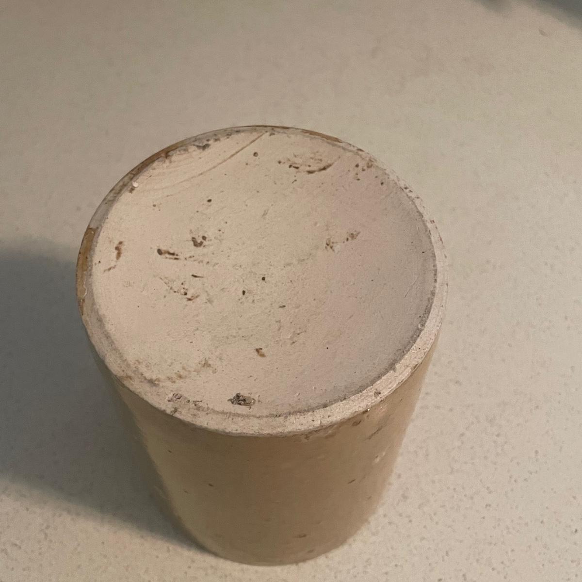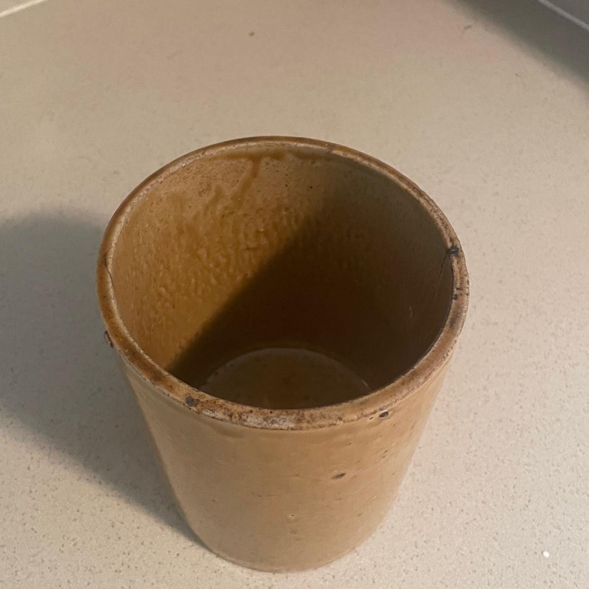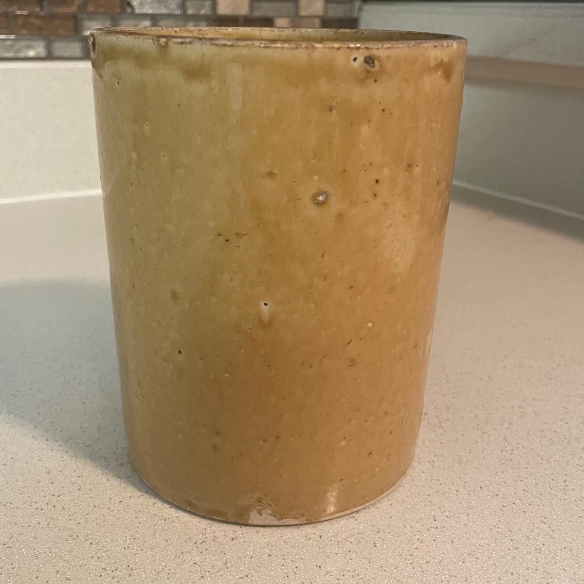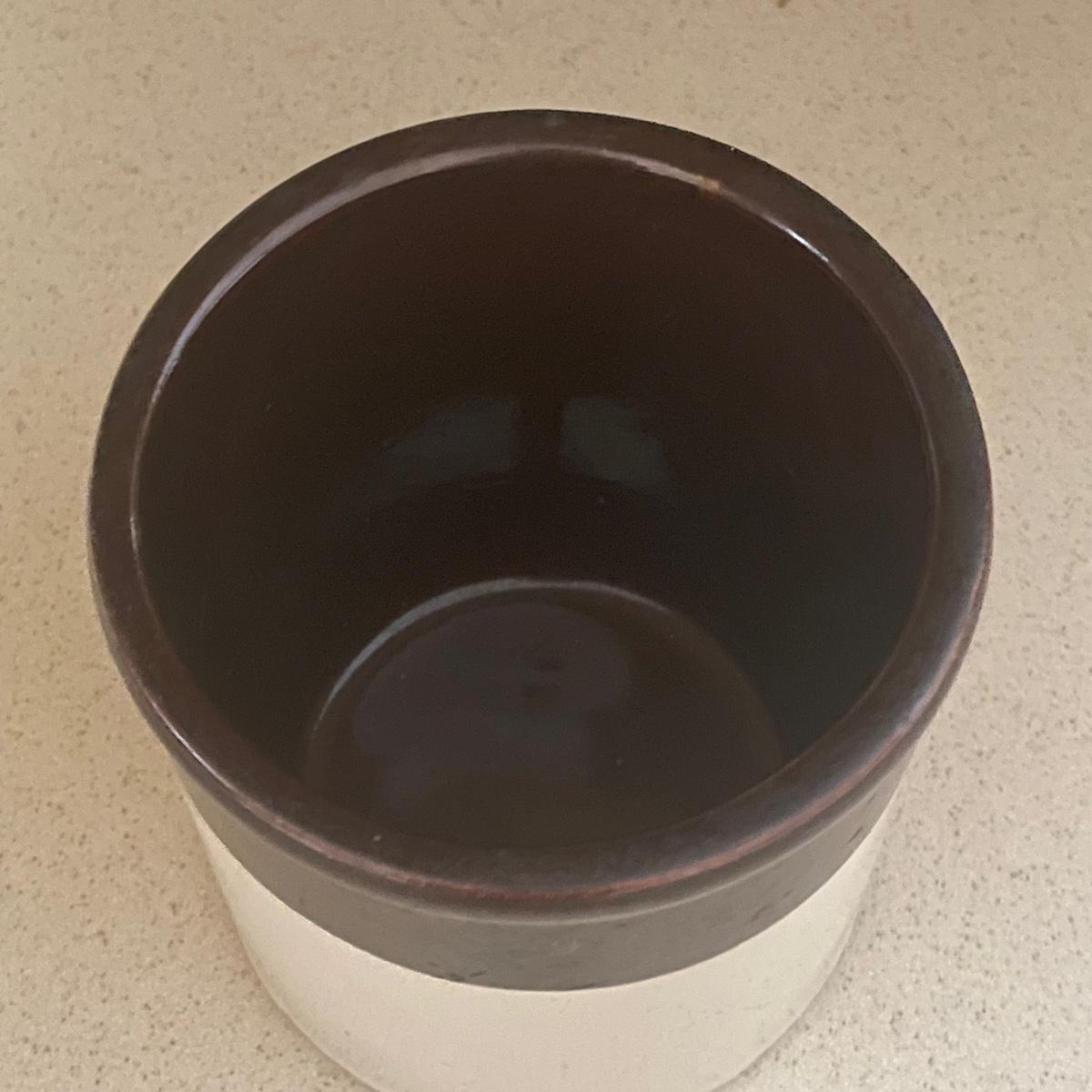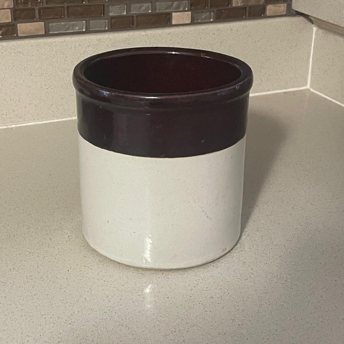 Three stoneware crocks here, the largest being a Robinson Ransbottom Pottery Co. from Roseville, Ohio. It measures 6” d x 6” tall. Two more crocks make up the remaining items.